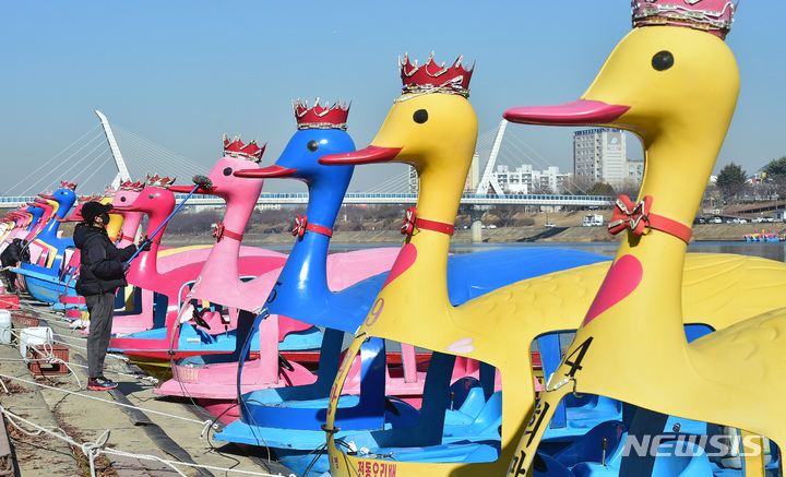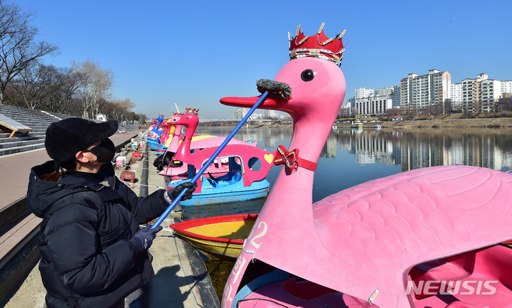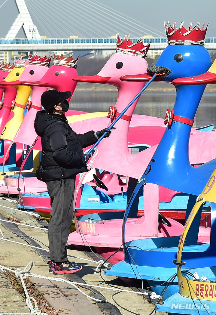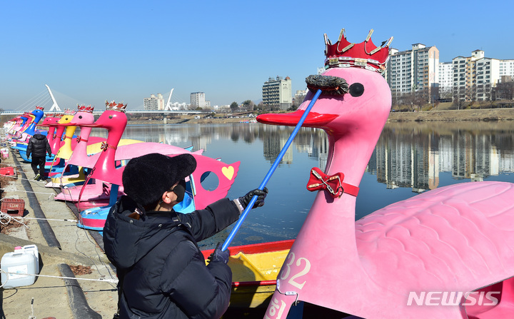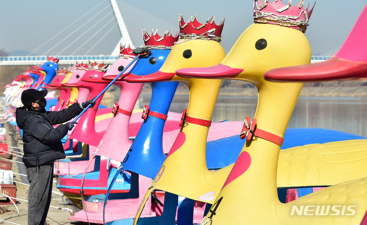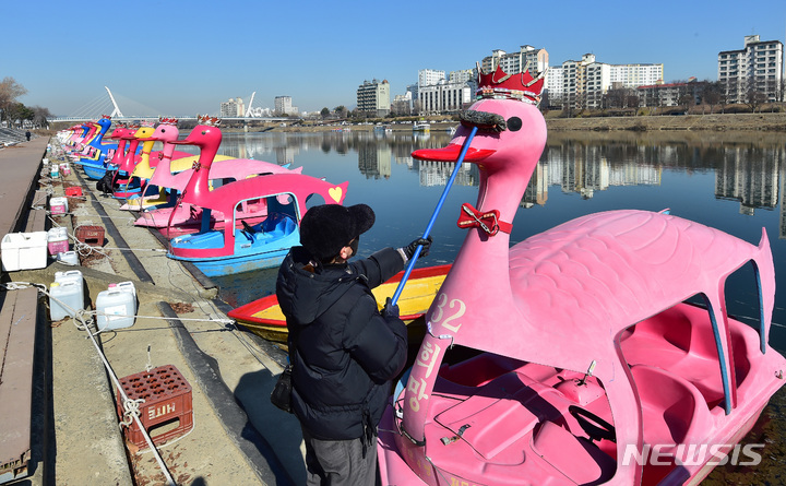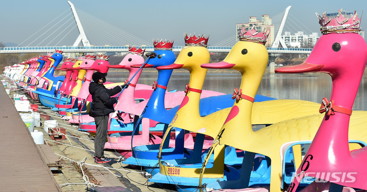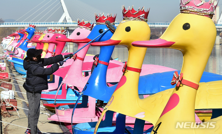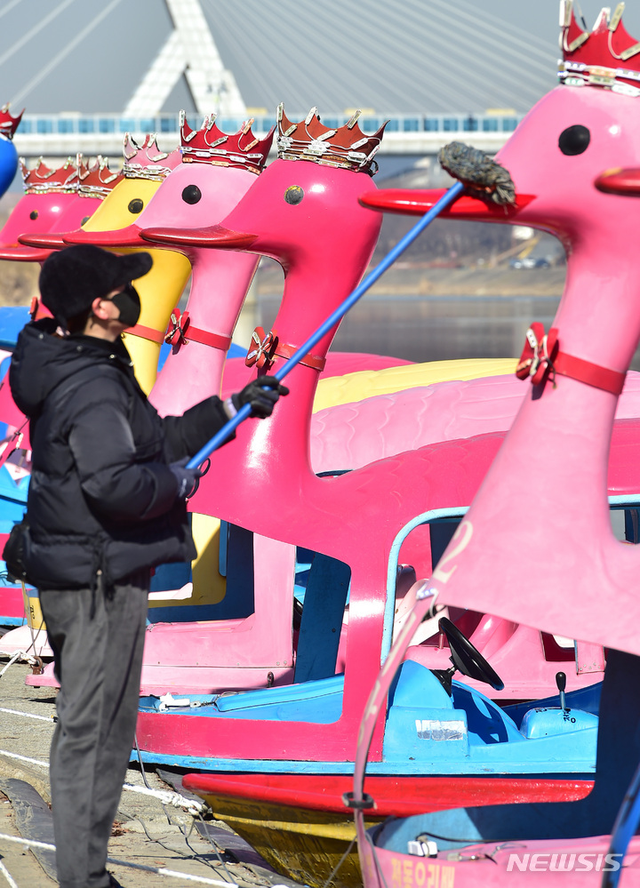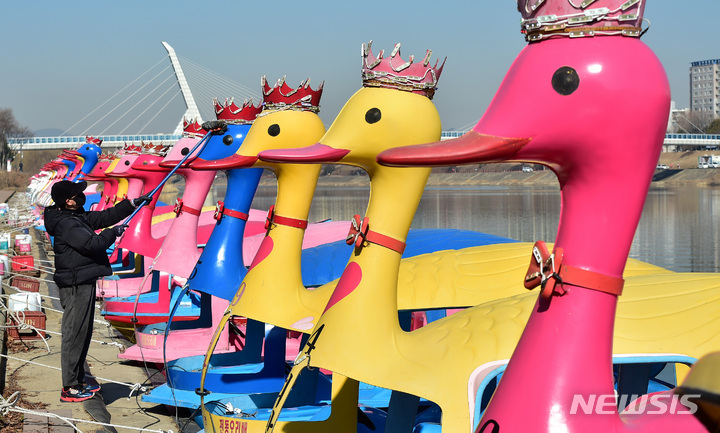 うららかな春の天気となった27日午前、大邱市東区にある東村遊園地のアヒルボート船着き場では、管理人が冬の間に溜まった汚れを落として客を迎える準備を進めていた。