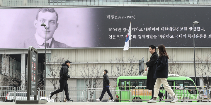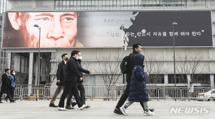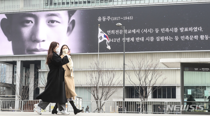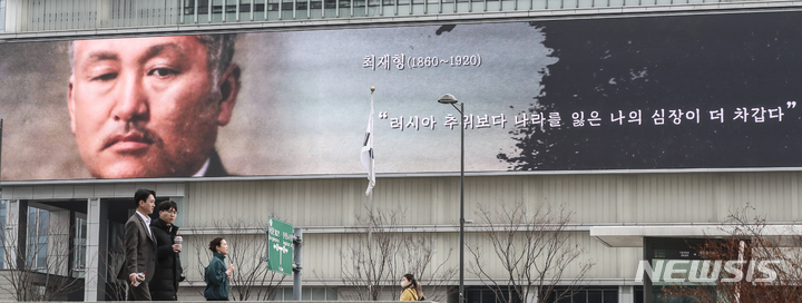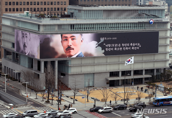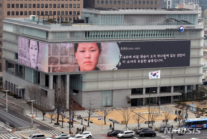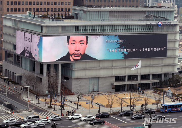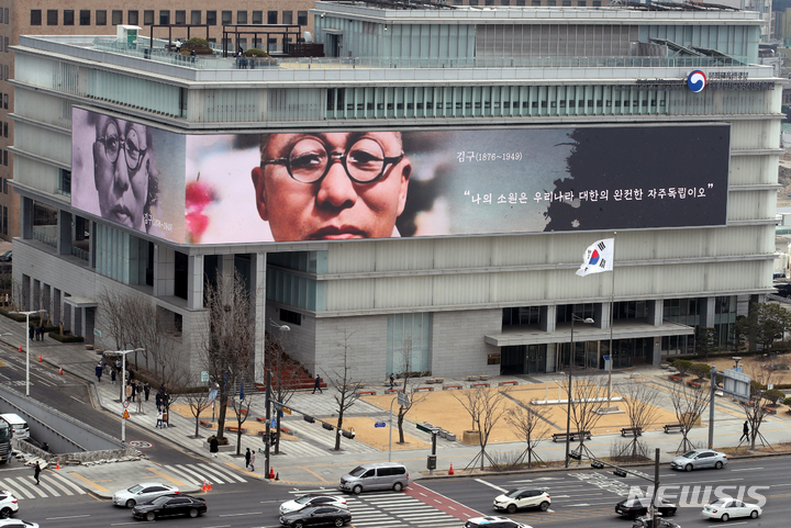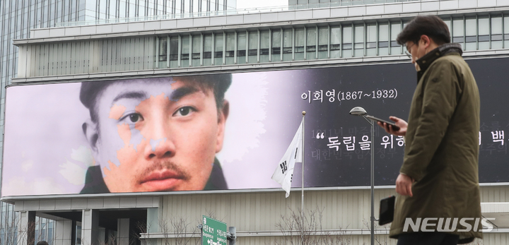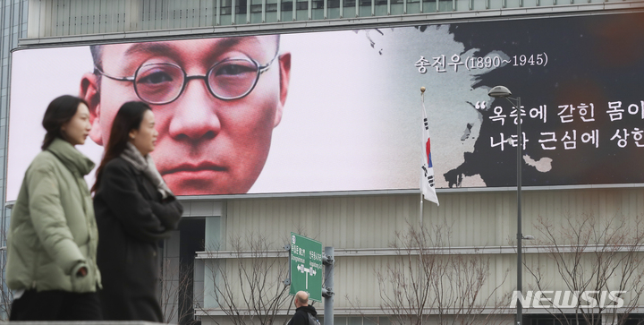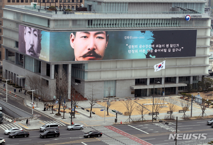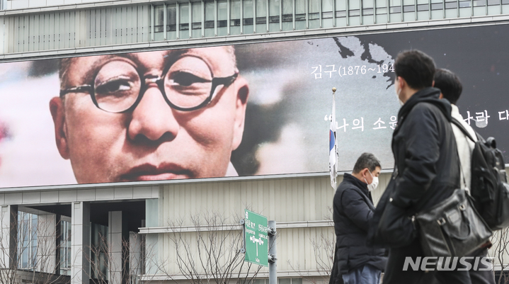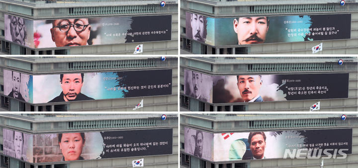 28日、光化門広場(ソウル市鍾路区)の大韓民国歴史博物館大型電光板(メディアキャンバス)に、金九(キム・グ)をはじめ金佐鎮(キム・ジャチン)、安重根(アン・ジュングン)、柳寛順(ユ・グァンスン)、尹奉吉(ユン・ボンギル)、李奉昌(イ・ボンチャン)、尹東柱(ユン・ドンジュ)など独立運動家15人のモノクロ写真を人工知能(AI)技術でカラー写真として復元した姿が映し出されている様子。