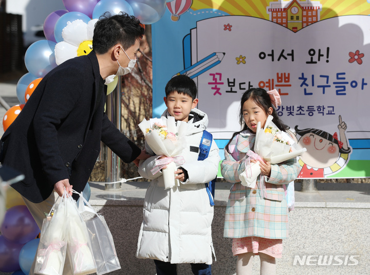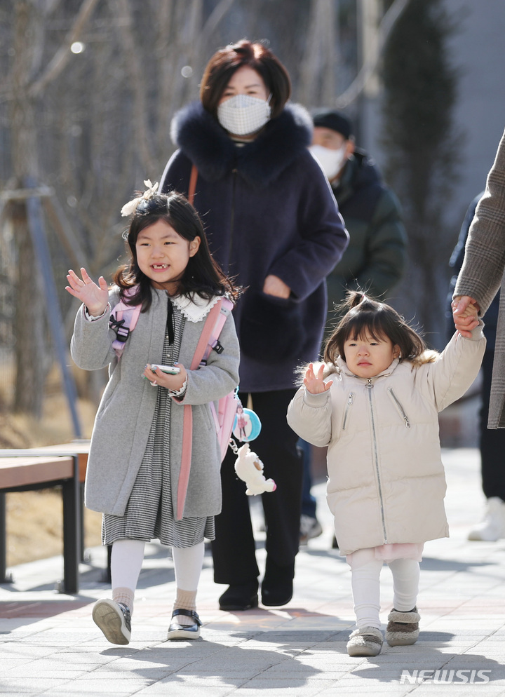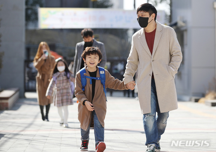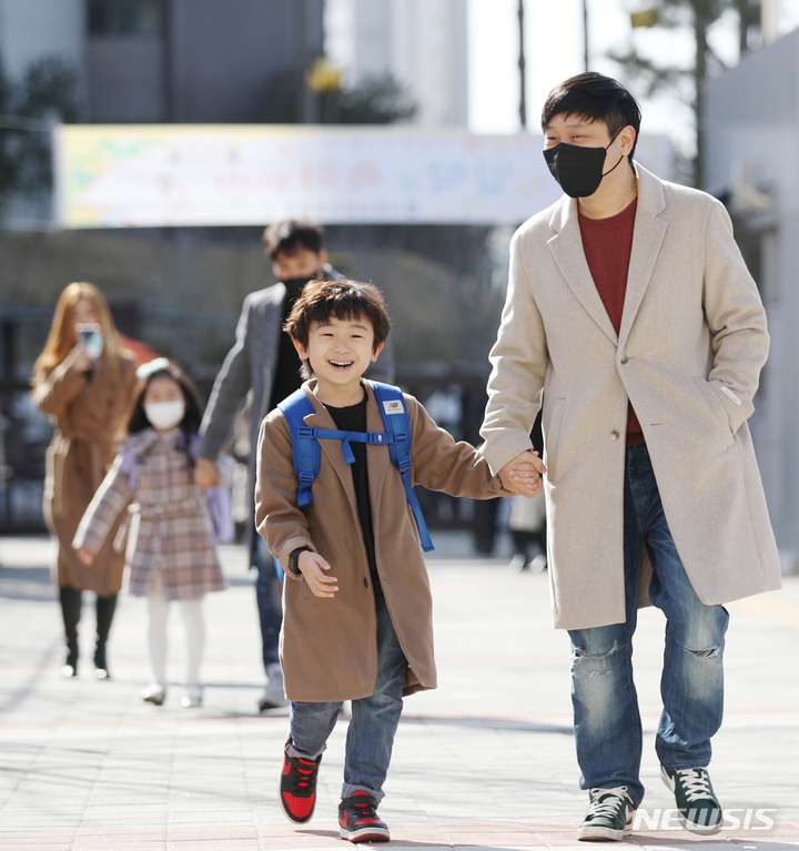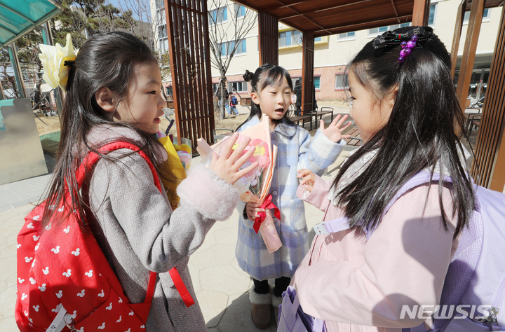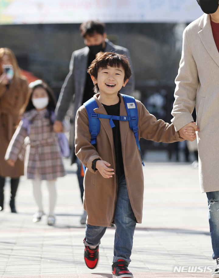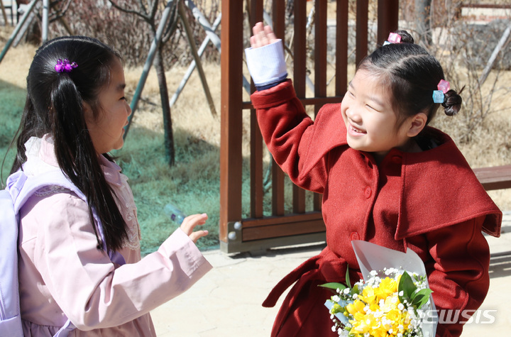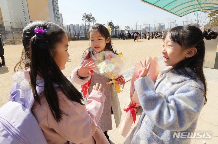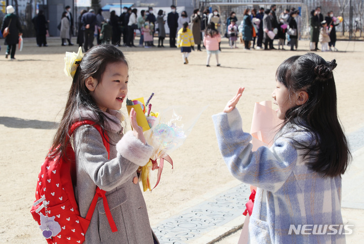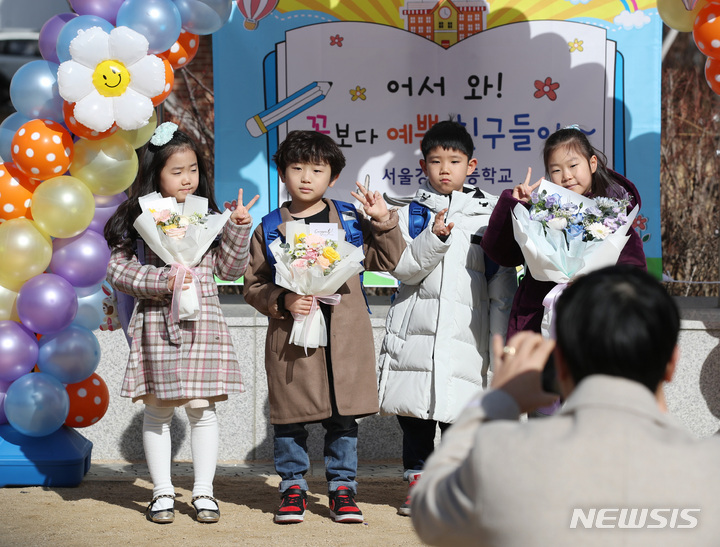 2日午前、ソウル市江東区のカンビッ小学校で、新入生の子どもたちが友だちと一緒に写真を撮っている様子。