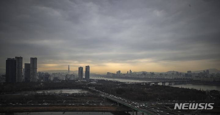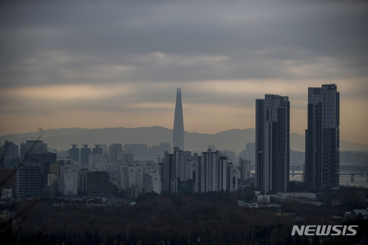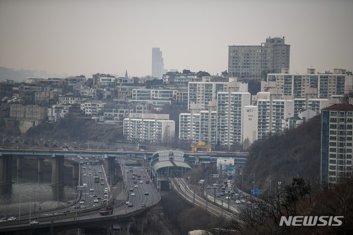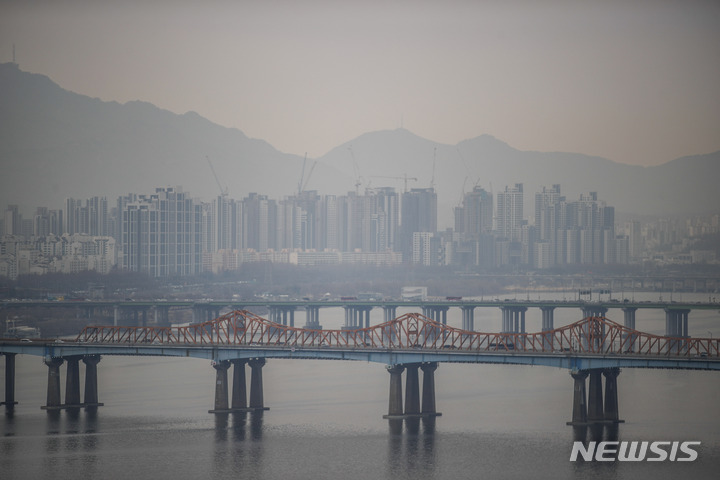 【NEWSIS】首都圏のPM2.5などの微小粒子状物質濃度が「不良」となった7日午前、ソウル市城東区の鷹峰山から眺めたソウル市内はかすんでいた。