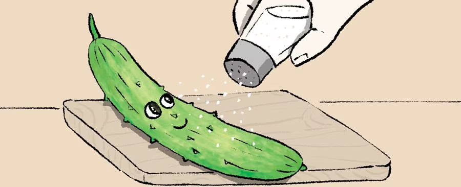 キュウリの残留農薬が心配なら、塩を使ってみよう。キュウリを塩で数回もんでから水で洗うときれいになる。