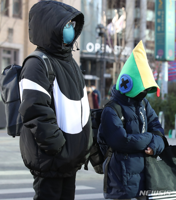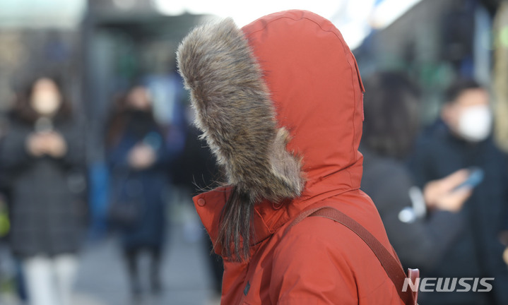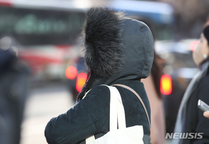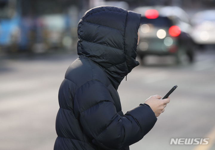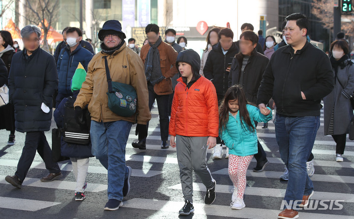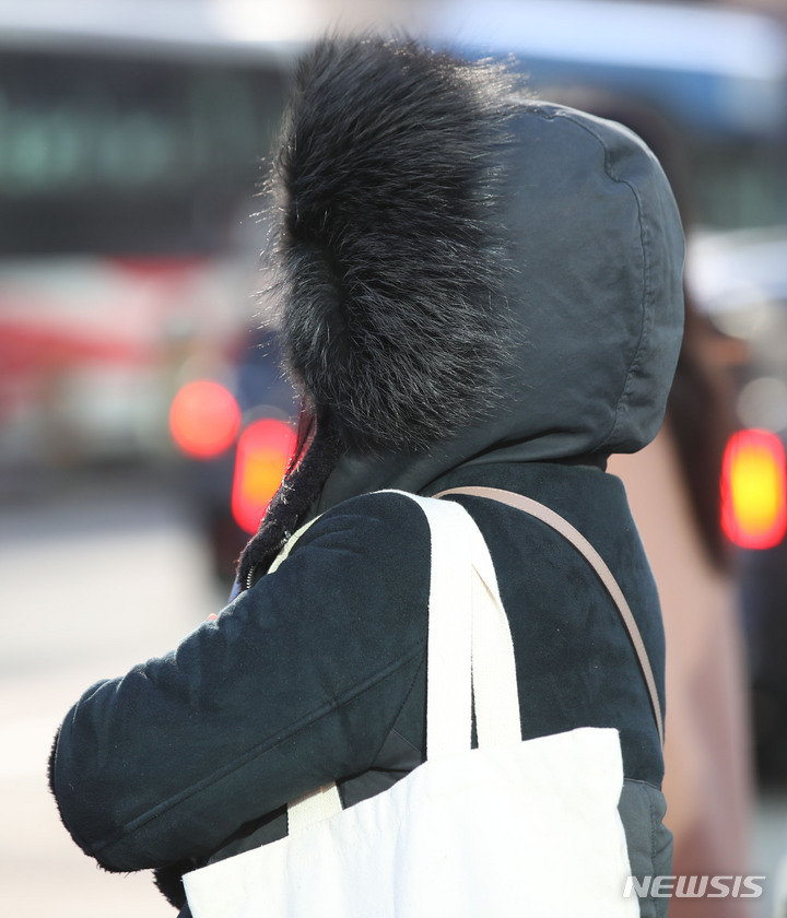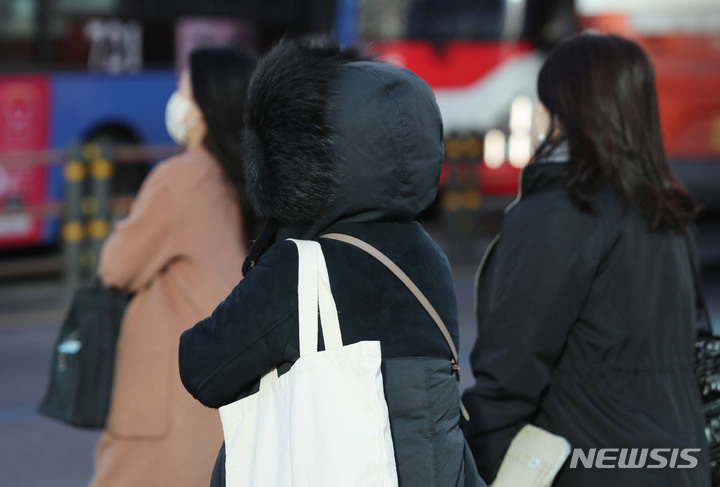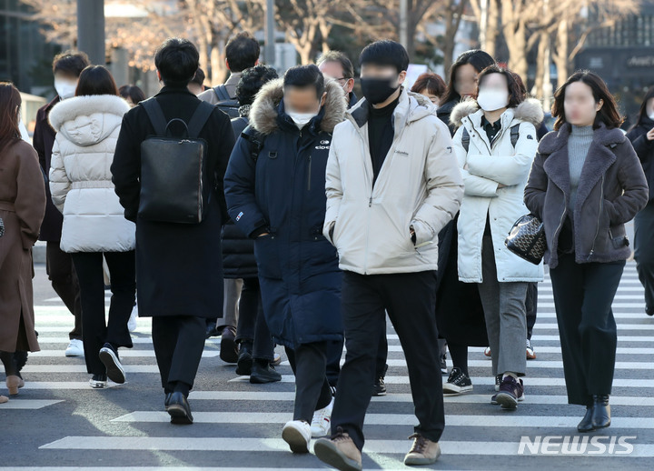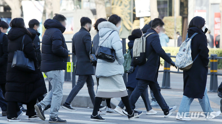 【NEWSIS】花冷えで3月中旬にもかかわらず全国の朝の気温が氷点下となった13日、ソウル・世宗路交差点を厚手の上着姿で行き交う人々。
