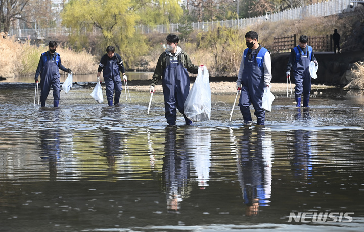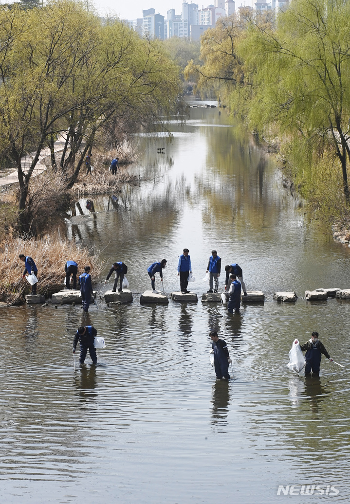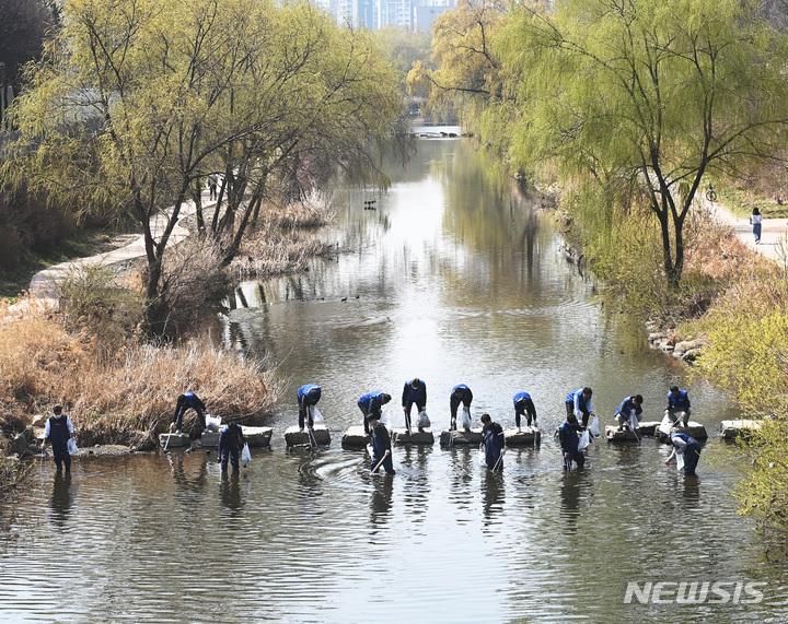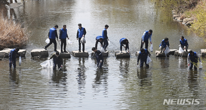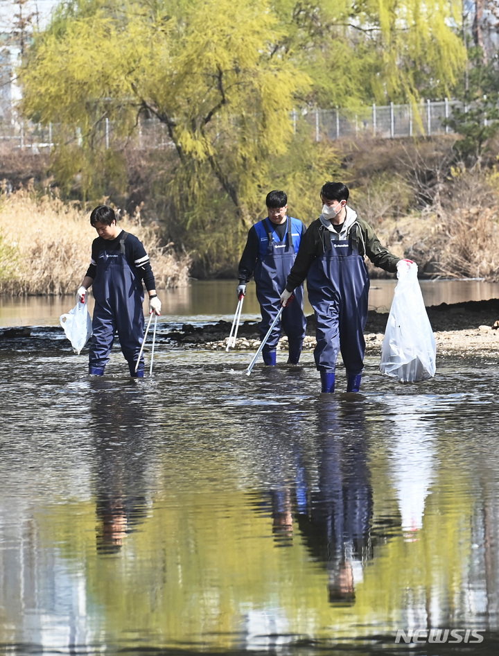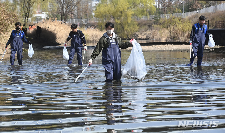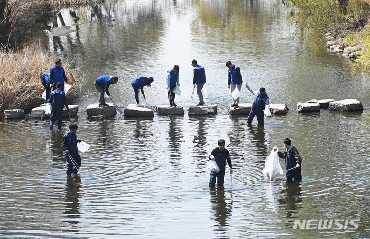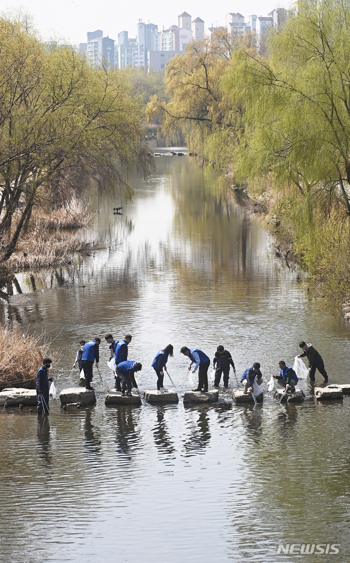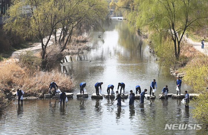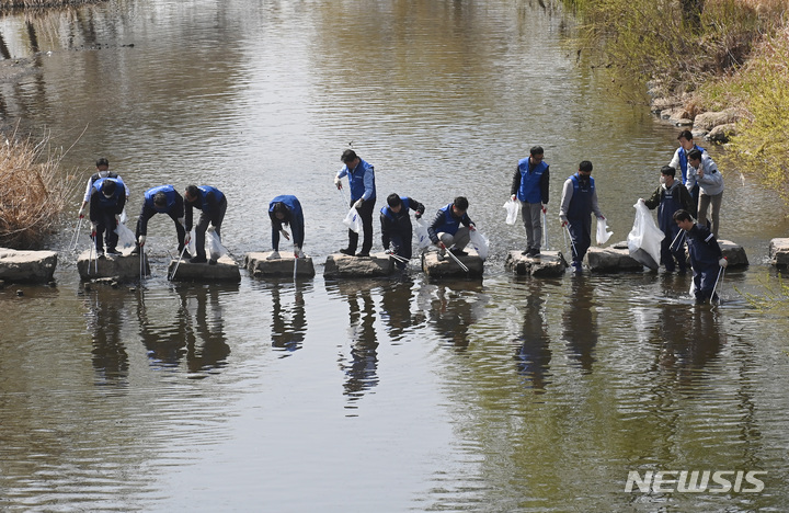 世界水の日をあすに控えた21日、京畿道水原市霊通区の遠川川で、サムスン電子の社員らが河川浄化活動を行っている様子。