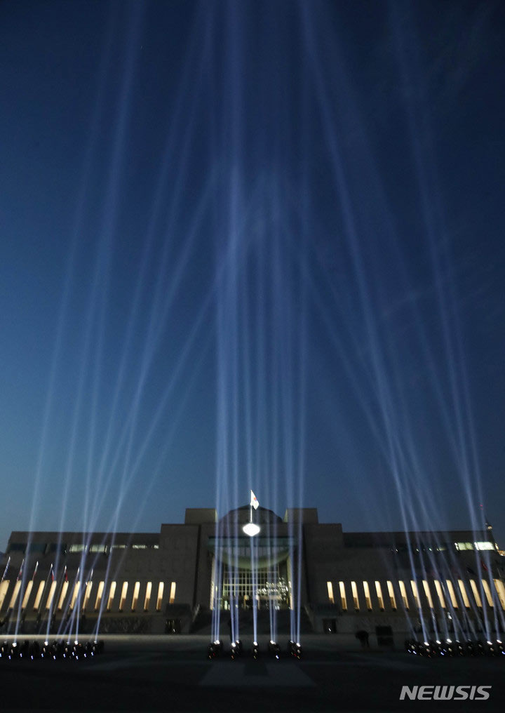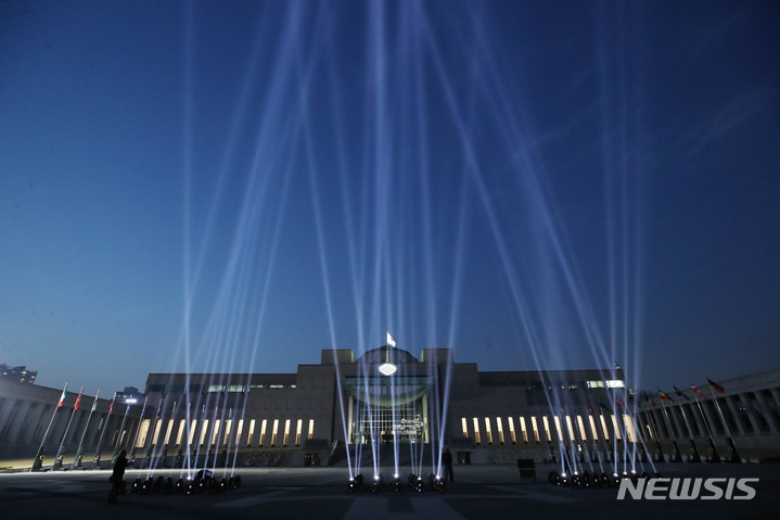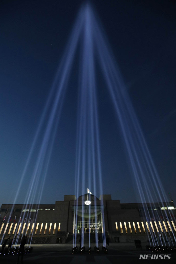 【NEWSIS】「第8回西海(黄海)守護の日」の三日前だった21日、ソウル市竜山区の戦争記念館で、第2延坪海戦・韓国海軍哨戒艦「天安」爆破沈没事件・延坪島砲撃事件で犠牲になった「西海守護55勇士」を追悼する「不滅の光」が事前に点灯された。国家報勲処は22日から24日までの夜8時から55分間、戦争記念館に西海守護戦死者55勇士を象徴する55本の照明と、3つの事件を意味する3本の太い光の柱からなる「不滅の光」を点灯する。