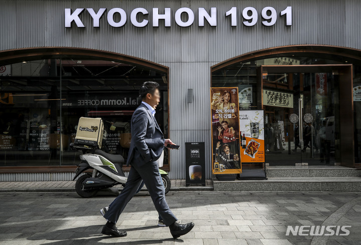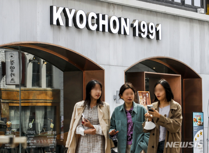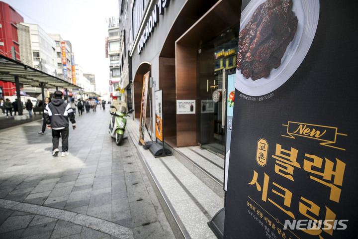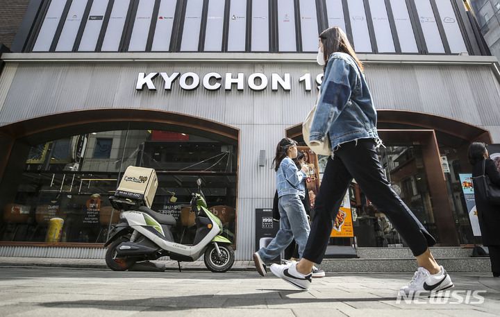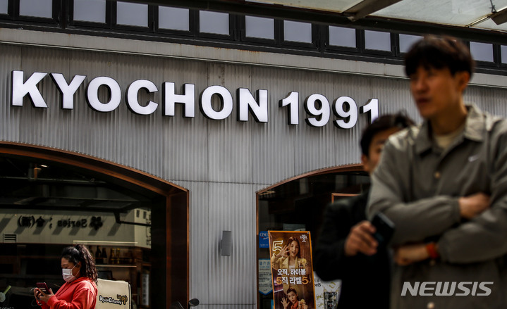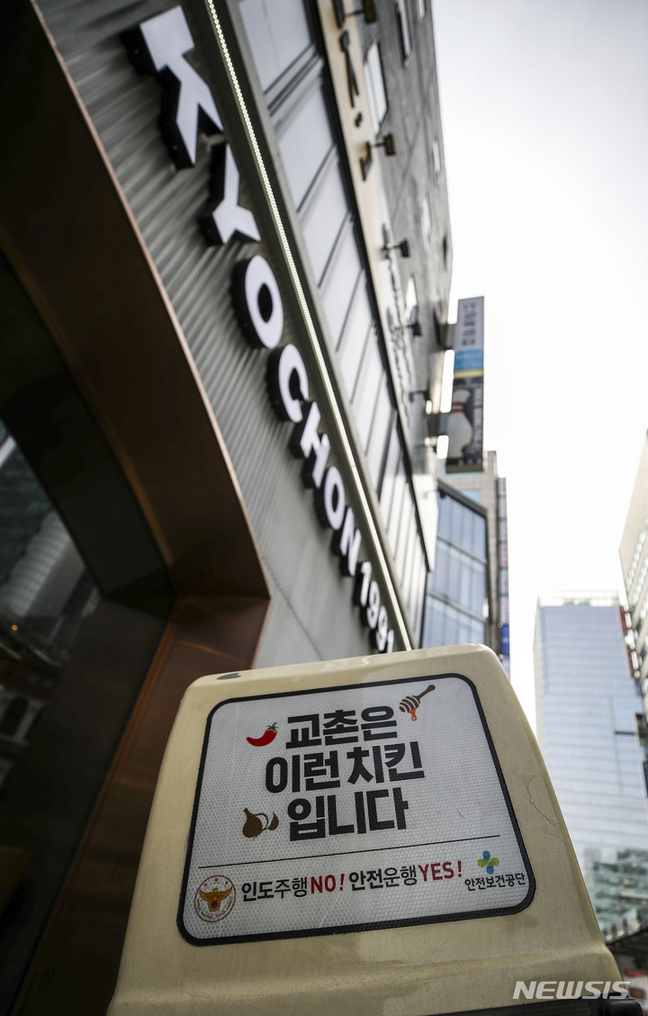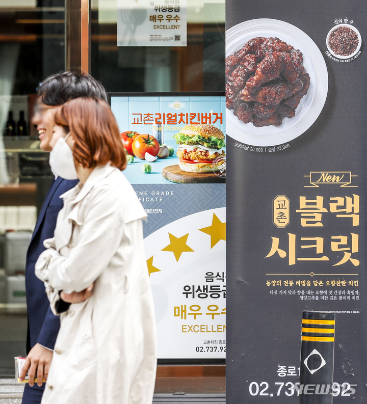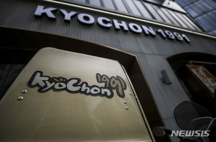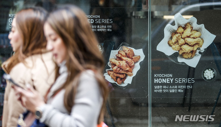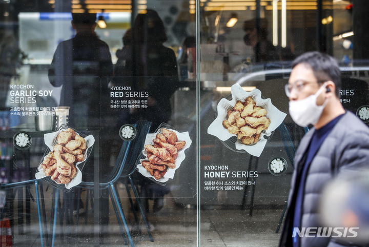 チキン店「Kyochonチキン」を展開するKyochon F&Bは、4月3日から希望小売価格を品目別に500ウォン(約50円)から最大で3000ウォン(約303円)引き上げると発表した。主な1羽および各部位別メニューは3000ウォン値上げする。そのほかのメニューは、サイズや既存の価格帯により500ウォンから2500ウォン(約252円)上がる。ブラックシークレットなど一部新商品は、価格調整を行わない。写真は24日、ソウル市内のKyochonチキンの様子。