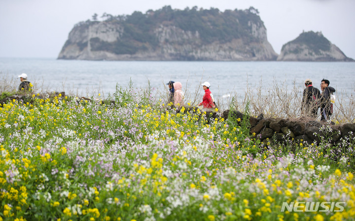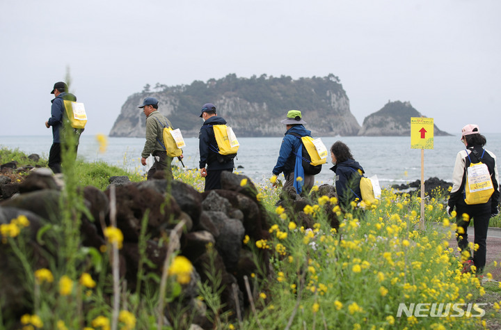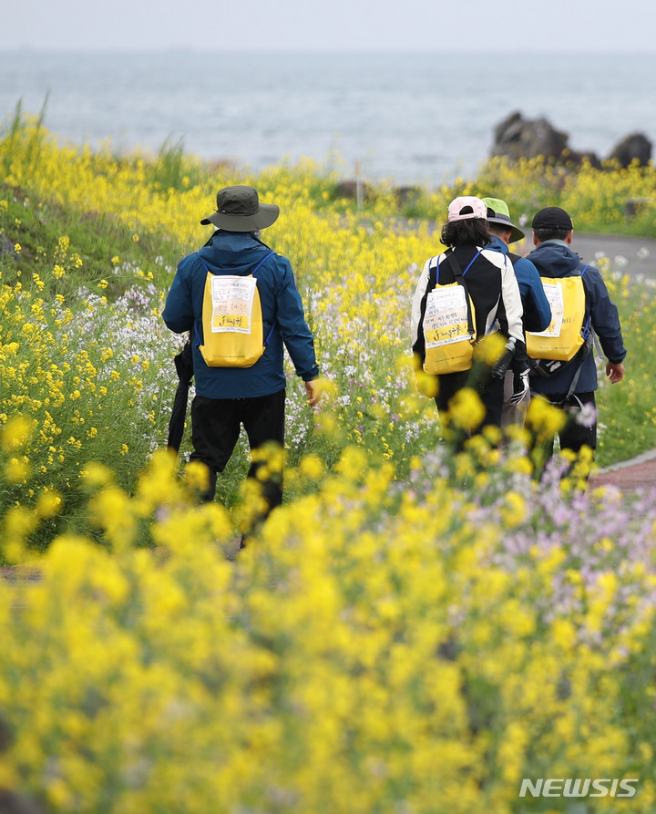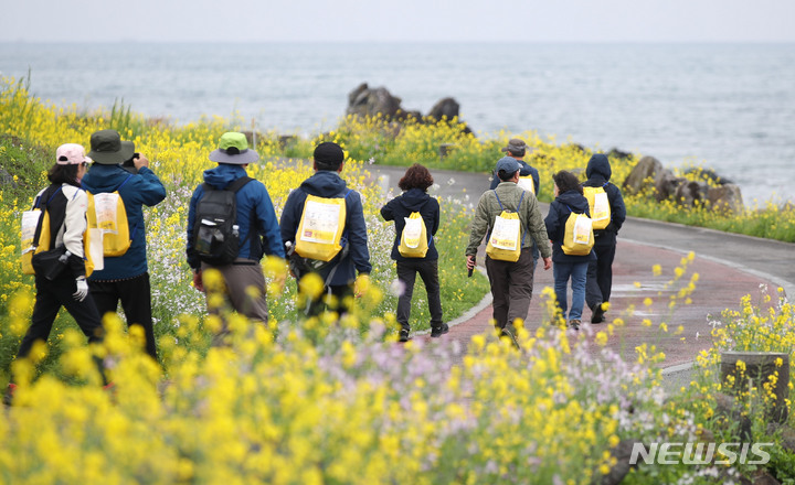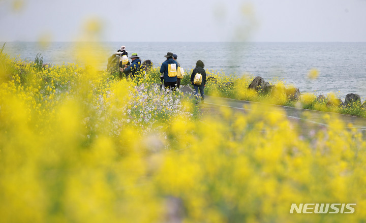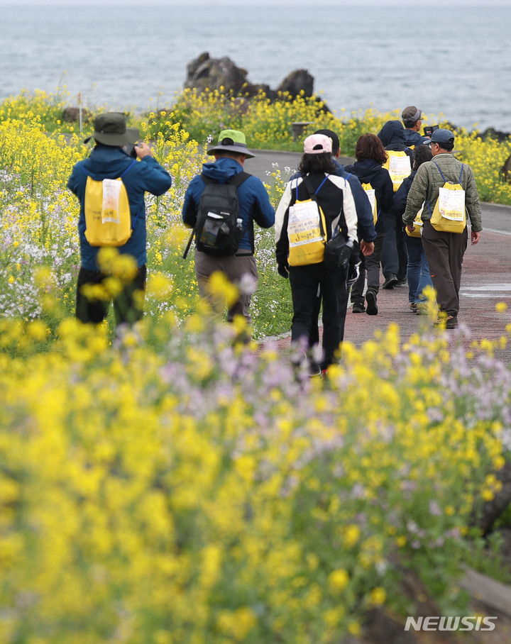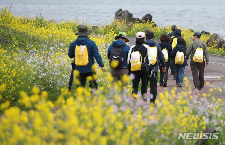 第25回西帰浦菜の花国際ウォーキング大会が開催された25日午前、参加者たちが済州道西帰浦市の海岸道路を歩きながら、春らしい雰囲気を満喫していた。