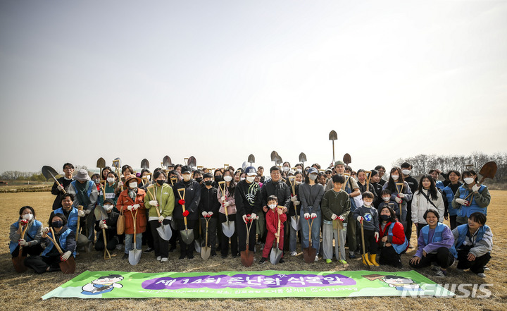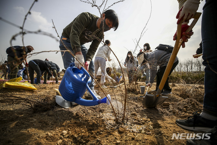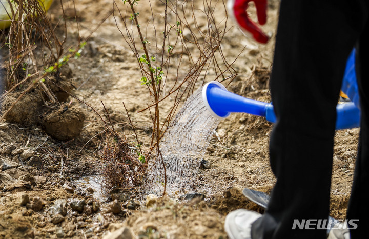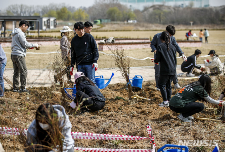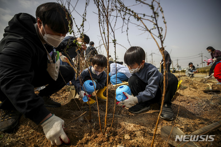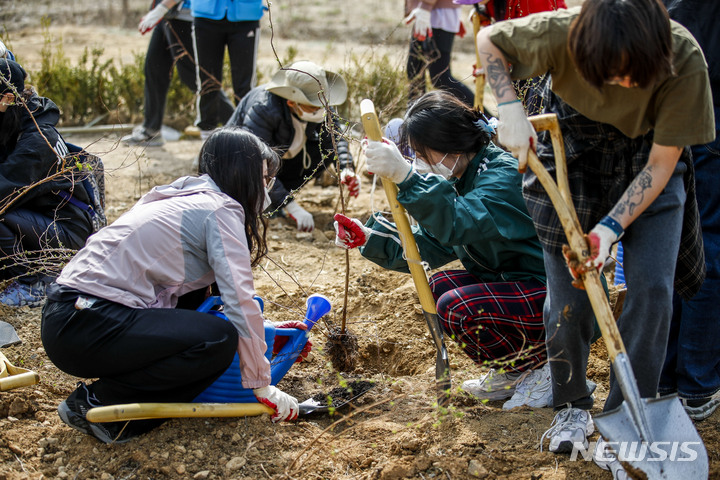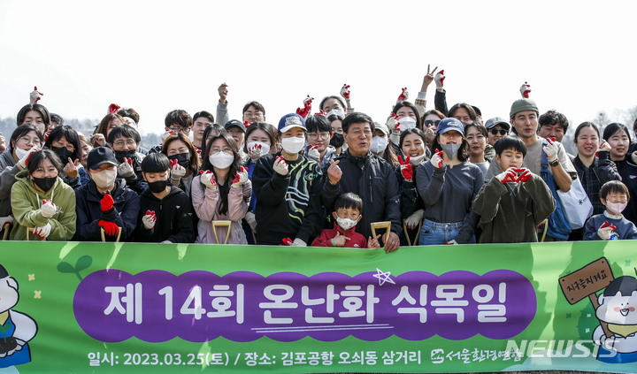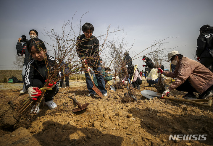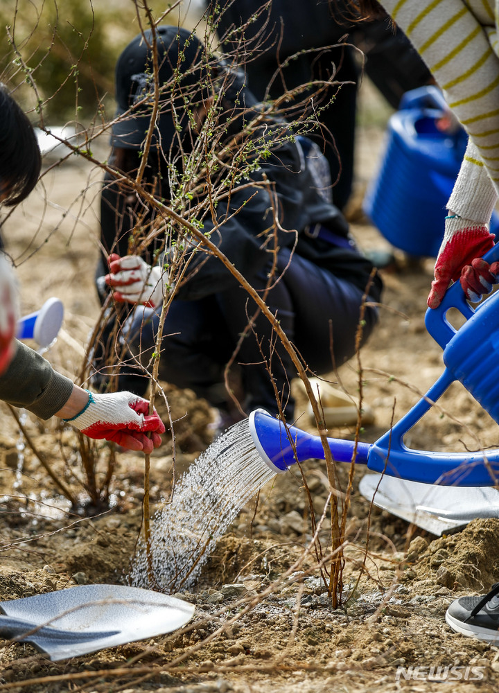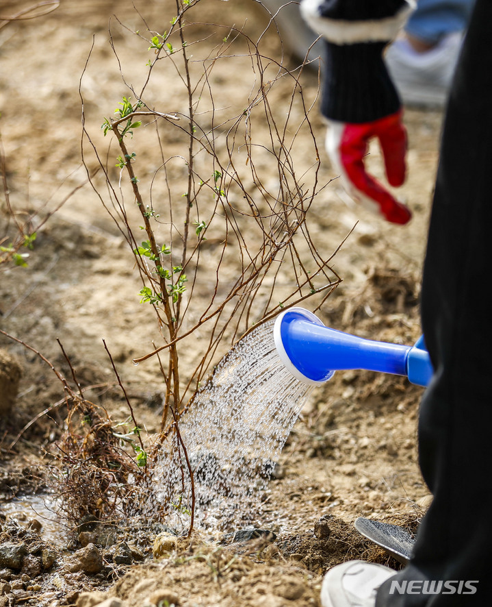 ソウル市江西区の五釗交差点付近で25日午前、第14回温暖化植樹の日イベントが開催され、ソウル環境連合の活動家や参加者たちがユキヤナギの木を植えた。