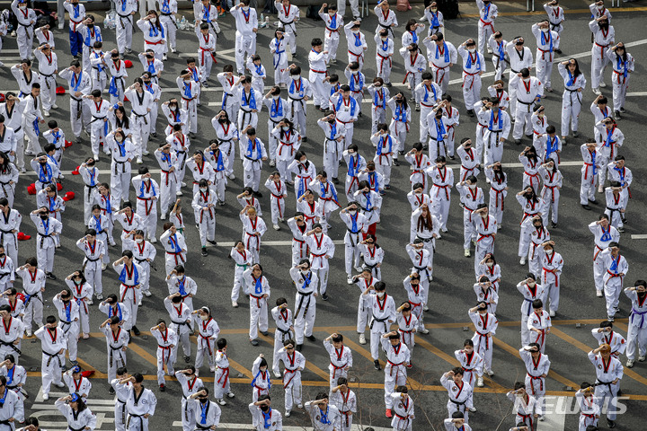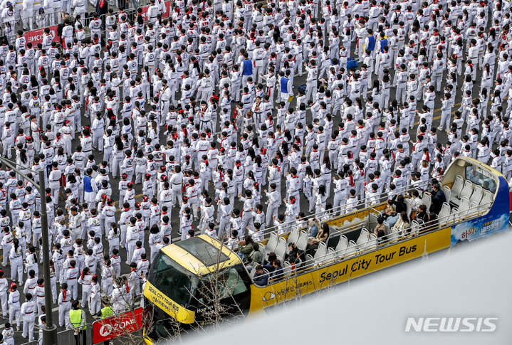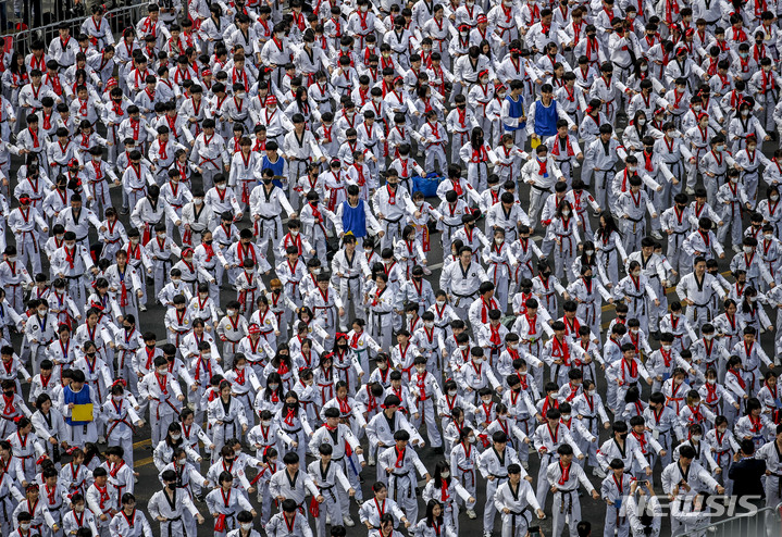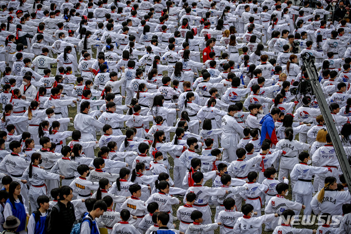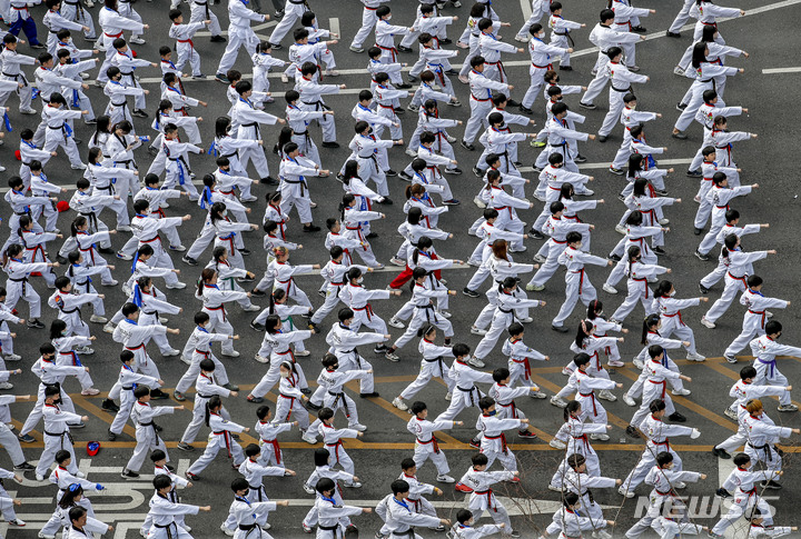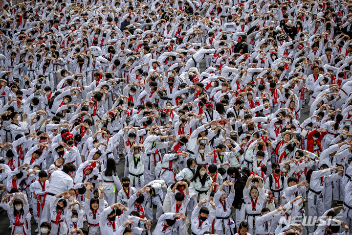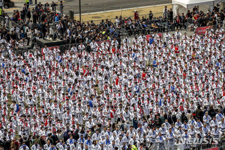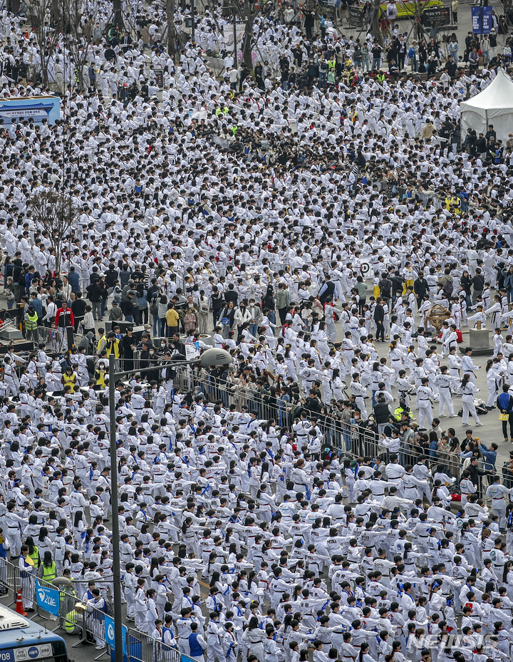 25日、ソウル市鍾路区の光化門広場で開かれた「『国技』テコンドー ハンマウム祭り」にて、およそ1万2000人の参加者らが同時に太極1章の型を披露するギネス記録に挑戦しているところ。今回のイベントは、テコンドー国技指定5周年に合わせて行われた。