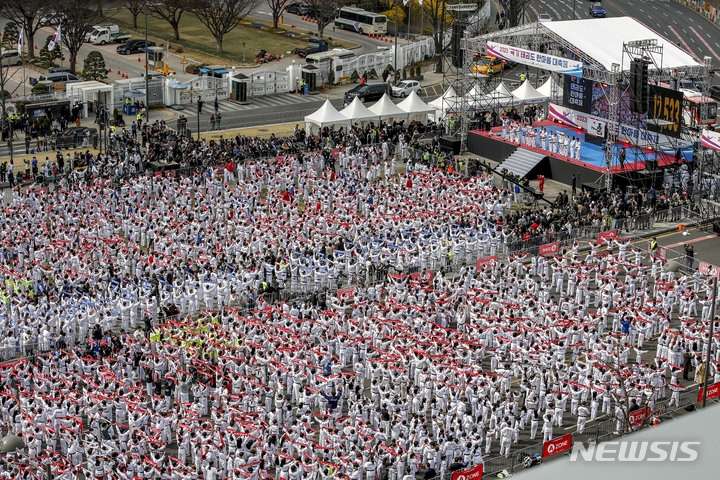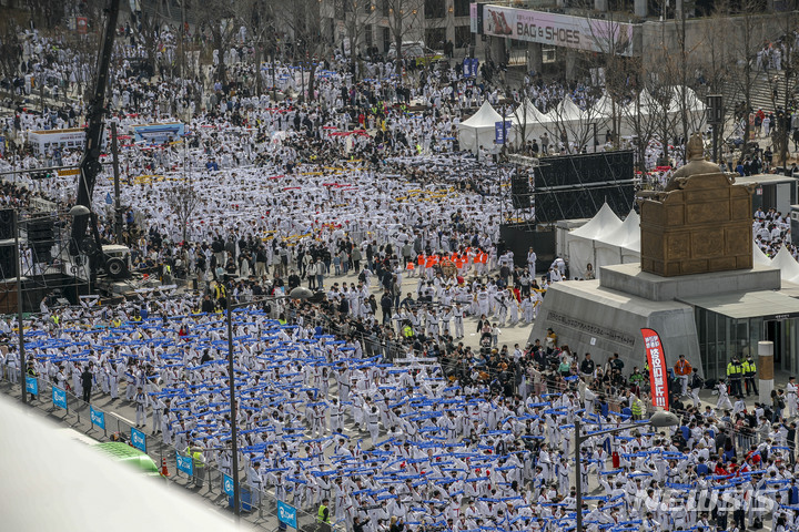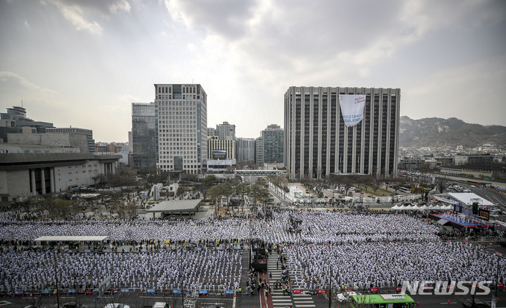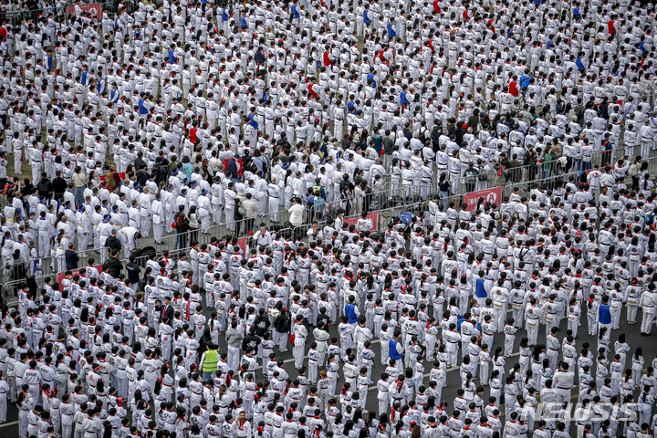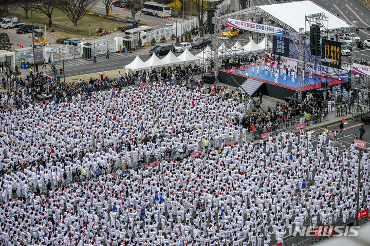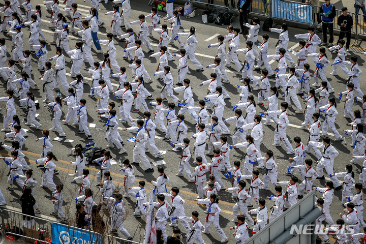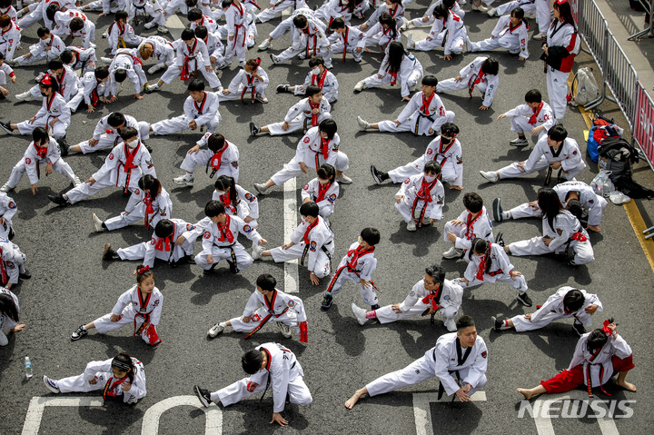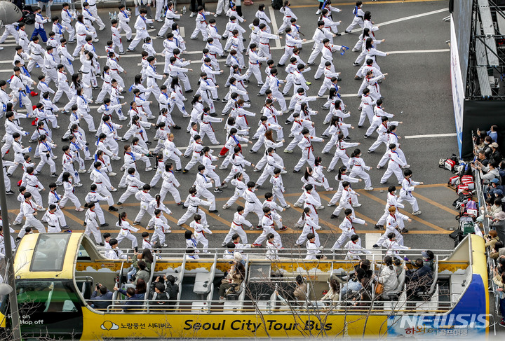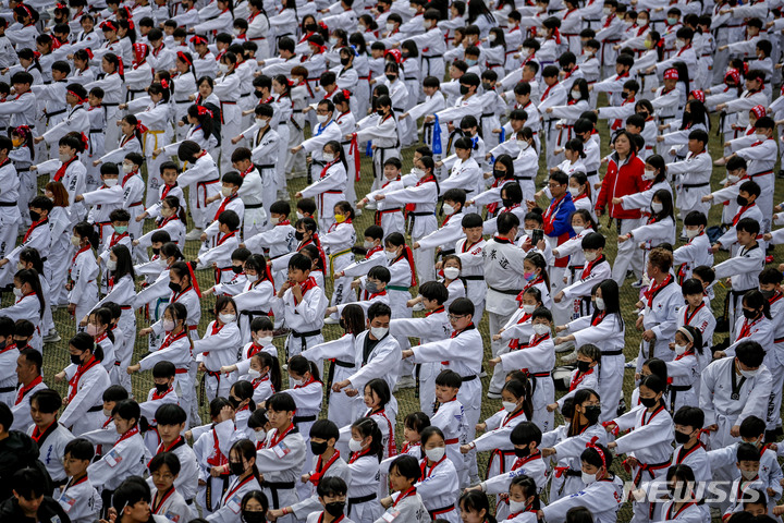 25日、ソウル市鍾路区の光化門広場で開かれた「『国技』テコンドー ハンマウム祭り」にて、およそ1万2000人の参加者らが同時に太極1章の型を披露するギネス記録に挑戦しているところ。今回のイベントは、テコンドー国技指定5周年に合わせて行われた。