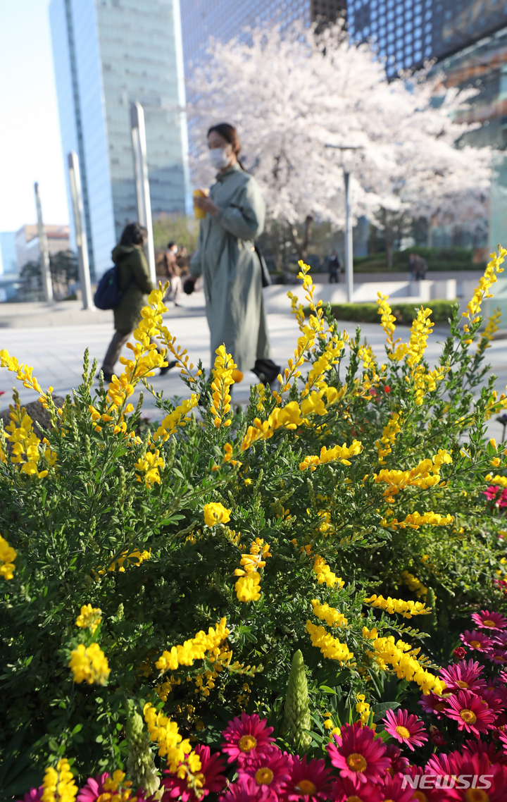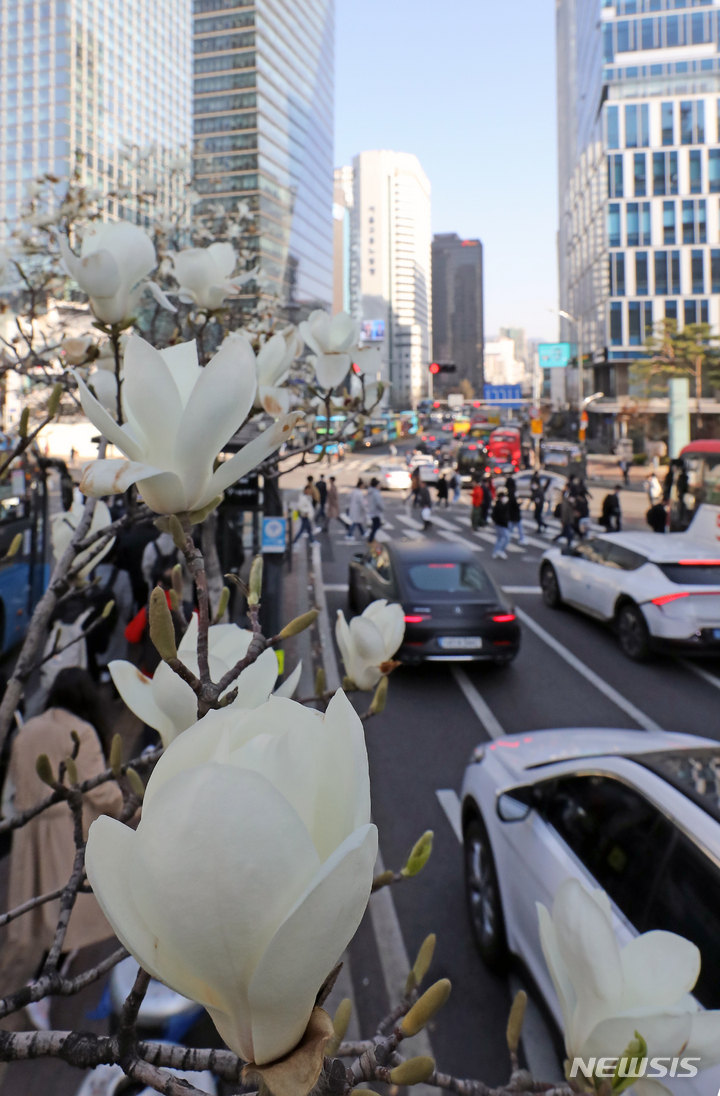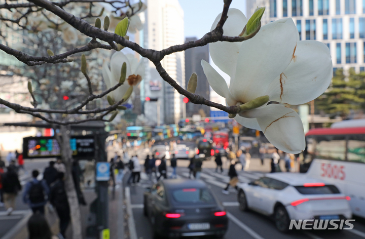 【NEWSIS】花冷えとなった27日午前、ソウル市中区の明洞聖堂交差点にはモクレンの花が咲いていた。