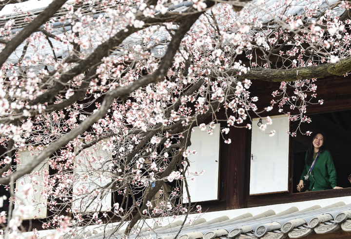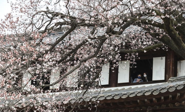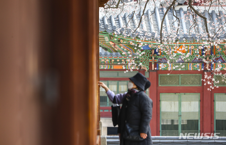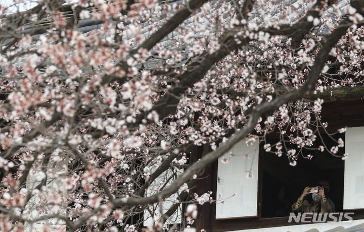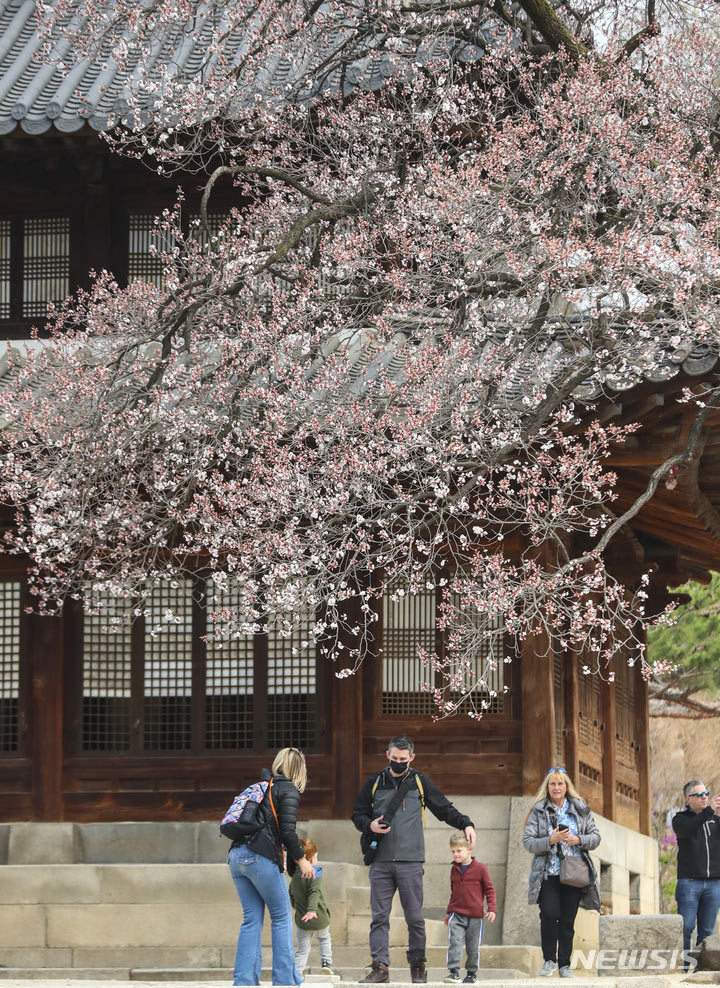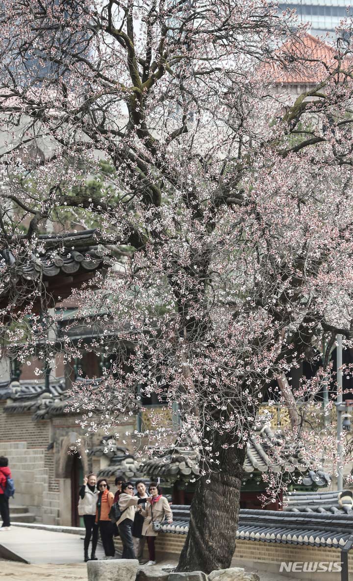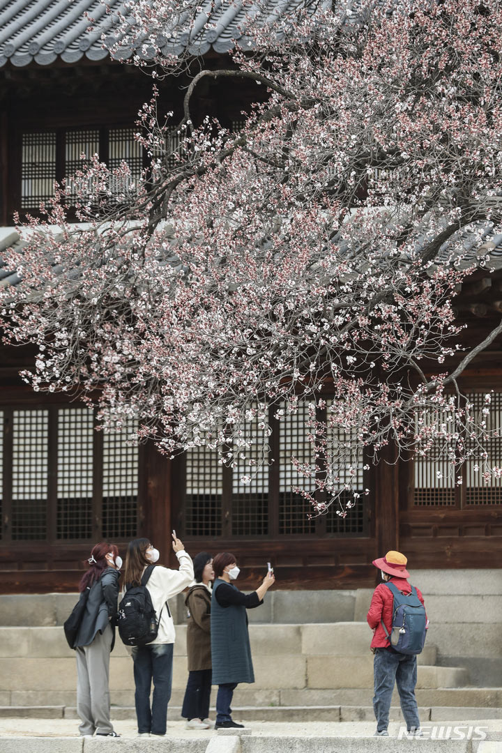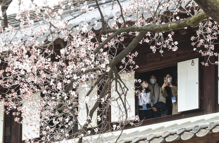 徳寿宮(ソウル市中区)の昔御堂で28日、観光客がアンズの花を眺めていた。
