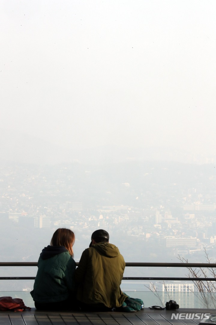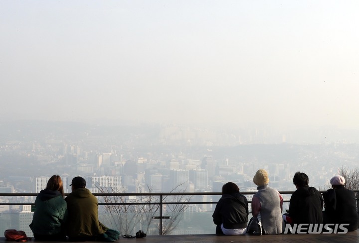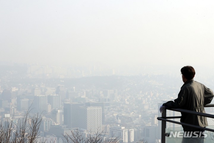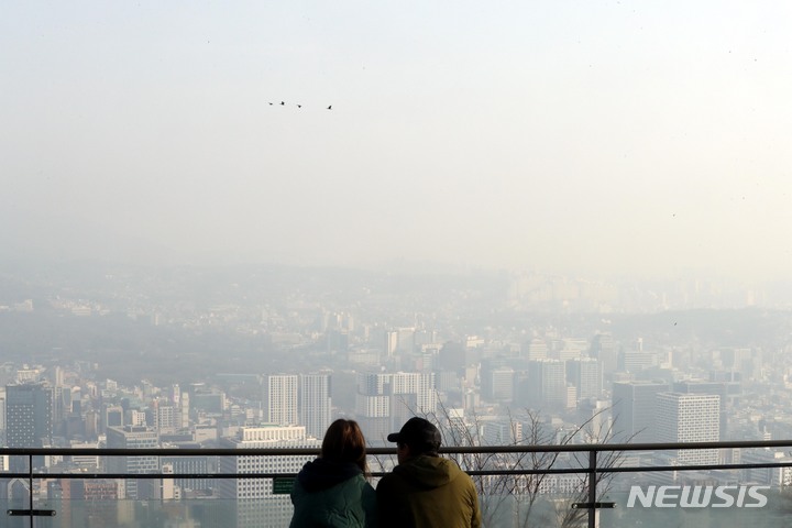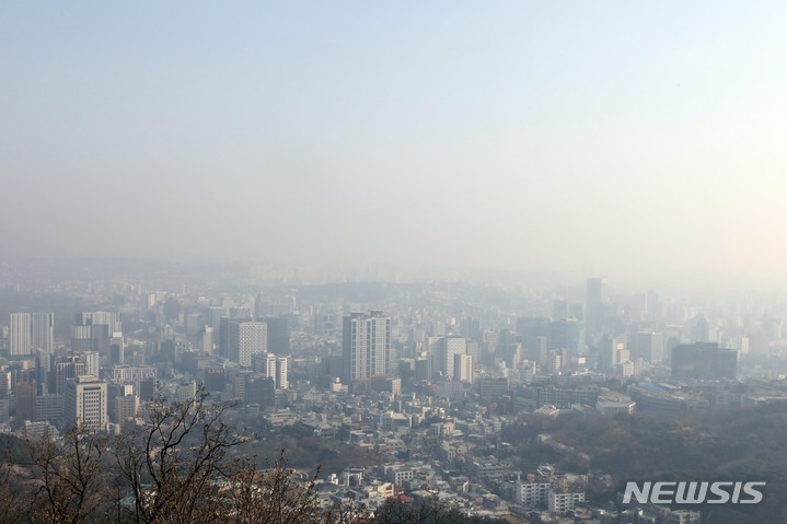 【NEWSIS】PM2.5などの微小粒子状物質の濃度が「不良」となった29日午前、ソウル市竜山区の南山公園から見たソウル中心部はかすんでいた。