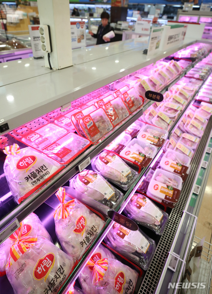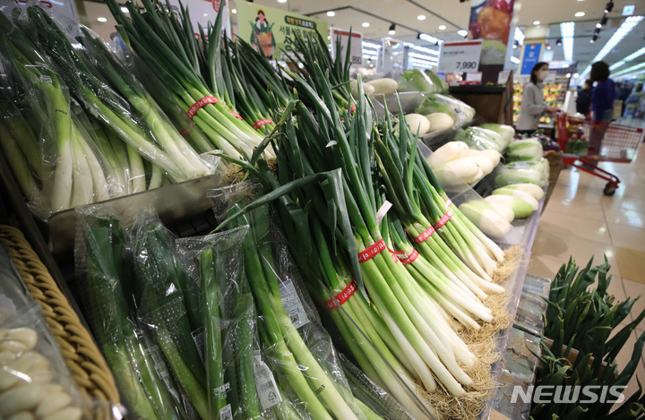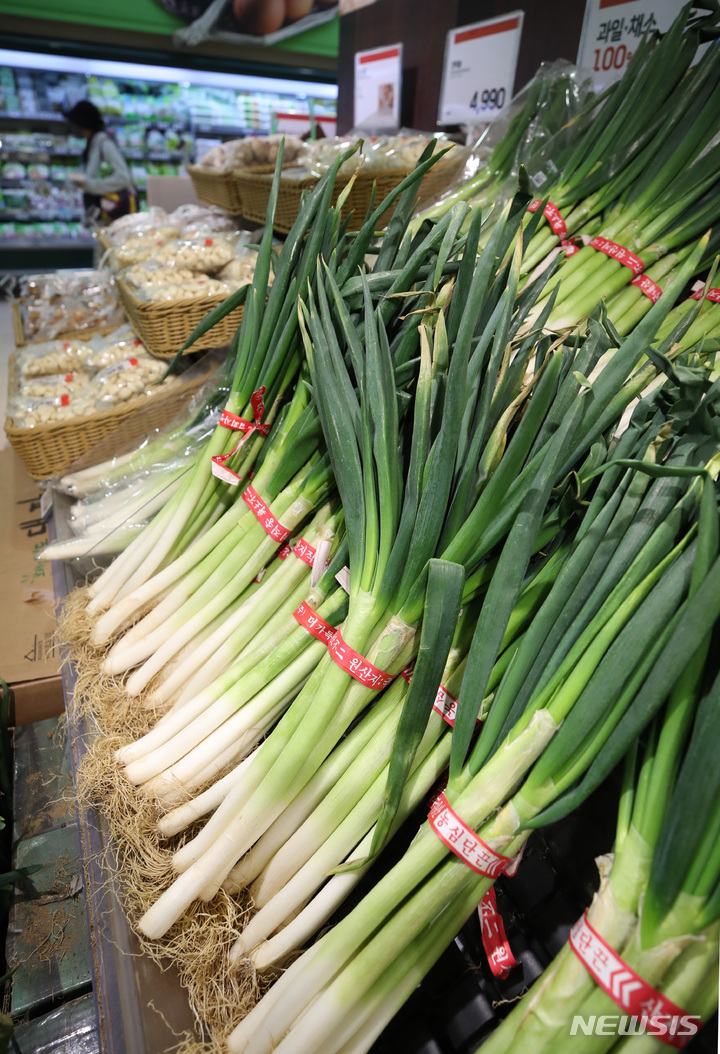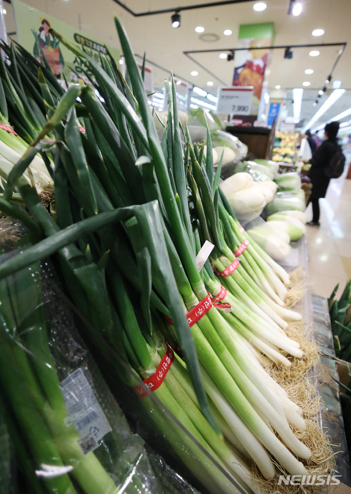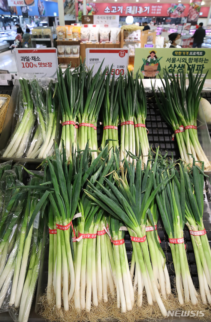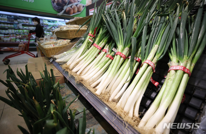 韓国政府は29日、庶民の買い物負担を減らすため農・畜・水産物に対する割引を支援し、7品目については関税率を引き下げることとした。最近価格が高騰した7品目については、5月から関税率も引き下げる。具体的には鶏肉、チップス用のジャガイモ、ネギ、ダイコン、繁殖用カモおよび卵などは割当関税を適用し、スケトウダラと冷凍サンマは調整関税から除外する。写真は29日、ソウル市内のスーパーで販売されているネギの様子。