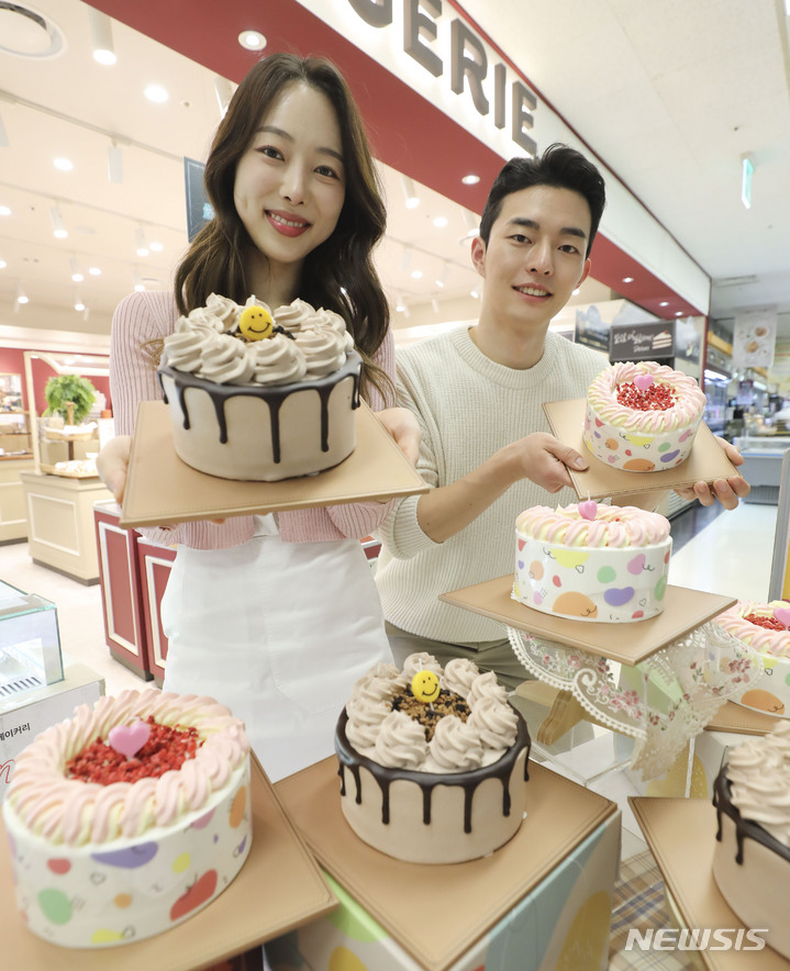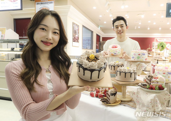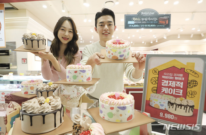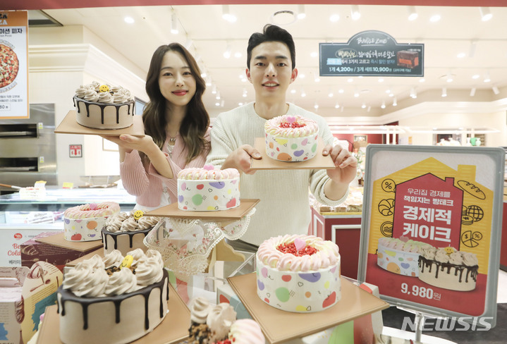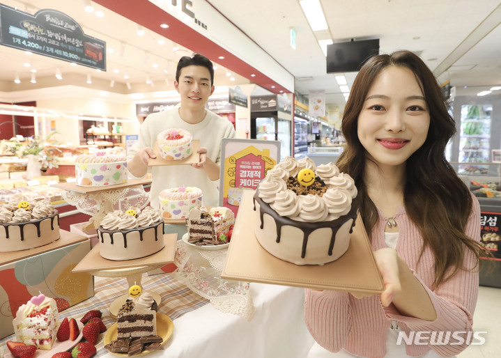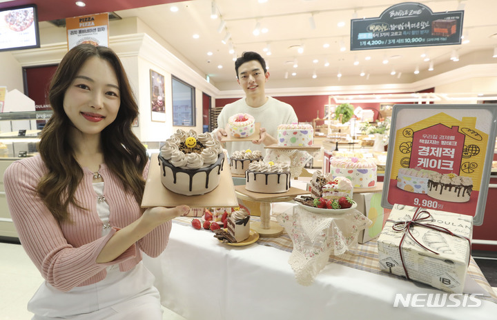 【NEWSIS】30日午前、ソウル市竜山区の大型スーパー「イーマート竜山店」ブランジェリーで、「9980ウォン(約1000円)経済的ケーキ」のPRが行われた。総合食品企業の新世界フードでは、「物価高による消費者のパン類に関する経済的負担を減らそうと考え、『経済的ベーカリー』プロジェクト第3弾として、この『9980ウォン経済的ケーキ』2種を発売した」と説明した。