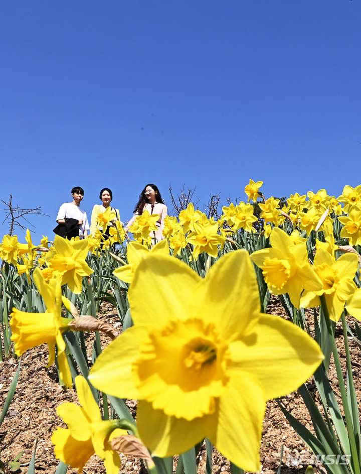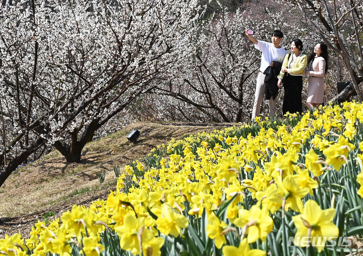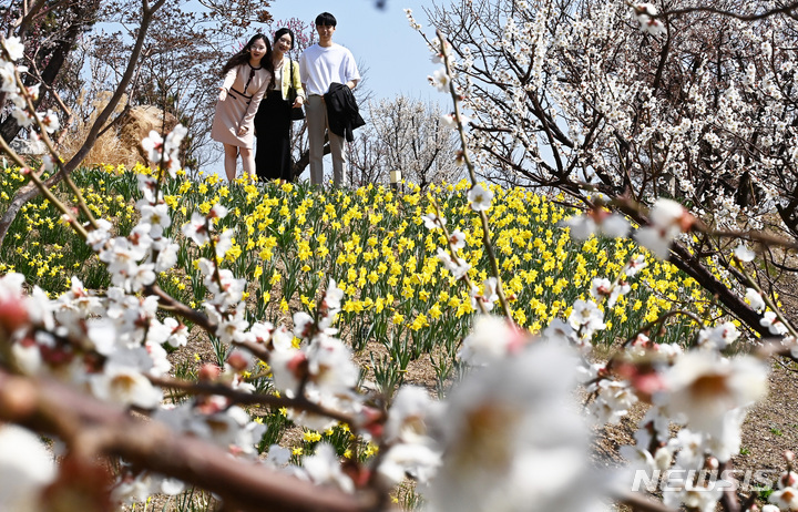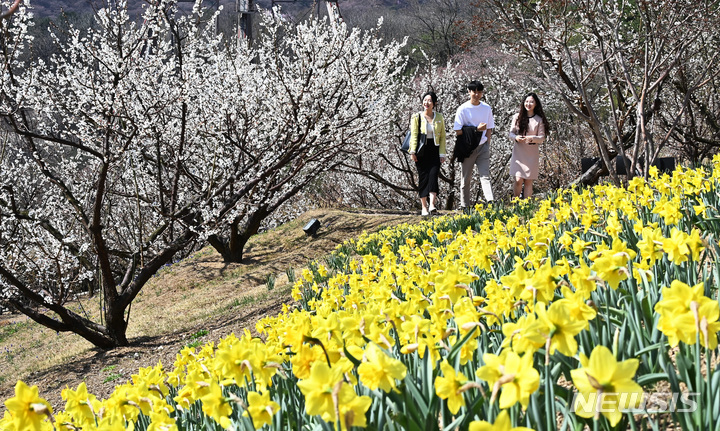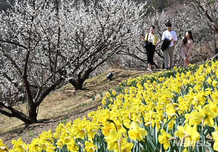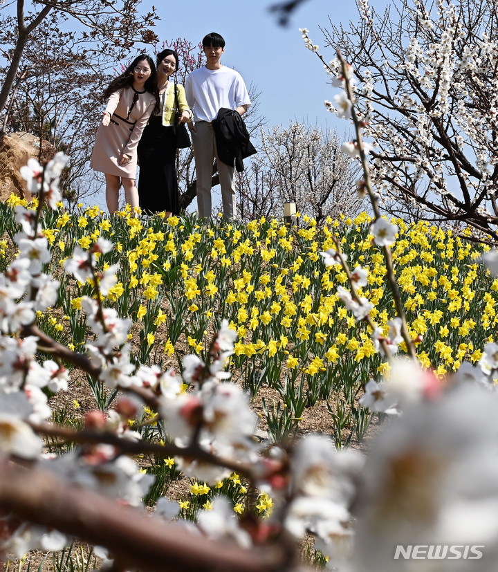春らしい陽気となった30日、エバーランド(京畿道竜仁市)内にあるハヌル庭園の道を訪れた市民たちが、咲き誇る梅やスイセンなど春の花を眺めながら散策を楽しんだ。