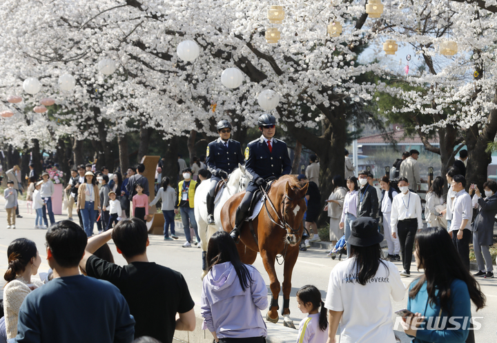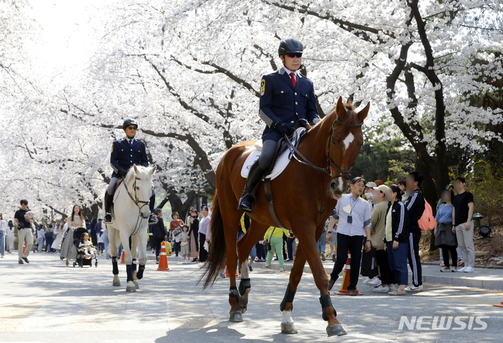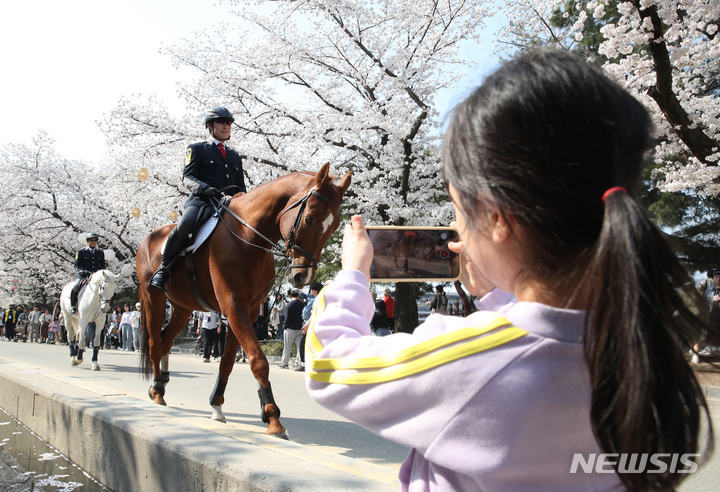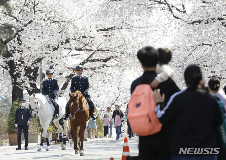【NEWSIS】春らしい一日となった2日、京畿道果川市の競馬場「レッツ・ラン・パーク・ソウル」で桜祭りが開催された。写真は桜の木の下を乗用馬と一緒にパレードする韓国馬事会の騎馬隊員たち。