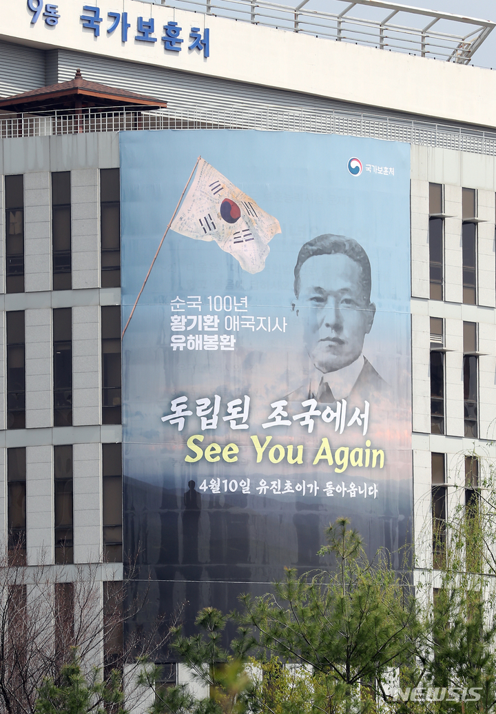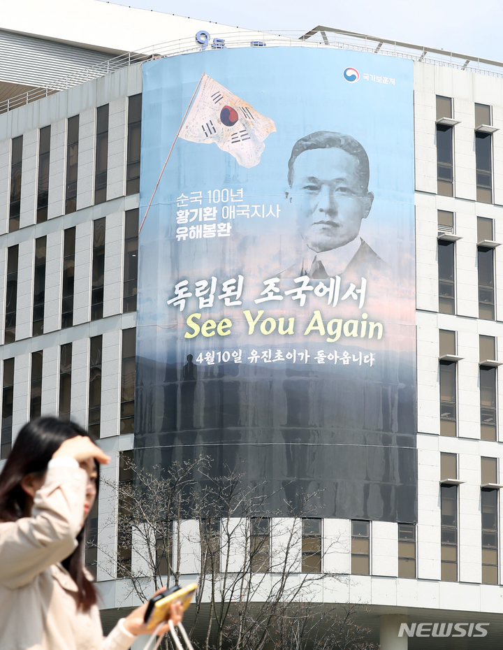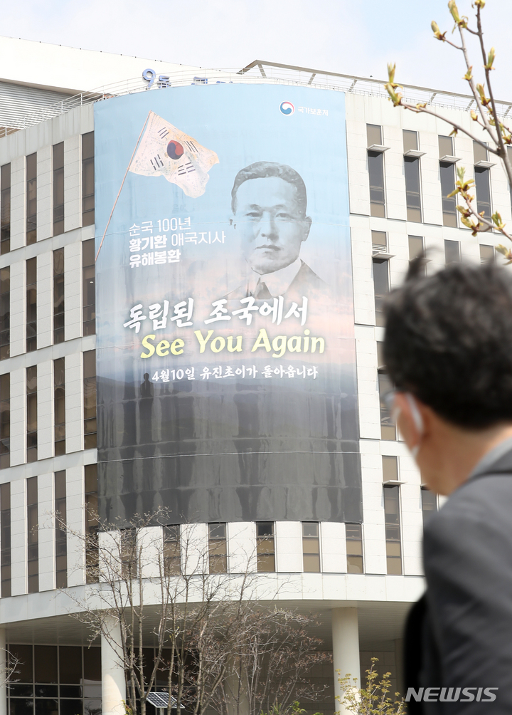 ドラマ『ミスター・サンシャイン』の主人公ユジン・チョイ(イ・ビョンホン)のモデルになった独立運動家ファン・ギファンが米国ニューヨークで息を引き取ってから100年を経て、故国に永眠することになった。写真は7日、世宗市政府世宗庁舎の壁面に、遺体奉還を知らせる垂れ幕が掛かっている様子。遺体は9日(現地時間)にニューヨークを出発し、10日に国立大田顕忠院へ埋葬される予定だ。