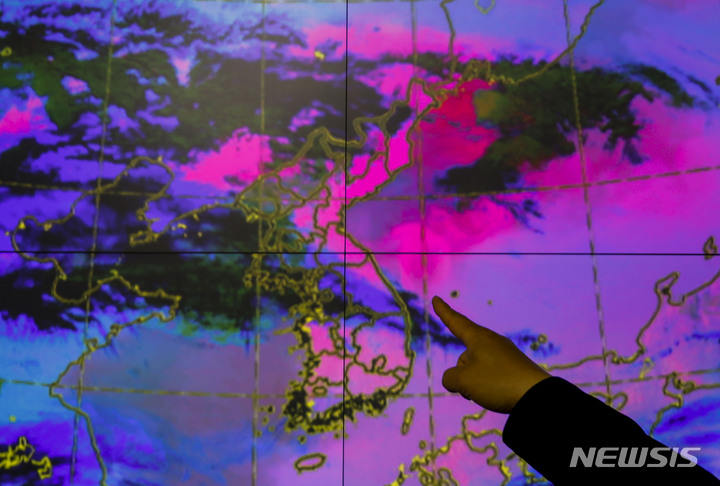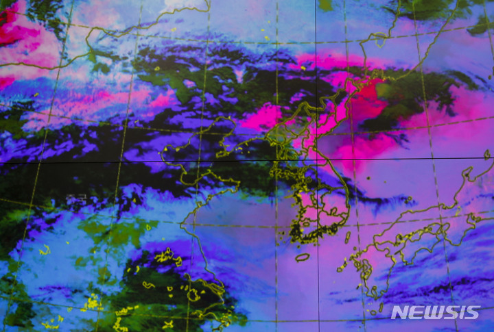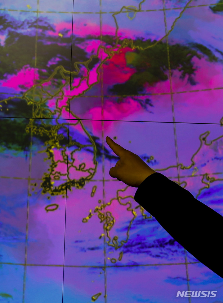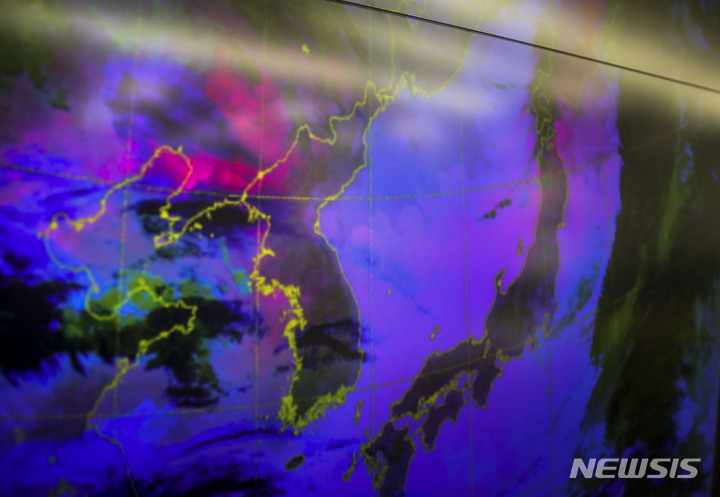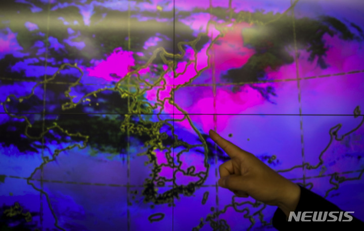 中国発の黄砂の影響により韓国のほとんどの地域で粒子状物質の濃度が「極めて悪い」の水準を示した13日、韓国気象庁(ソウル市銅雀区)の電光板に表示された衛星画像に、韓半島を通過しつつある黄砂(赤い部分)が表れている様子。