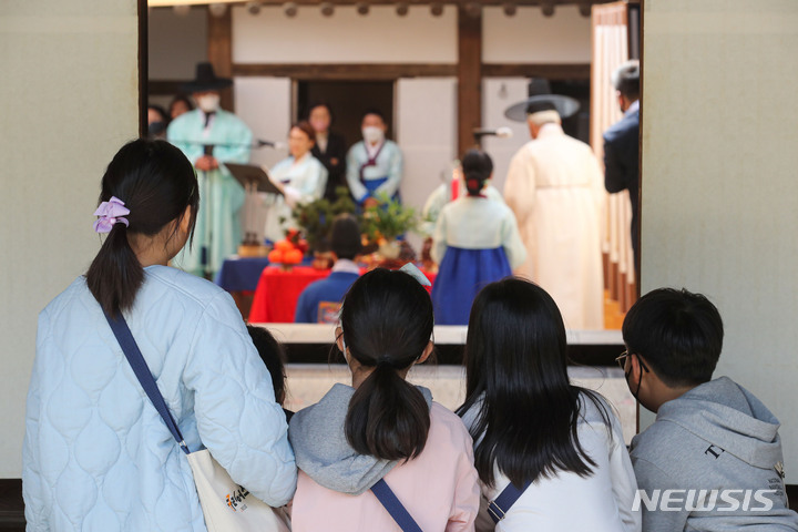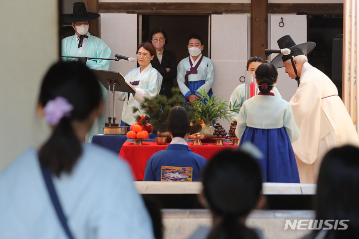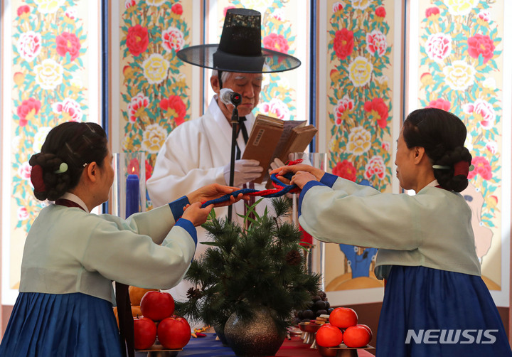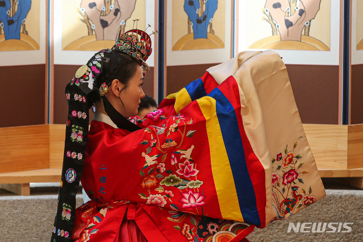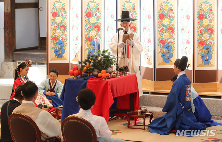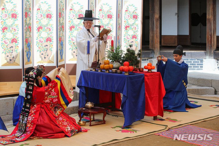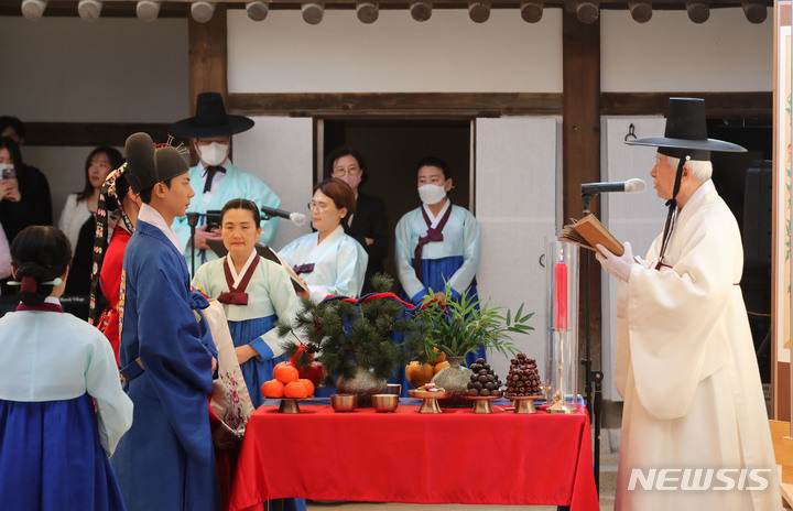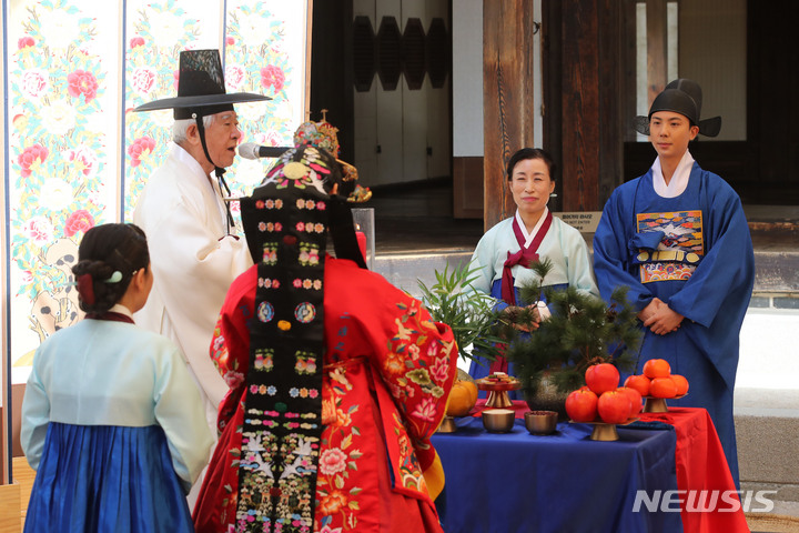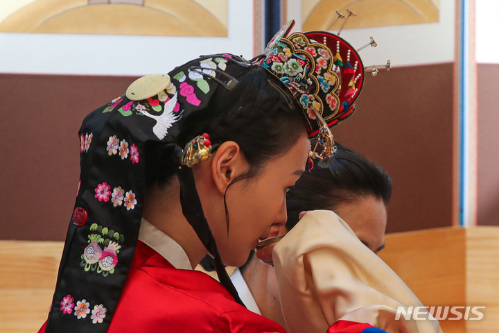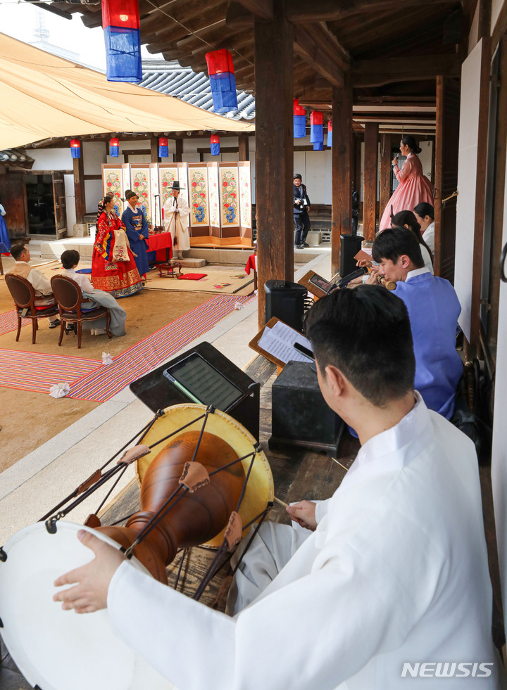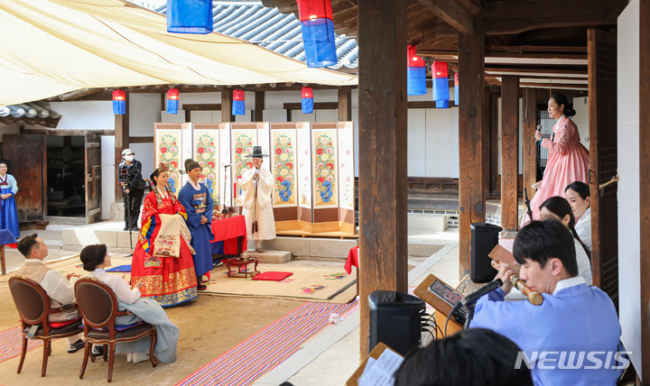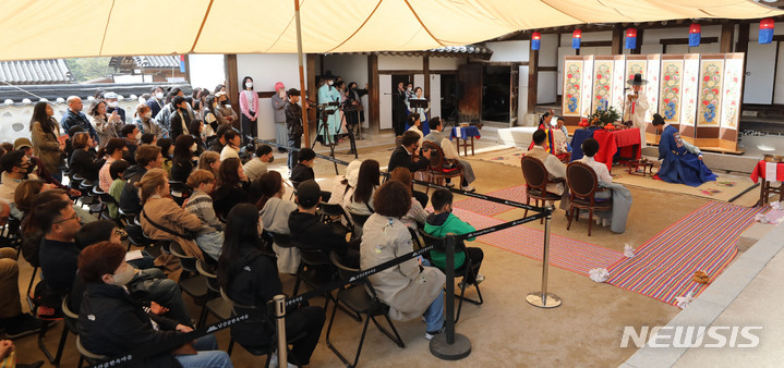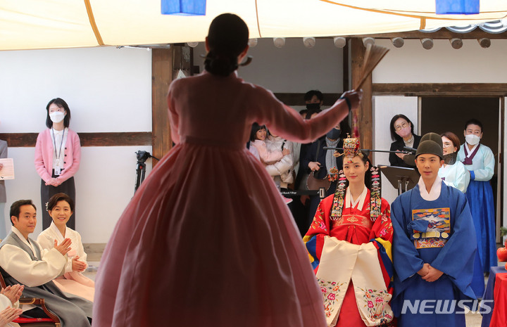 【NEWSIS】16日午後、ソウル市中区の南山韓屋村で、春の伝統婚礼再現行事が行われた。