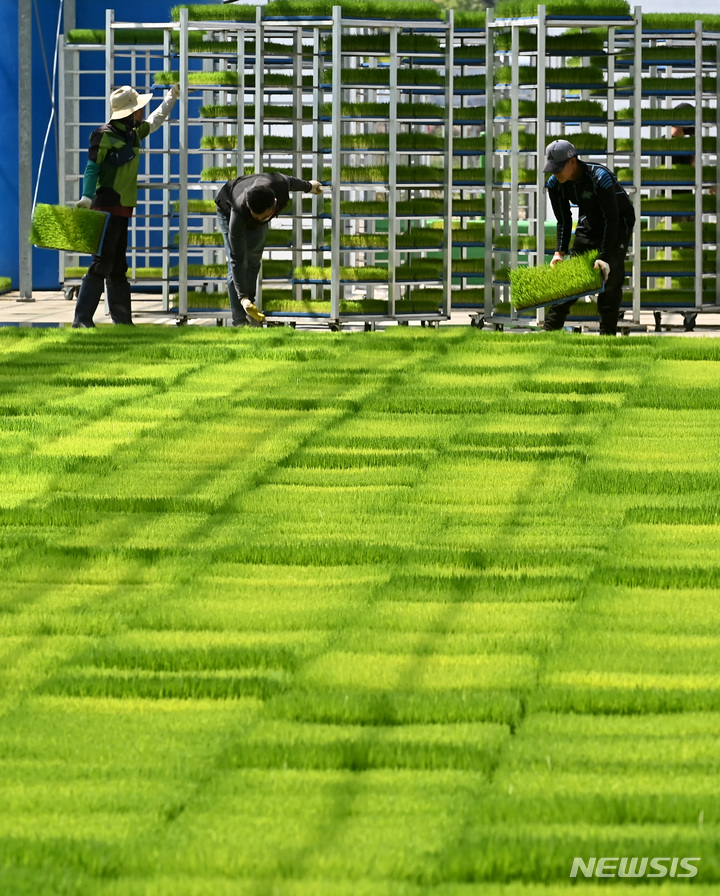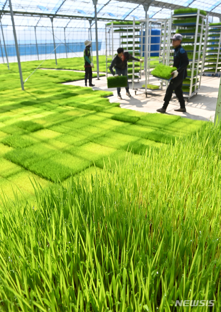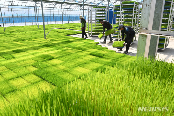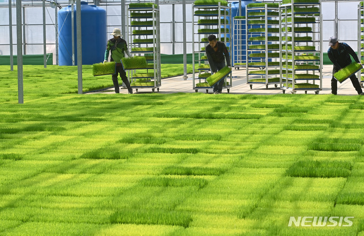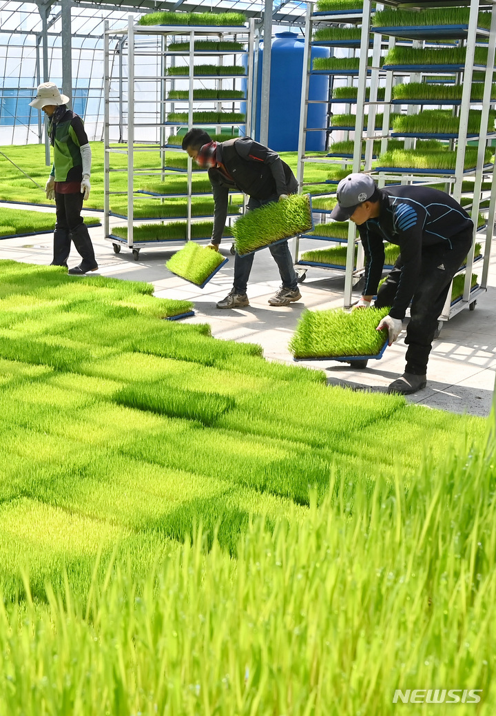 二十四節気の一つで農業の季節の始まりを告げる「穀雨」まであと一日と迫った19日、京畿道利川市の栗面農協共同育苗場で、苗床を移している関係者の様子。