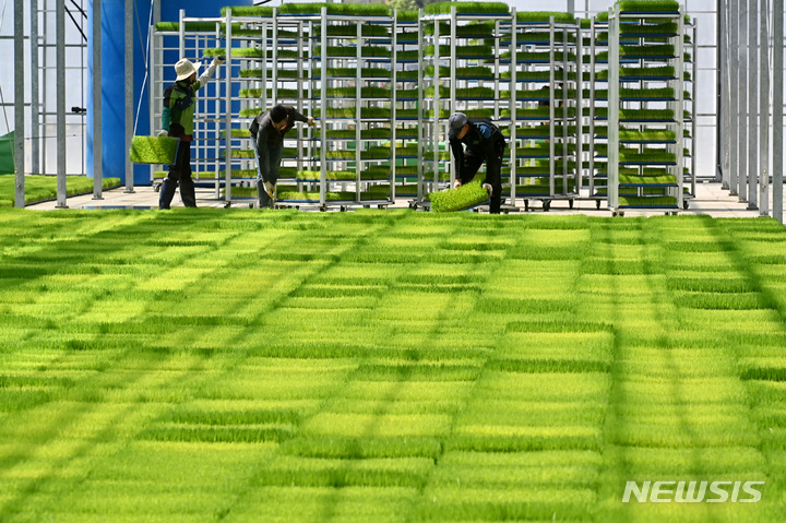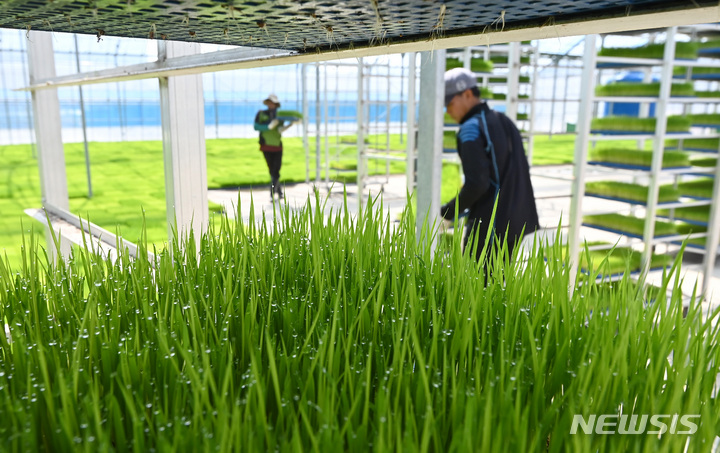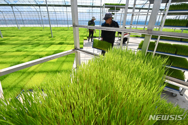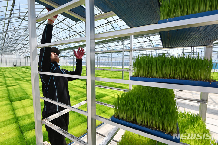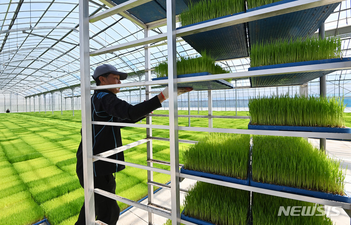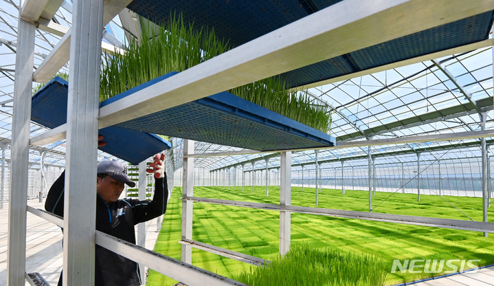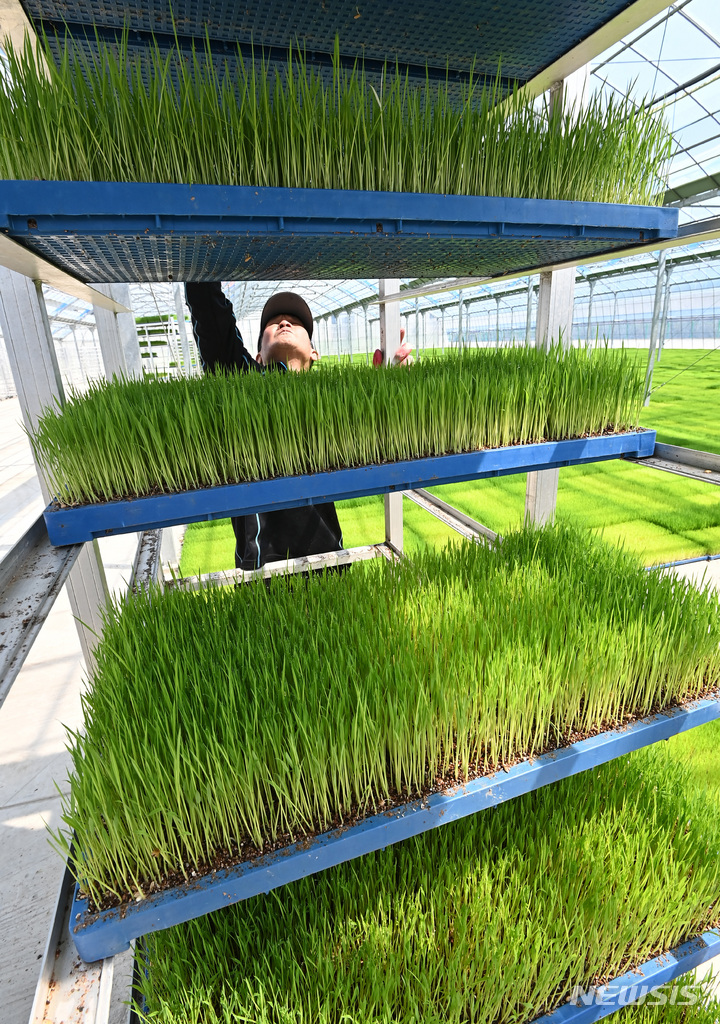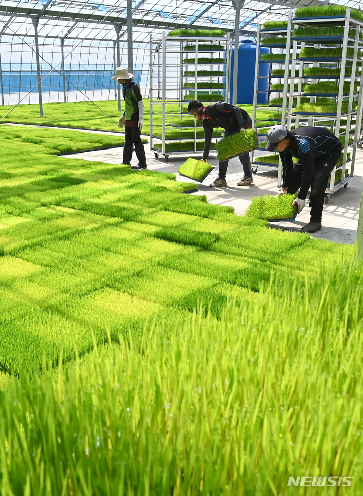 二十四節気の一つで農業の季節の始まりを告げる「穀雨」まであと一日と迫った19日、京畿道利川市の栗面農協共同育苗場で、苗床を移している関係者の様子。