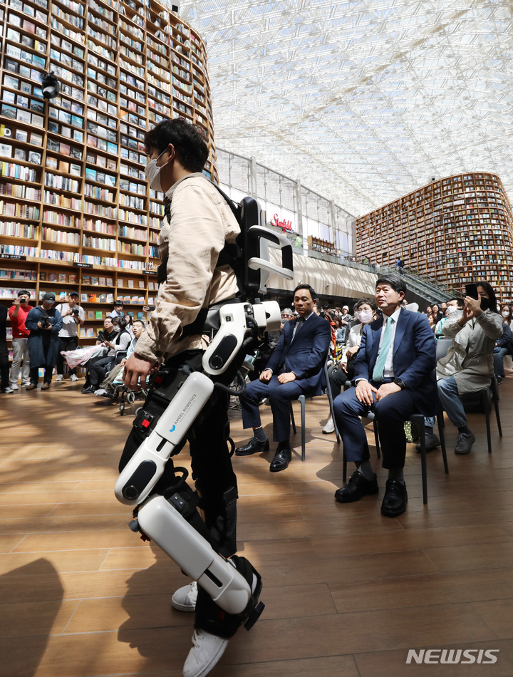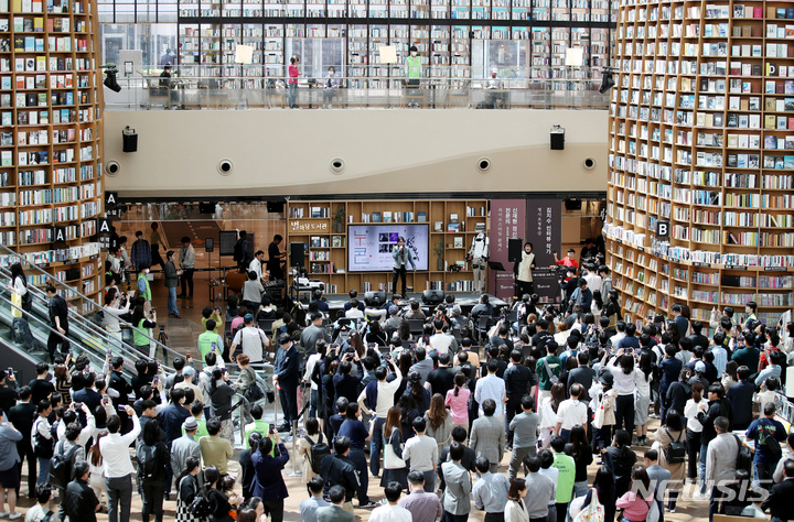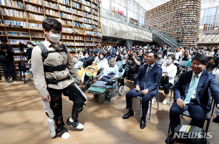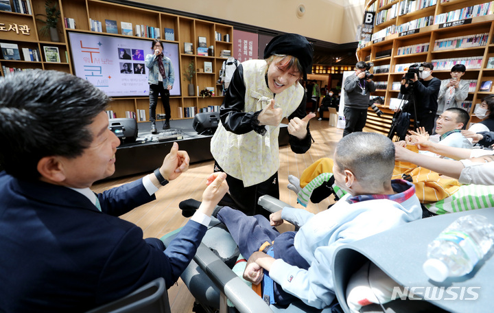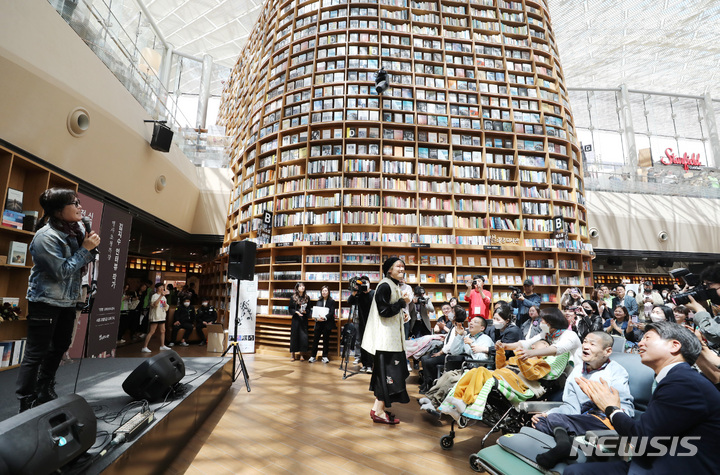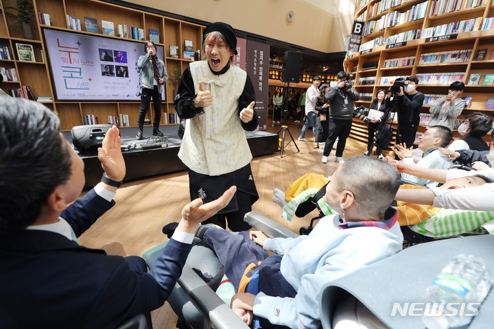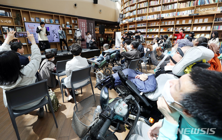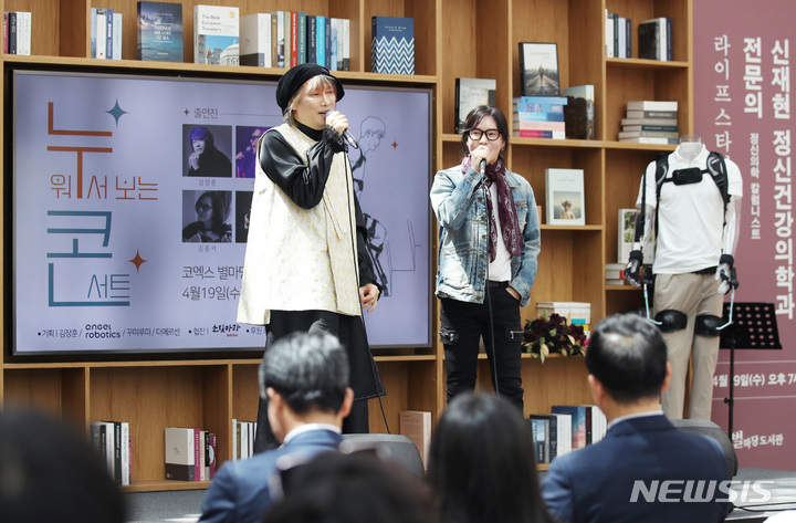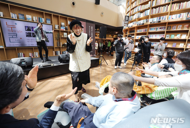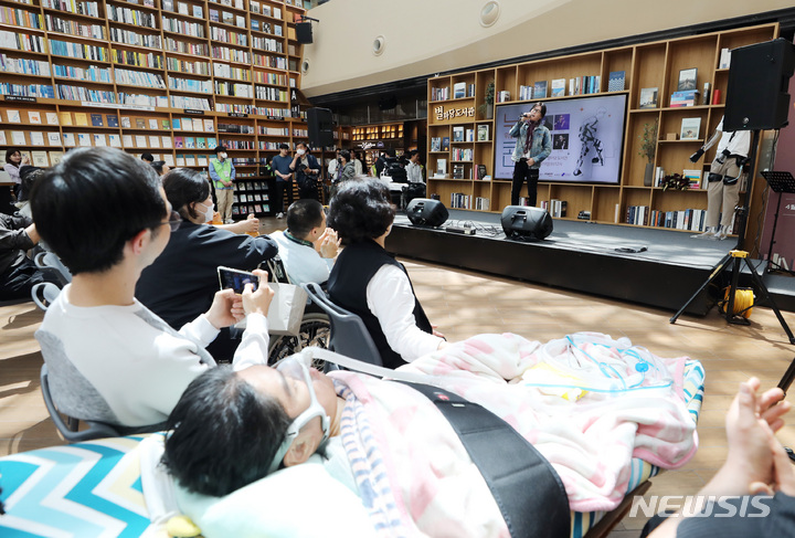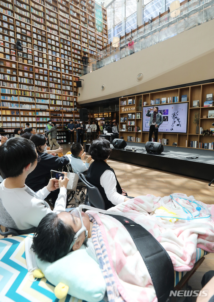 ソウル市江南区COEXの「星の広場図書館」で19日、「障害者の日(4月20日)」に合わせて「横になって見るコンサート」が開かれ、訪れた障害者や家族などが歌手キム・ジャンフンとキム・ジョンソの公演を鑑賞している。