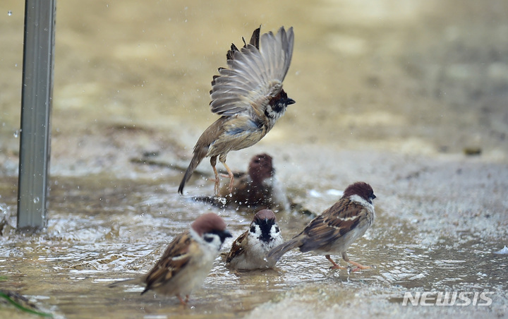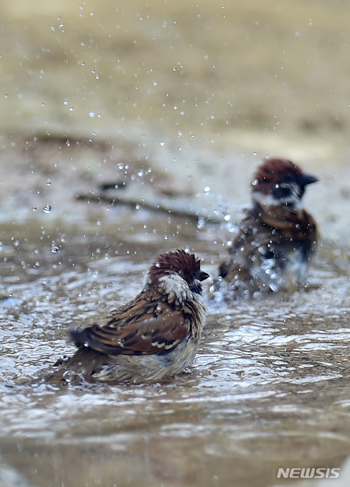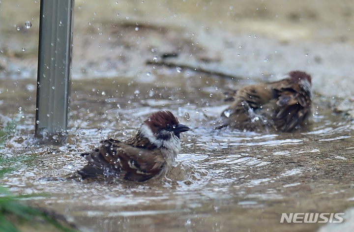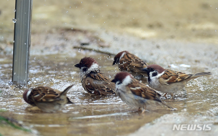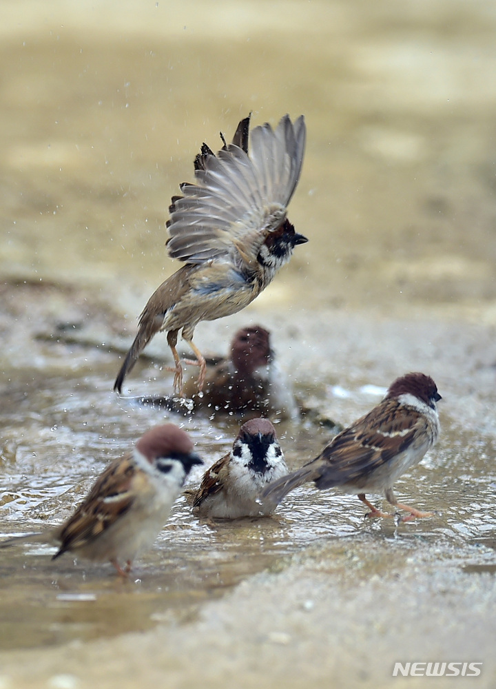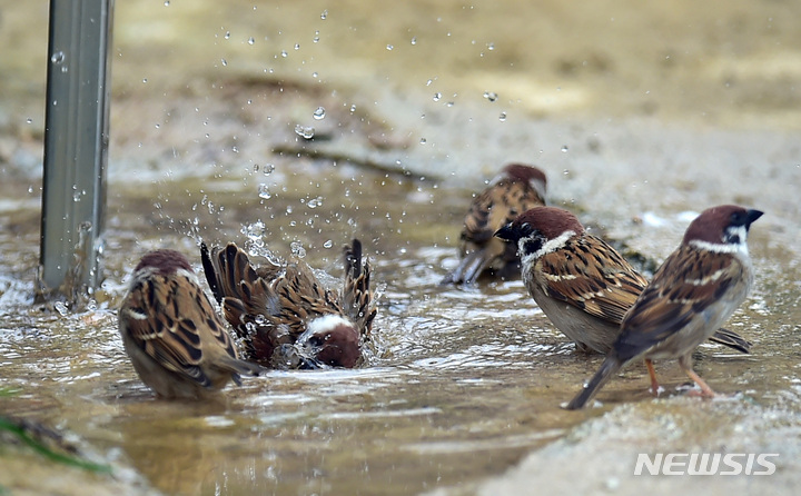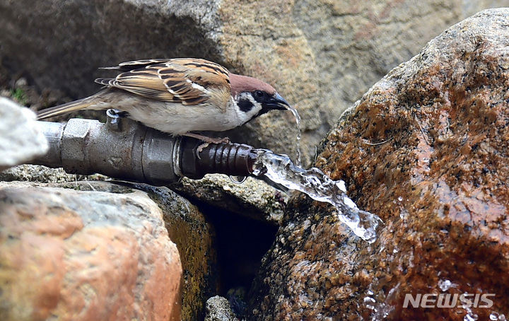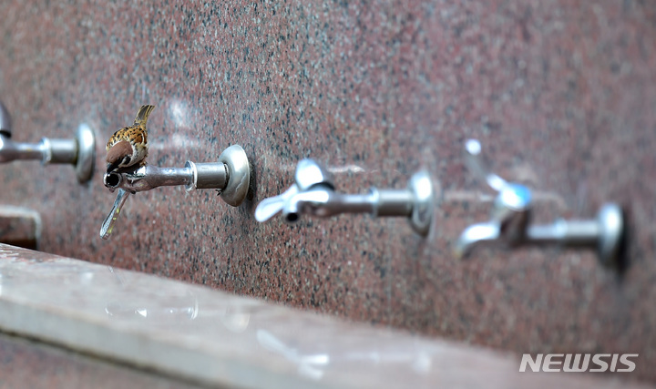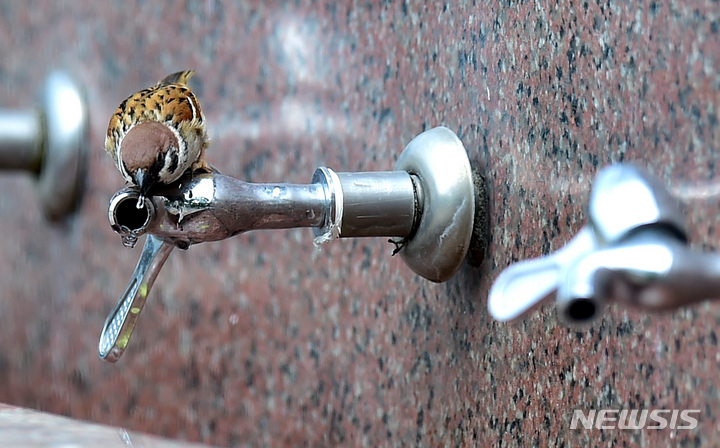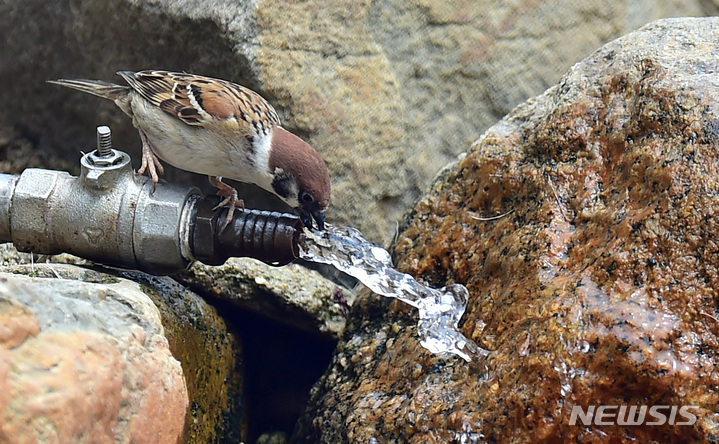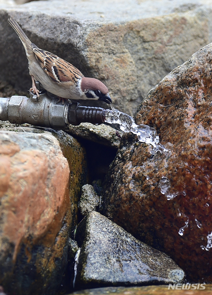 初夏の天気となった19日午後、大邱市中区の達城公園では、1羽のスズメが水を飲んで口を湿らせていた。