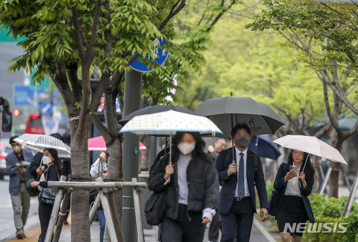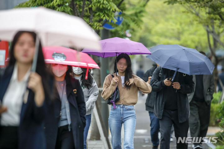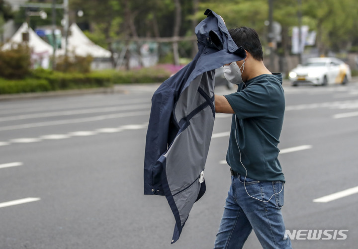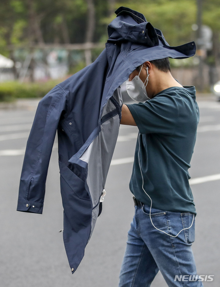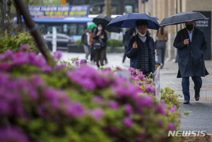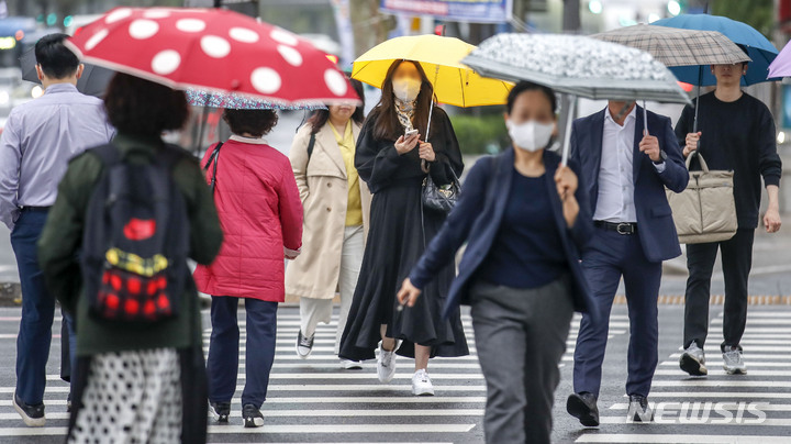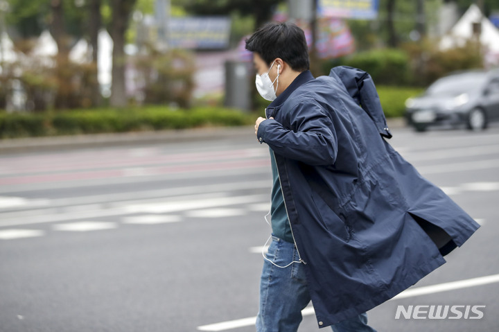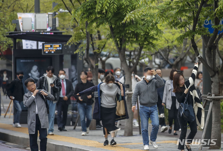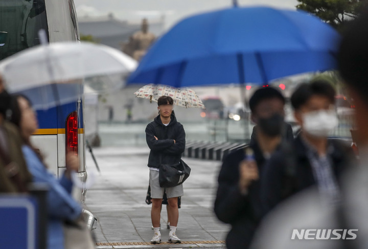 ソウルで朝の気温が前日に比べ10度ほど下がった20日午前、ソウル市鍾路区の世宗路交差点では、バスを降りた市民たちが上着を羽織っていた。