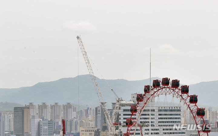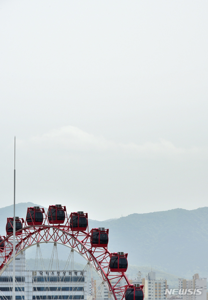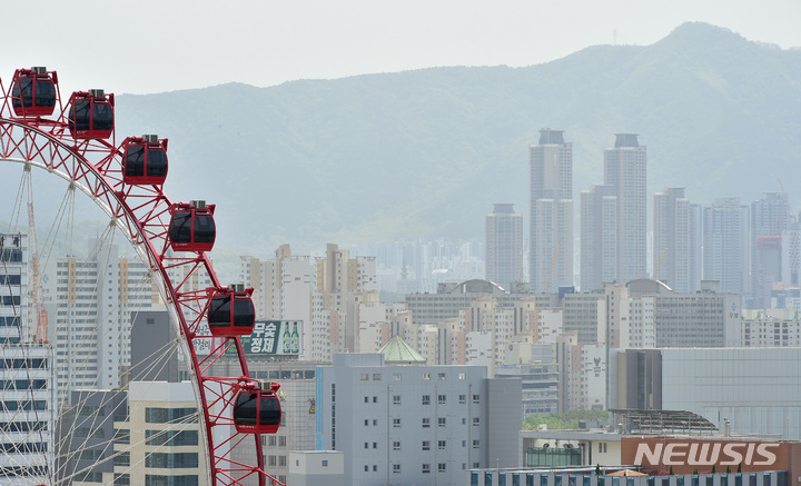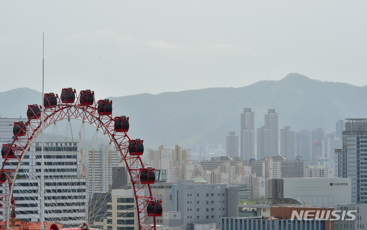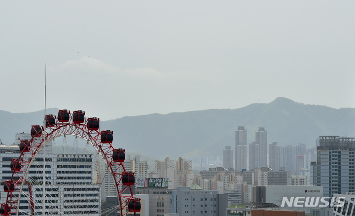 粒子状物質の濃度が「悪い」の水準を示した21日、大邱市中区東城路から望んだ市街中心部は白くかすんで見えた。