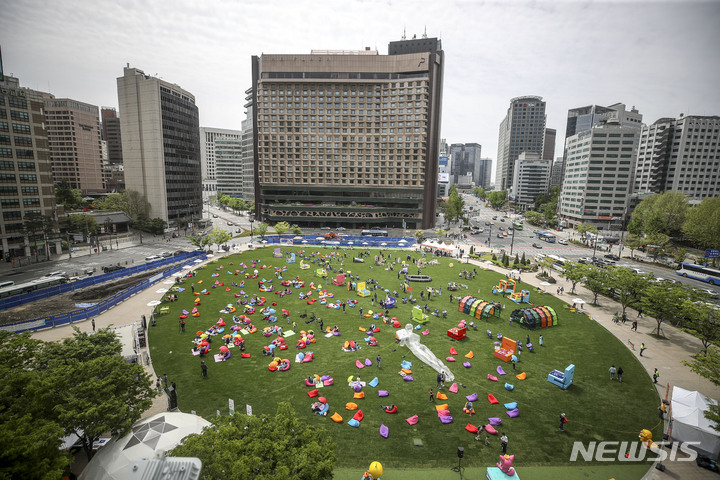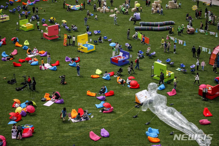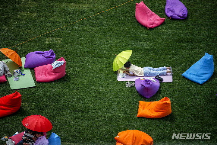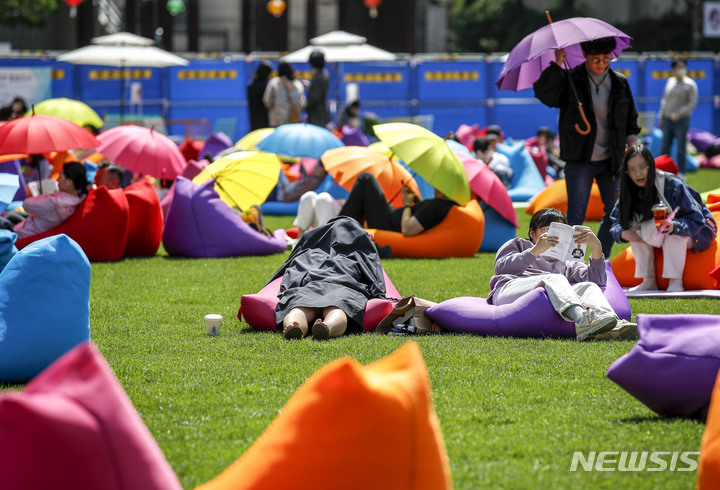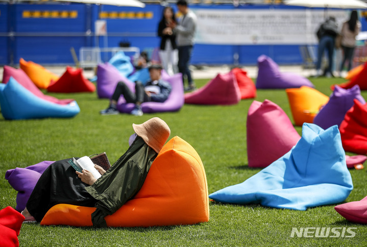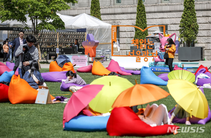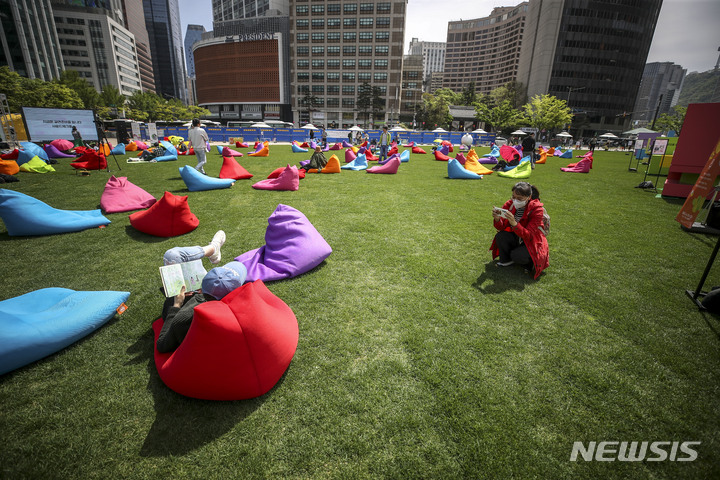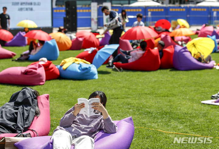【NEWSIS】「世界本の日(世界図書・著作権デー)」だった23日、ソウル市中区のソウル広場に設けられた「本を読むソウル広場」を訪れ、思い思いに楽しいひとときを過ごす人々。ソウル市は今月23日から11月まで、光化門広場とソウル広場にそれぞれ「光化門本広場」「本を読むソウル広場」を設ける。
