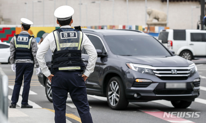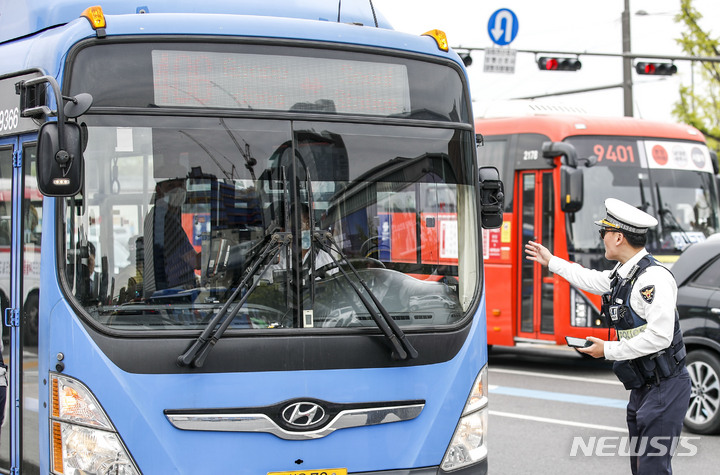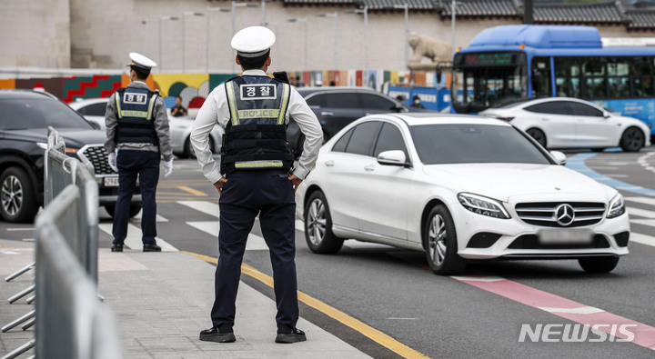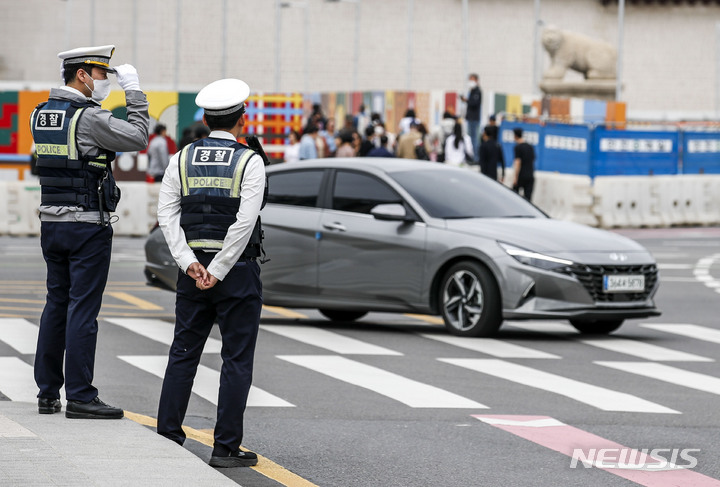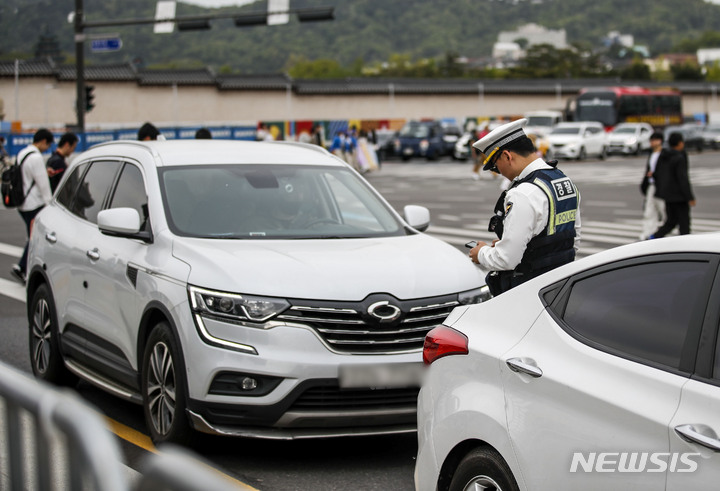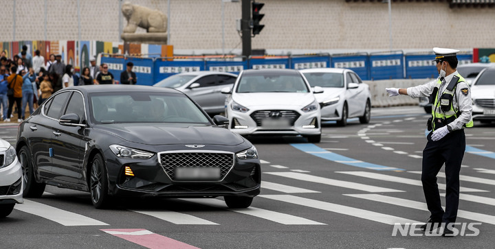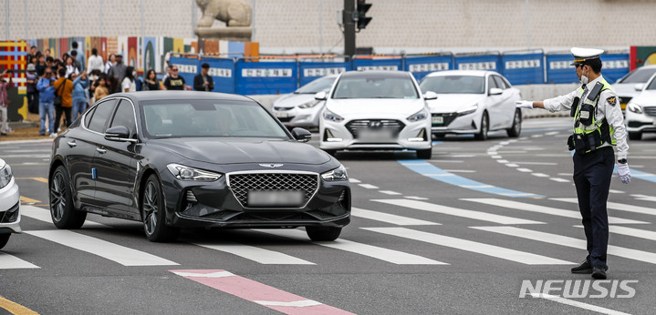 【NEWSIS】右折一時停止違反車両取り締まり二日目の23日午後、ソウル市内のある右折車線で、警察が取り締まりを行った。
