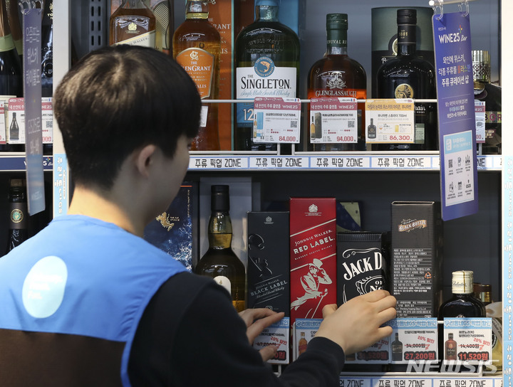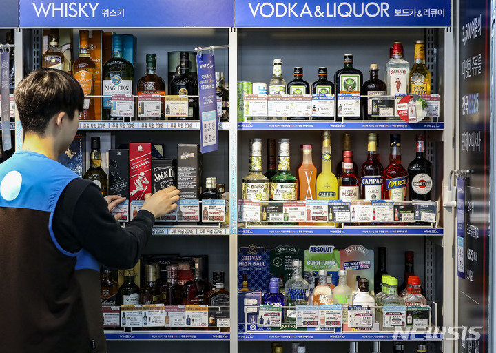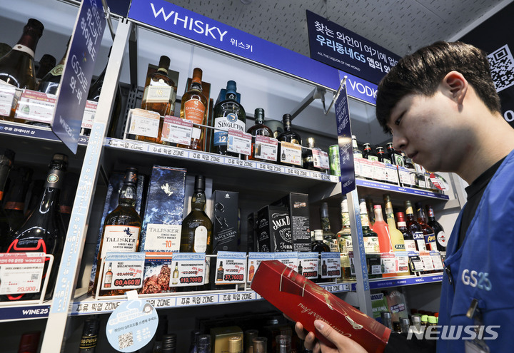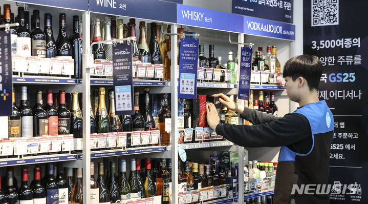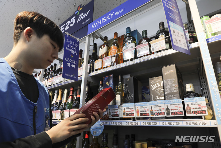 ソウル市江南区にあるコンビニエンスストアで24日、店員がウイスキーを整理している。コンビニ大手のGS25とCUによると、昨年のウイスキー市場の消費者層が中・壮年層から20-30代に移行し、購入者全体の70%を占めているという。