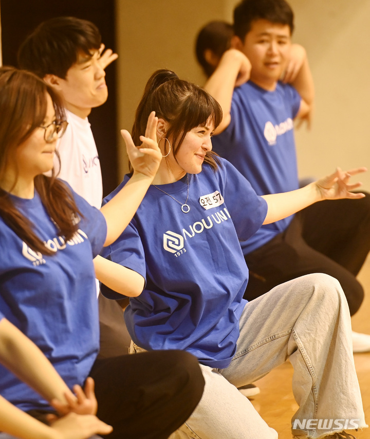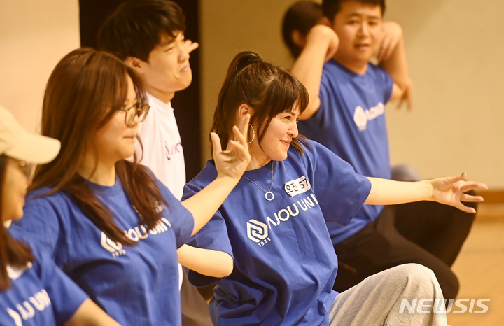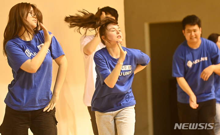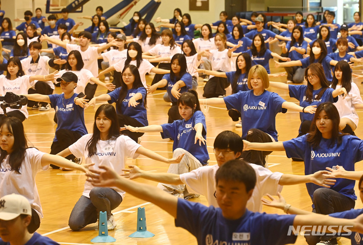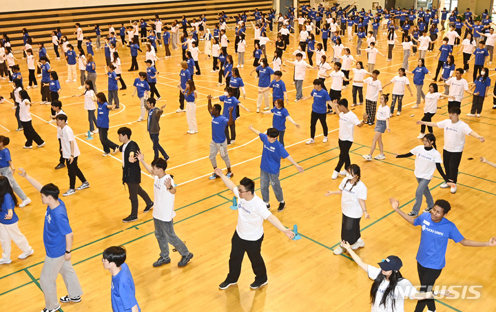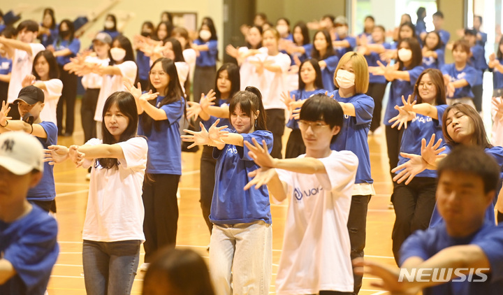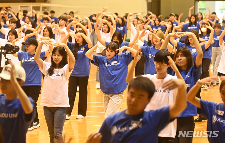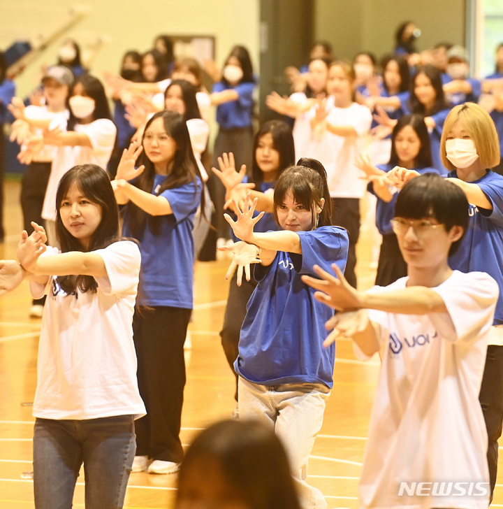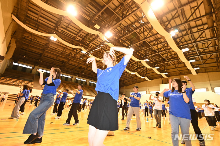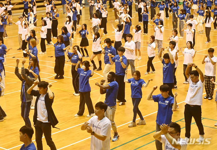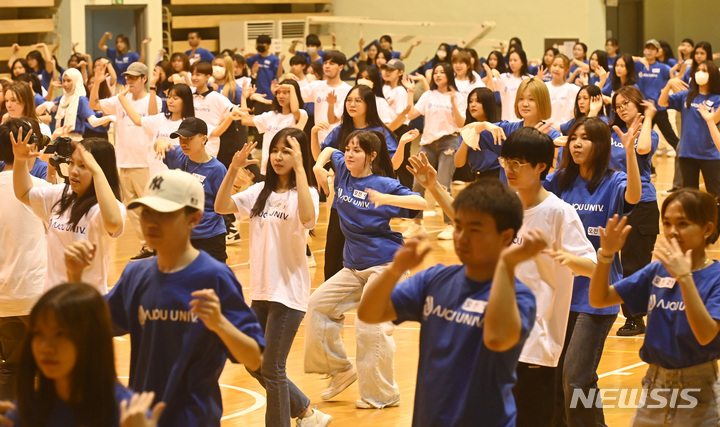 亜洲大学の外国人留学生が24日、京畿道水原市の同大学体育館で、開校50周年に合わせてKポップ・フラッシュモブ公演を行っている様子。