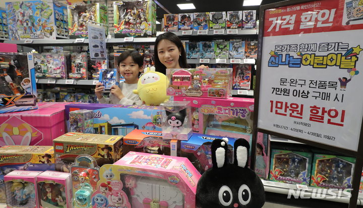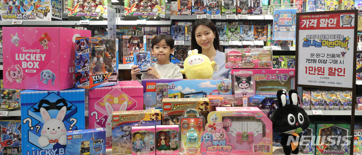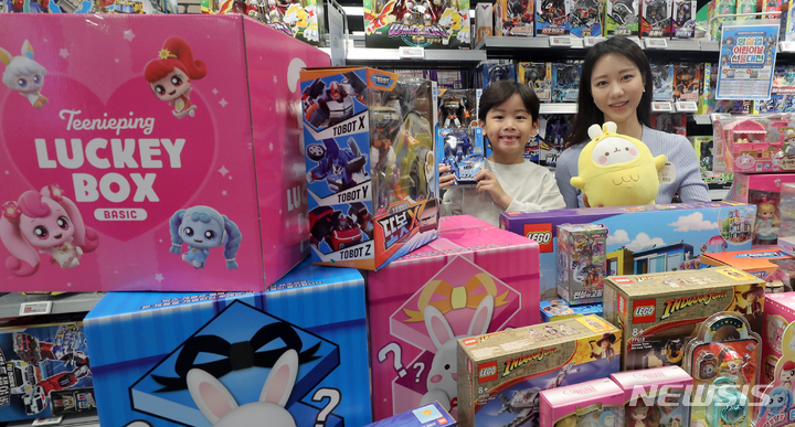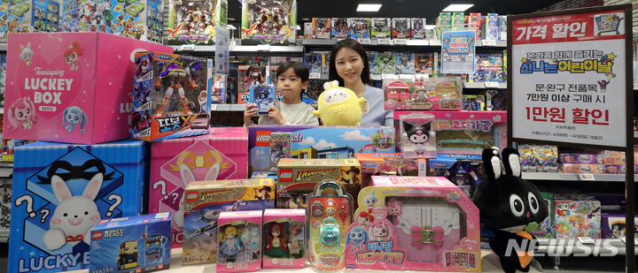 ソウル市永登浦区の大手スーパー「Eマート永登浦店」で25日午前、さまざまな玩具商品を披露するコンパニオンの様子。Eマートは来月7日まで文具・玩具を最大40%割引し、玩具のランダムラッキーボックスや人気キャラクター中心の企画玩具を披露する。