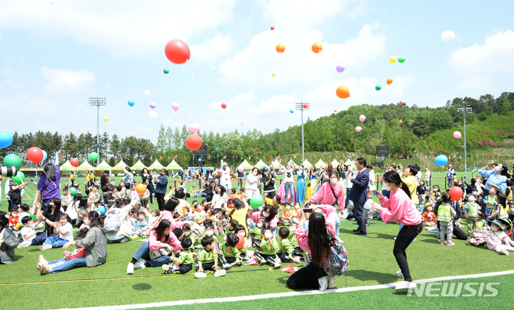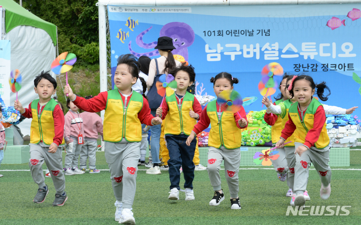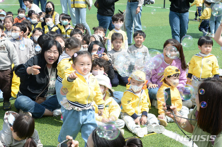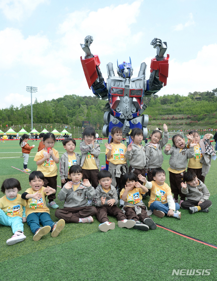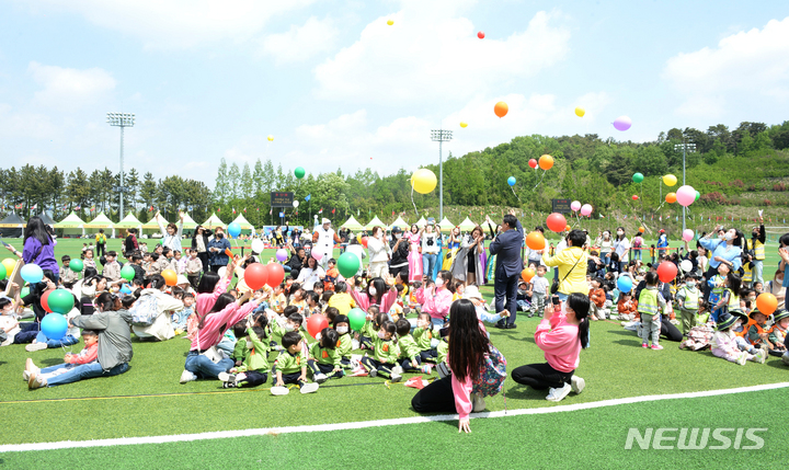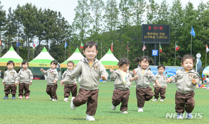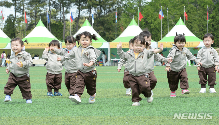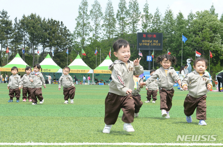 蔚山市南区の文殊国際洋弓場で27日午前、「第101回こどもの日」を記念してオリニチプ(民間保育施設)と共同で「南区バーサルスタジオ」イベントが開かれ、子どもたちが駆けっこをして楽しいひとときを過ごしている。