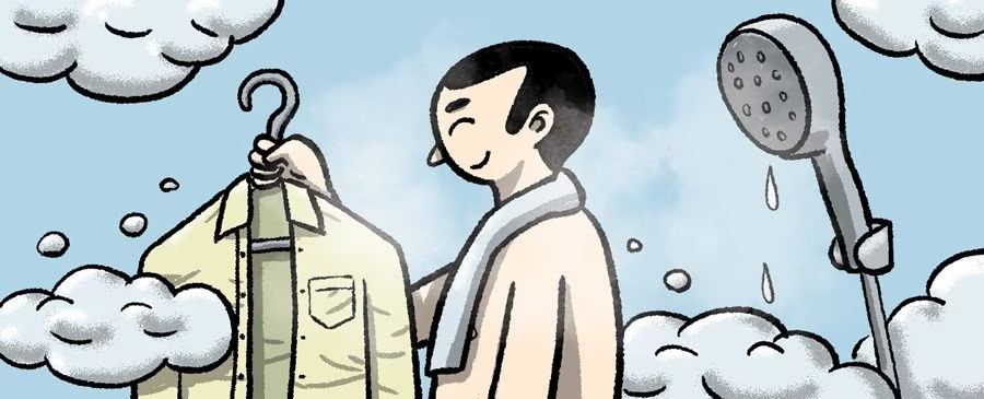 お風呂の後、浴室にしわくちゃのシャツをかけておくと、アイロンがけをしなくても浴室内の水蒸気でシャツのしわを伸ばすことができる。