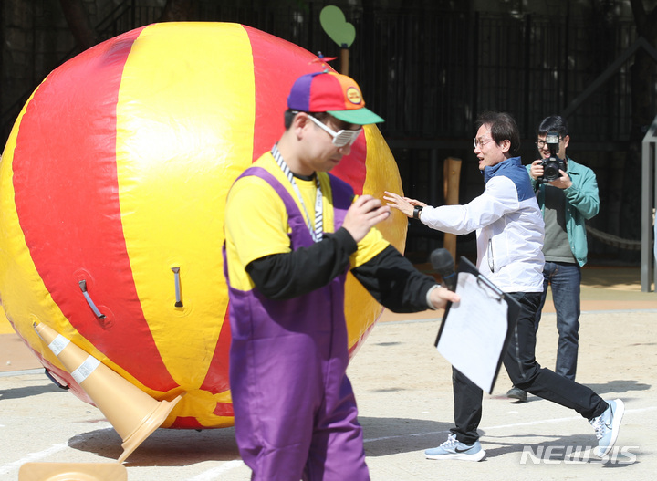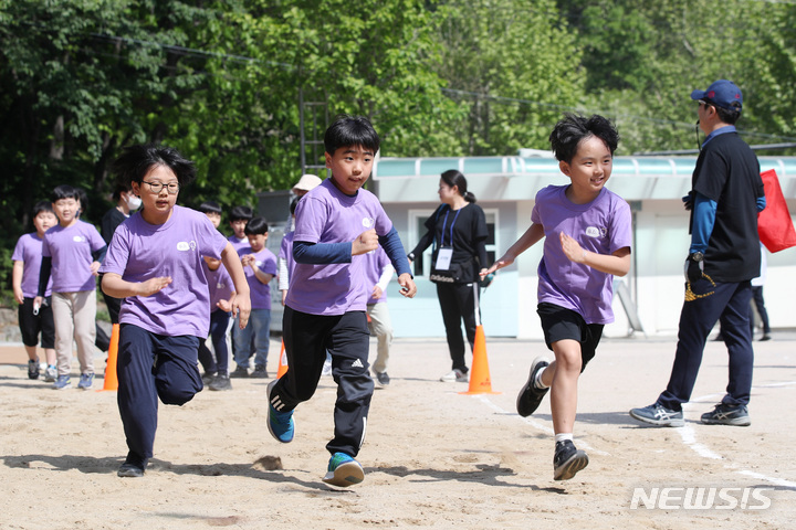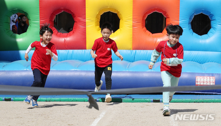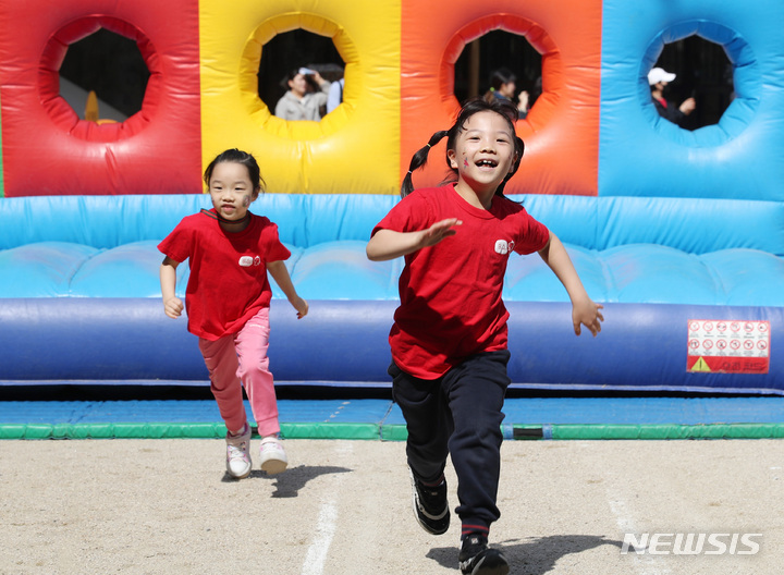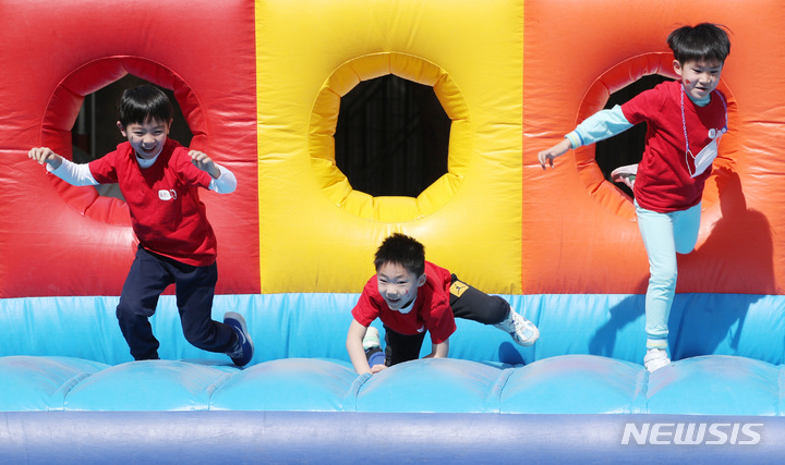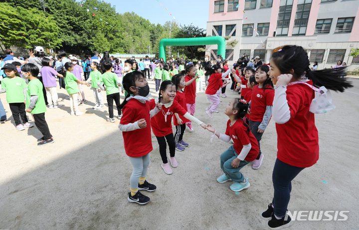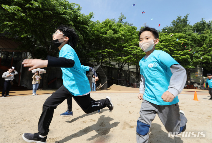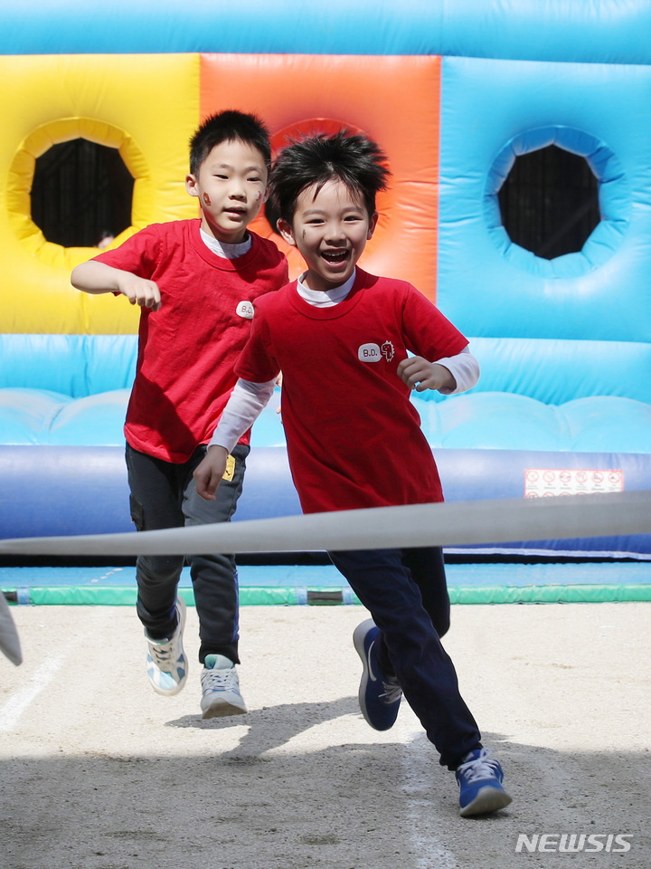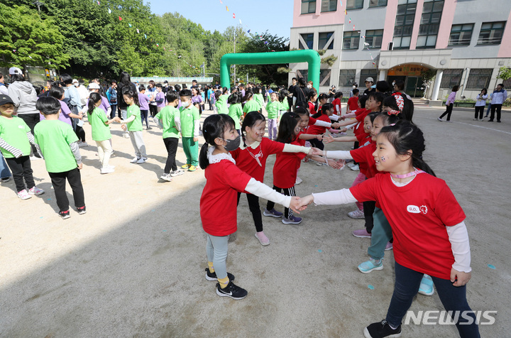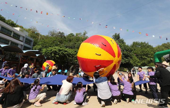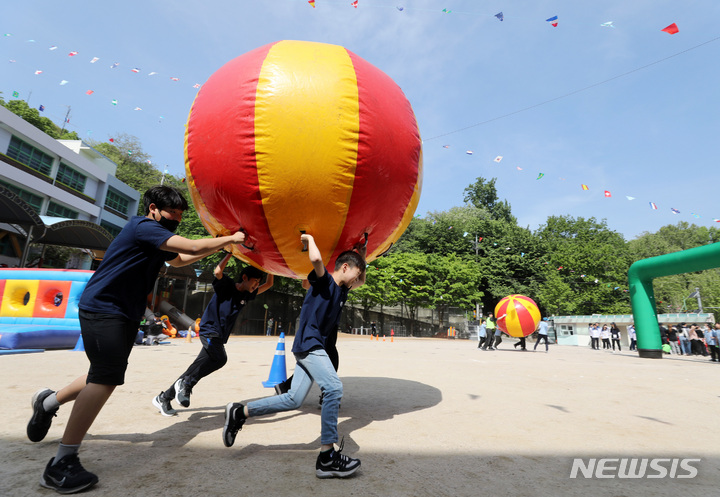 【NEWSIS】3日、ソウル市銅雀区の本洞小学校で、「本洞ノリ・ハンマダン」運動会が開催された。写真は運動会で特大のビーチボールを運ぶ児童たち。