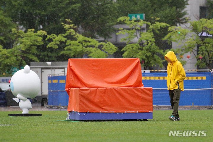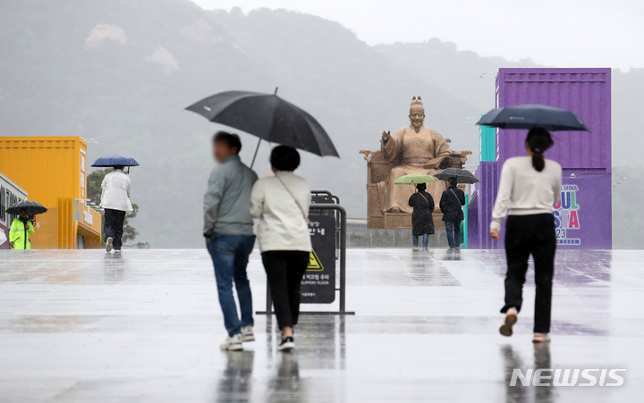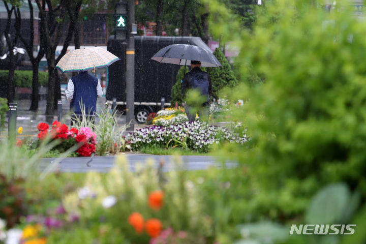 【NEWSIS】二十四節気で夏の兆しが見え始めるころとされる「立夏」の6日午前、ソウル市中区のソウル広場で、傘を差して雨の中を歩く人々。