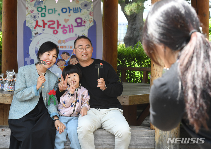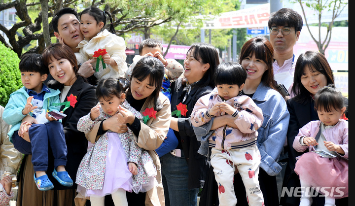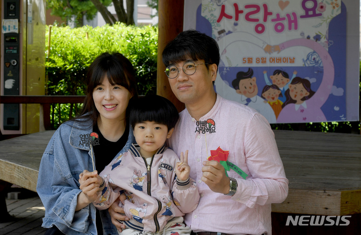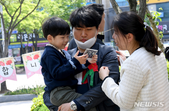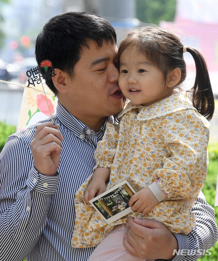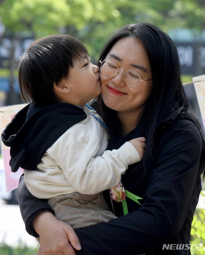 母の日にあたる8日、区庁広場前(広州市北区龍鳳洞)で、光州市北区庁職場オリニチプ(民間保育施設)のある園児が自ら作ったカーネーションを母親に付けてあげていた。