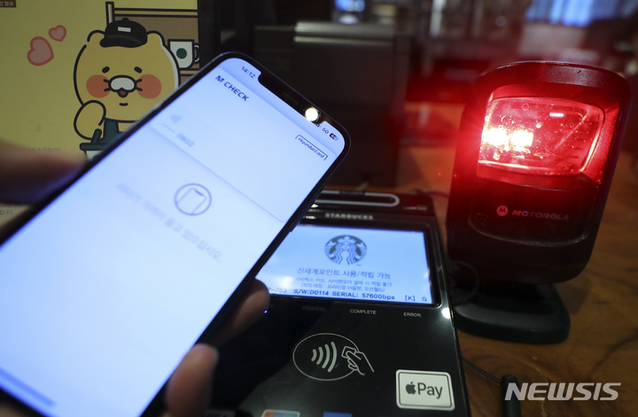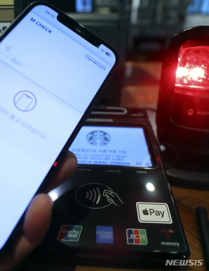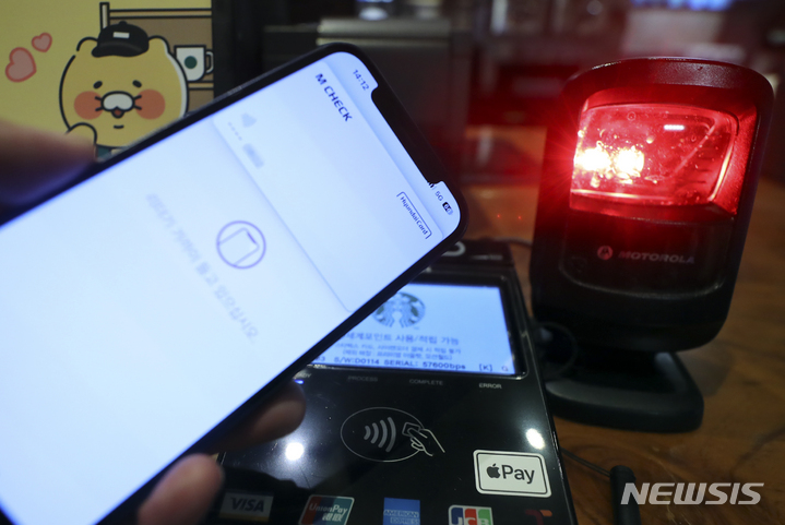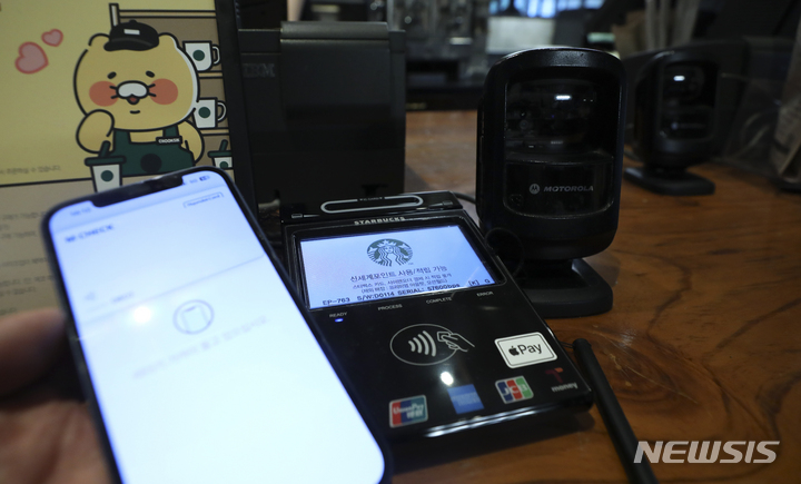スターバックスの売り場でアップルペイ(Apple Pay)での決済が可能になった9日、ソウル市内のあるスターバックスの店舗で、決済端末機にApple Payのステッカーが貼ってある様子。