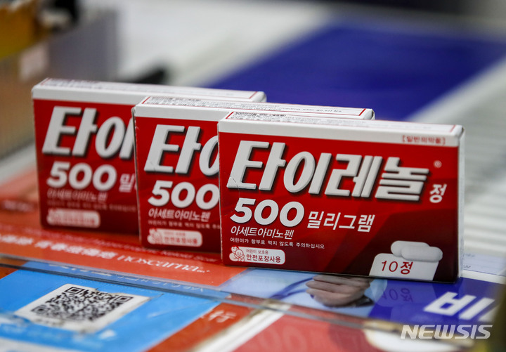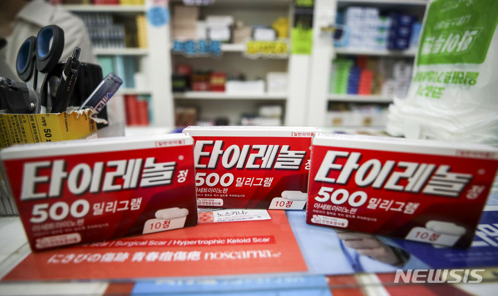【NEWSIS】韓国関税庁では最近、個人輸入により低価格で購入されたタイレノールなどの医薬品の国内通関を強化している。解熱・鎮痛薬「タイレノール」などの医薬品は薬局など法令によって定められた所でのみ購入でき、インターネットでは購入できない。写真は10日、ソウル市内の薬局に陳列されていた「タイレノール」。