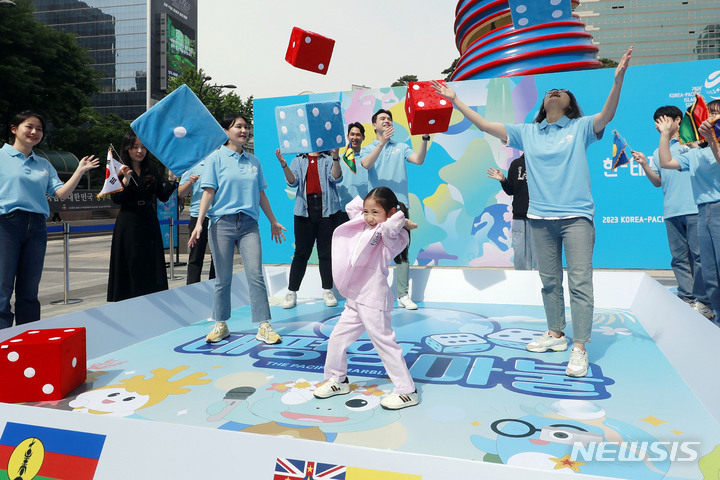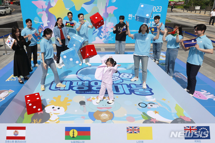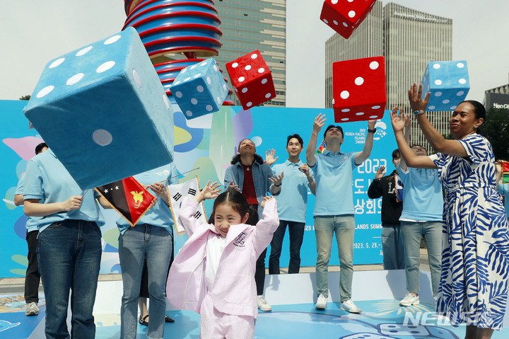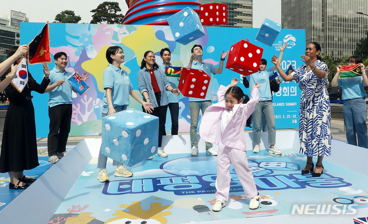ソウル市内の清渓広場で10日、フィジーからの留学生と子どもが、今月29日にソウルで開催される2023年韓国-太平洋島しょ国首脳会談をPRした。今回の首脳会談は、韓国と太平洋島しょ国間における初の首脳会談で、「共同繁栄に向けた航海:青い太平洋の協力強化」というテーマで開催される。