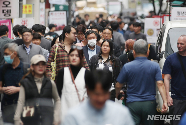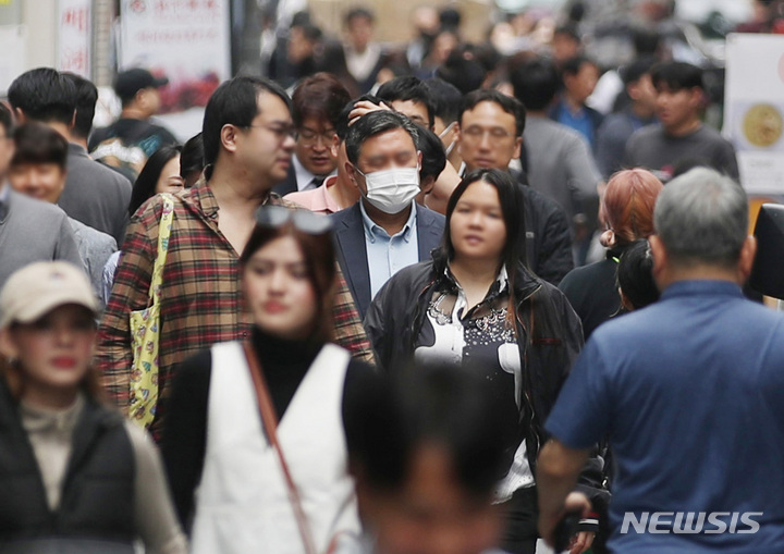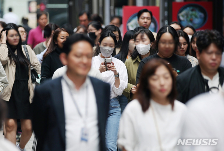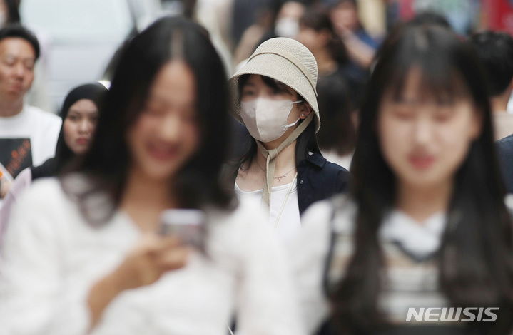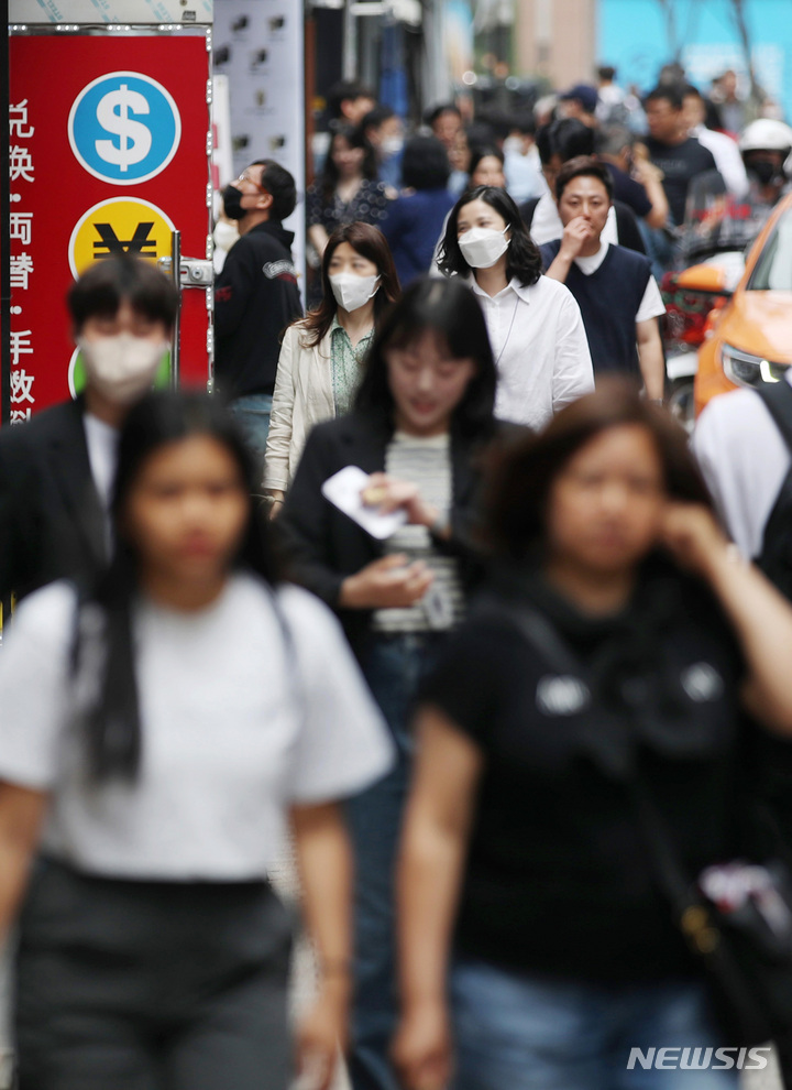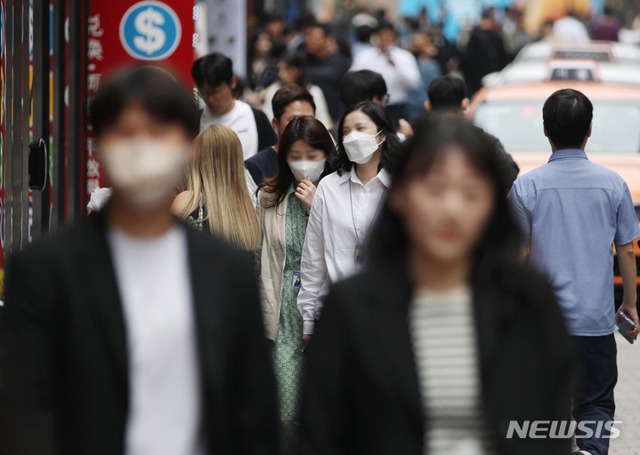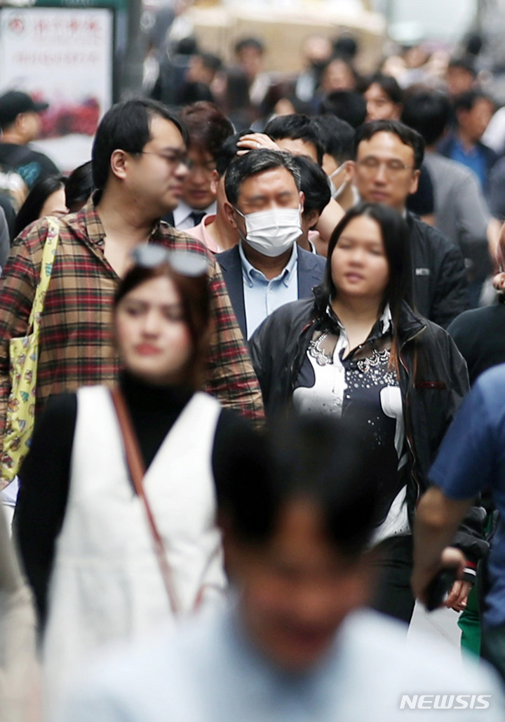 韓国政府が、新型コロナ危機警報を「深刻」から「警戒」に下方修正すると表明し、事実上「エンデミック(endemic. 風土病として定着した感染症)」を宣言してから一日経った12日、ソウル市中区明洞では、マスクを付けたり、付けていなかったりする市民が行き交っていた。