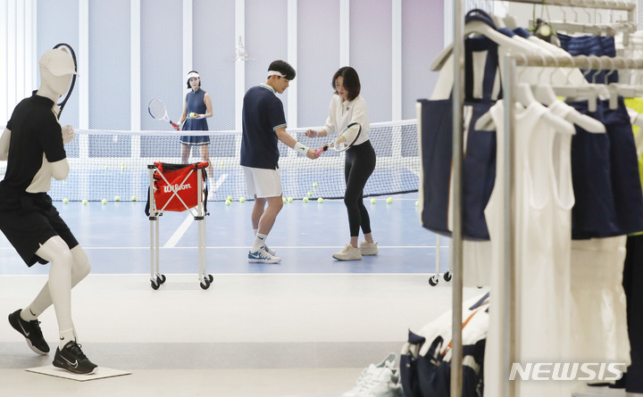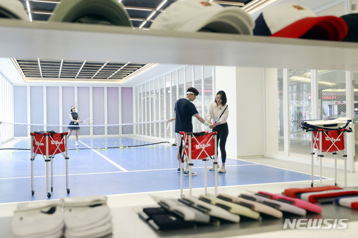 ロッテデパートが12日、ソウル市蚕室のロッテワールドモール3階にて体験型テニス売場「テニスメトロ」をPRしている様子。ロッテデパートはテニスメトロと提携し、さまざまなテニス用品およびウエアをそろえると共に、ラケットコンサルティングなど顧客一人一人に合わせたサービスも提供する。