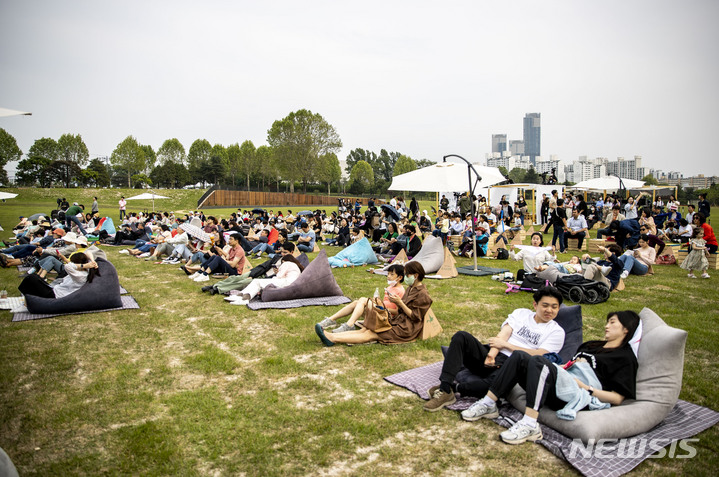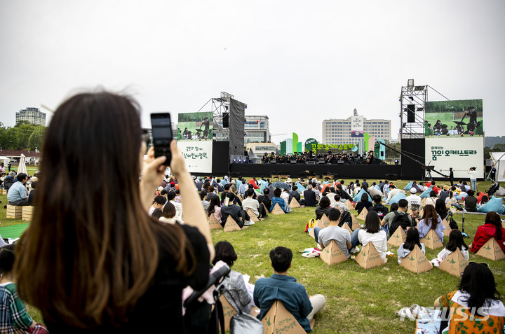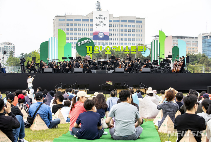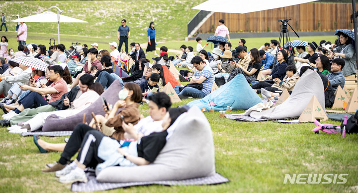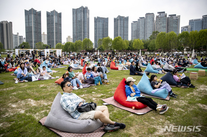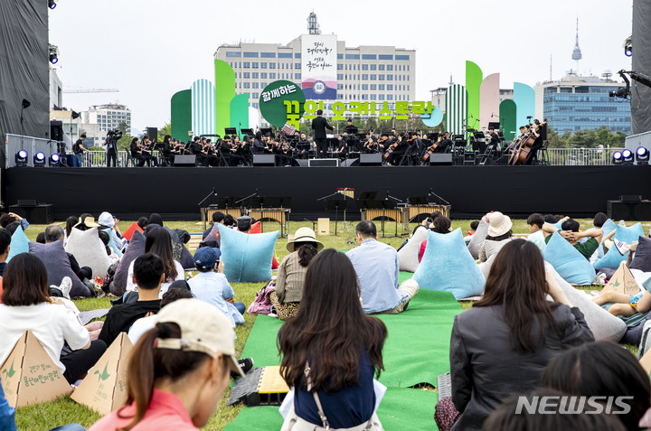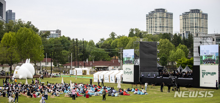 13日、ソウル市竜山区の竜山子ども庭園を訪れた市民が「夢のオーケストラ オサン」の公演を見て、楽しいひとときを過ごしている様子。