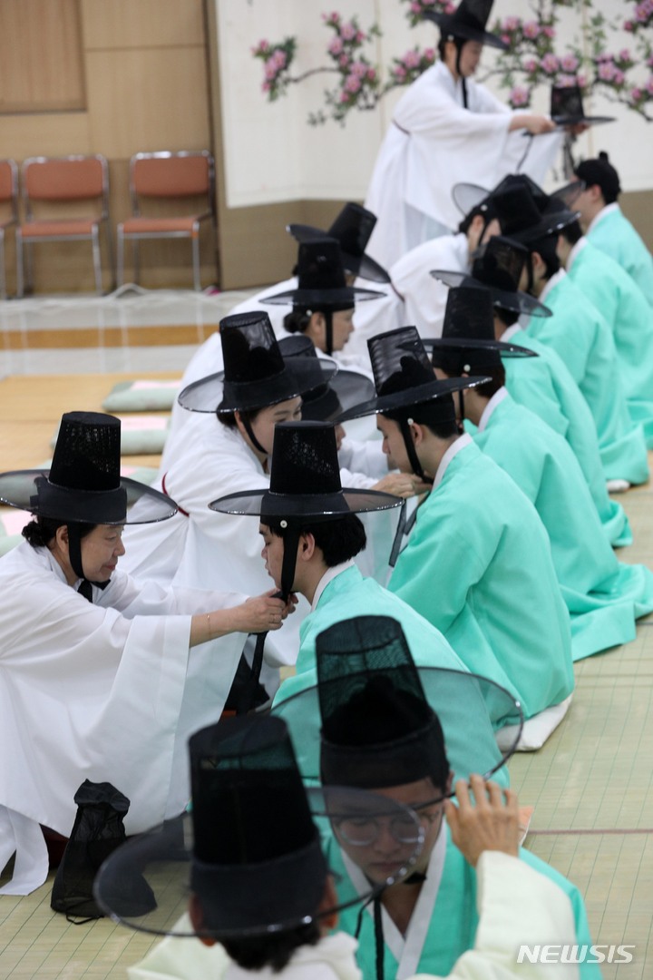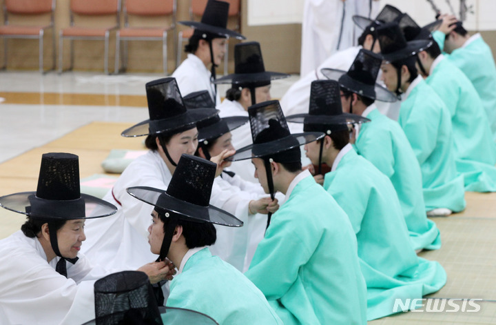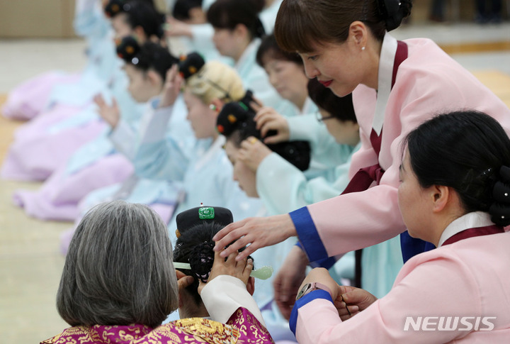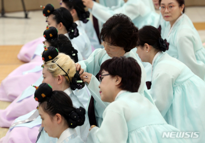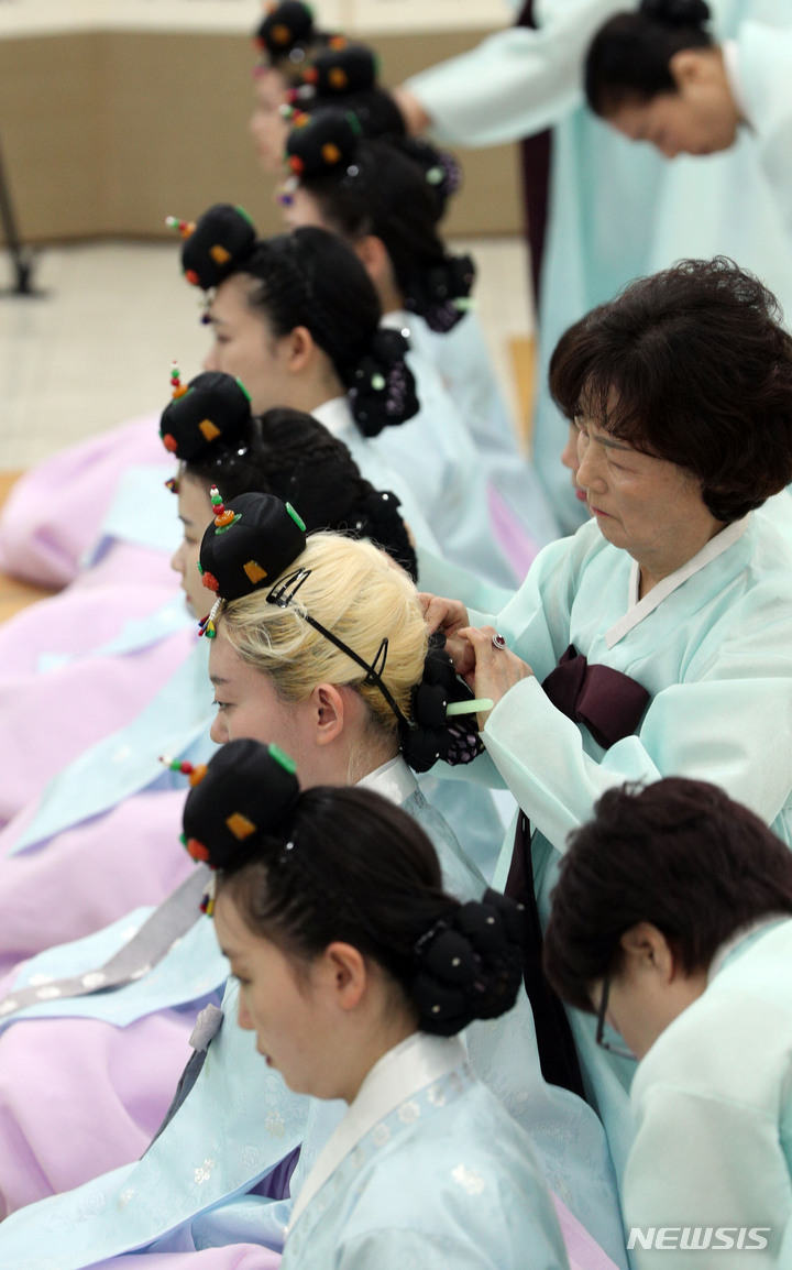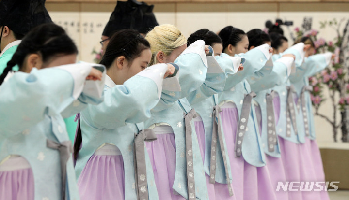 【NEWSIS】「成人の日」を迎えた15日、釜山女性文化会館(釜山市沙上区)の大講堂で伝統成年礼(成人式)が開催された。写真は、韓服姿(韓国の伝統衣装)で伝統的なお辞儀(クンジョル)をする新成人たち。