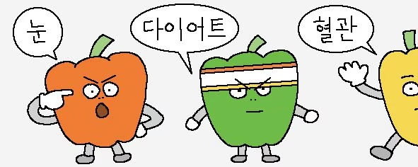 パプリカの体にいいところは色によって違う。赤いパプリカは骨粗しょう症、オレンジ色のパプリカは目や肌の健康、黄色のパプリカは血管疾患、緑色のパプリカはダイエットにいい。