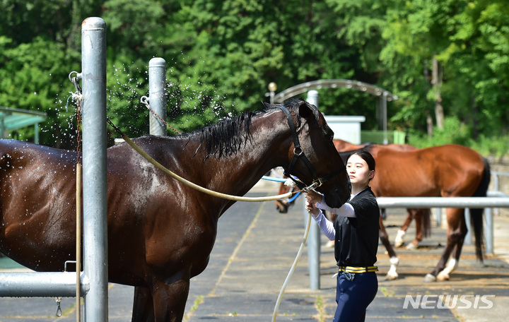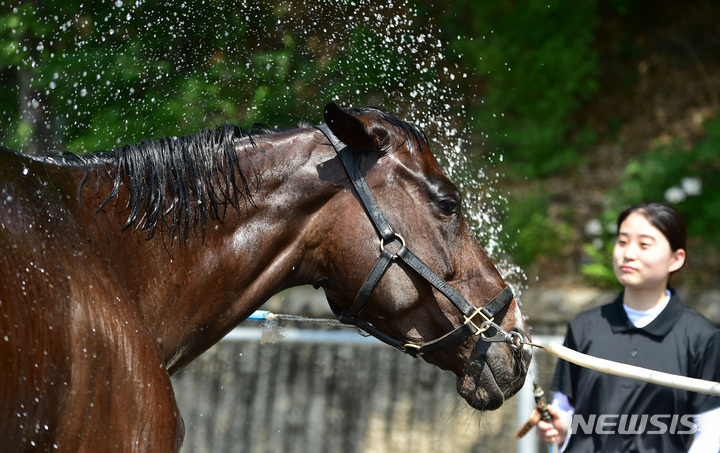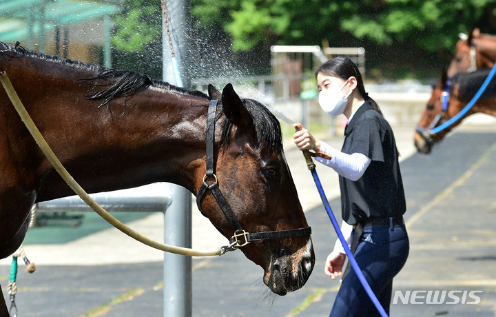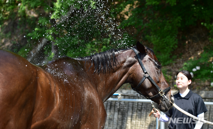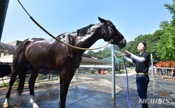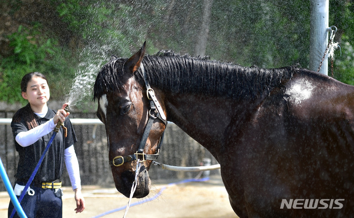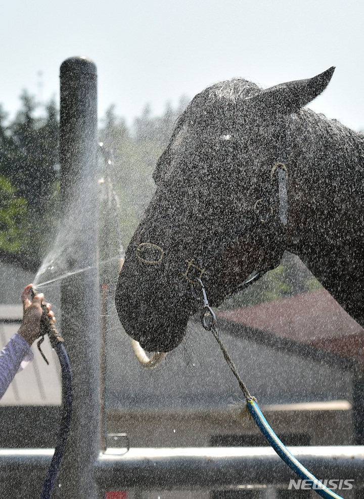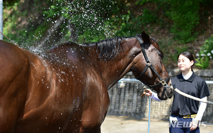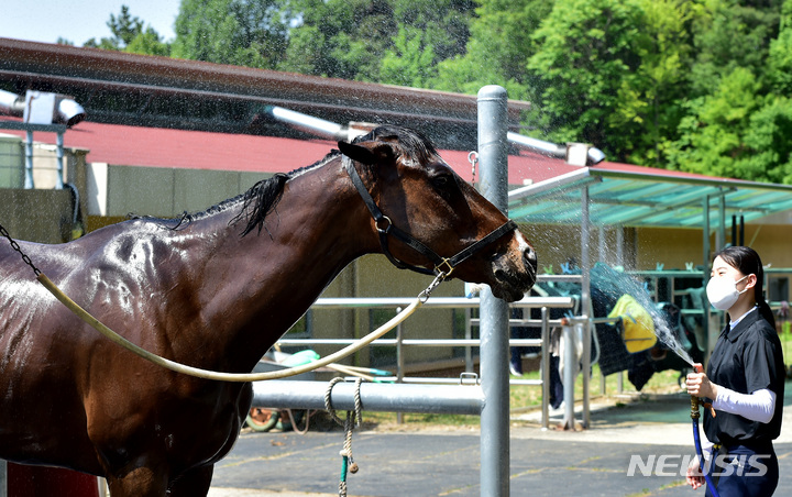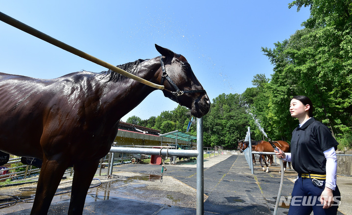 大邱市の昼間の最高気温が32度を超えて初夏の陽気となった16日午後、大邱市達西区大徳乗馬場では、インストラクターが馬に水を掛けて涼ませていた。