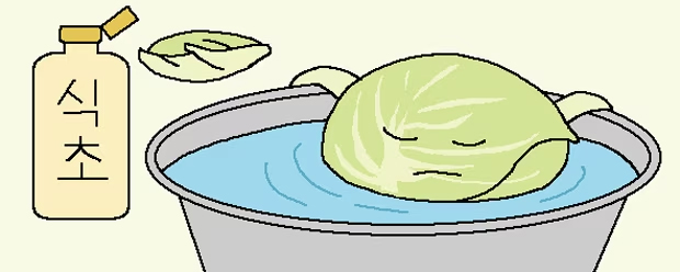キャベツは栽培時に農薬をたくさん使うので、よく洗わなければならない。外側の葉を取り除き、お酢を入れたお湯に10分ほど浸してからよくすすごう。