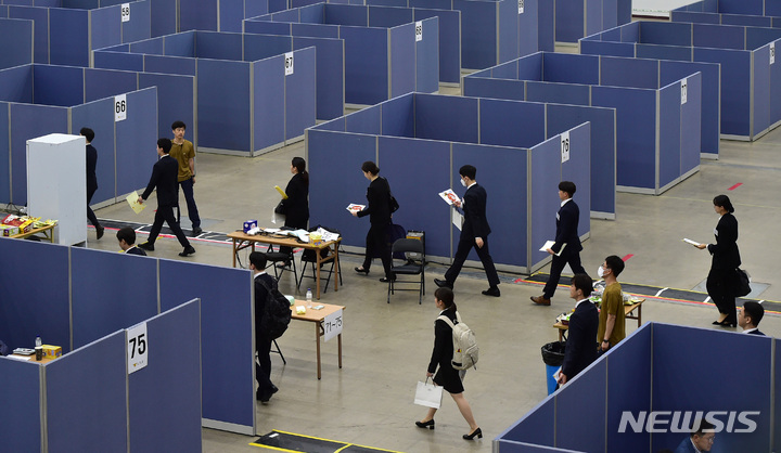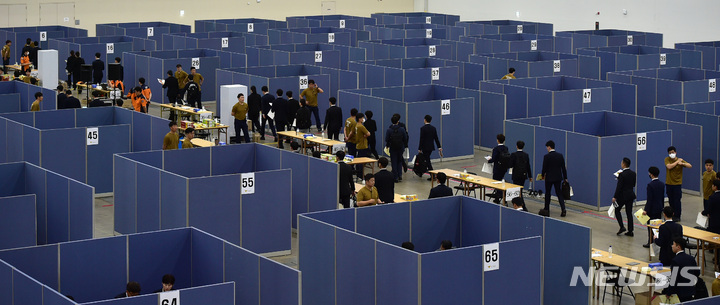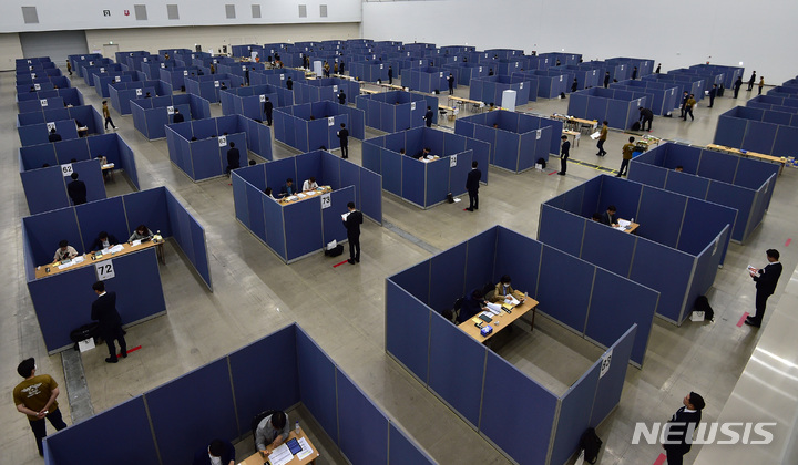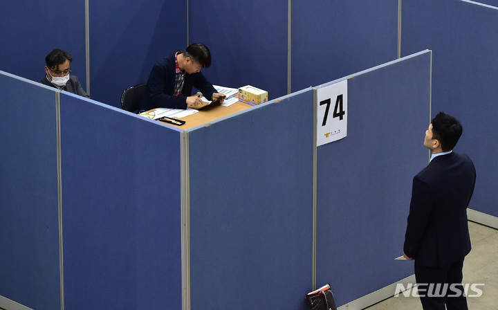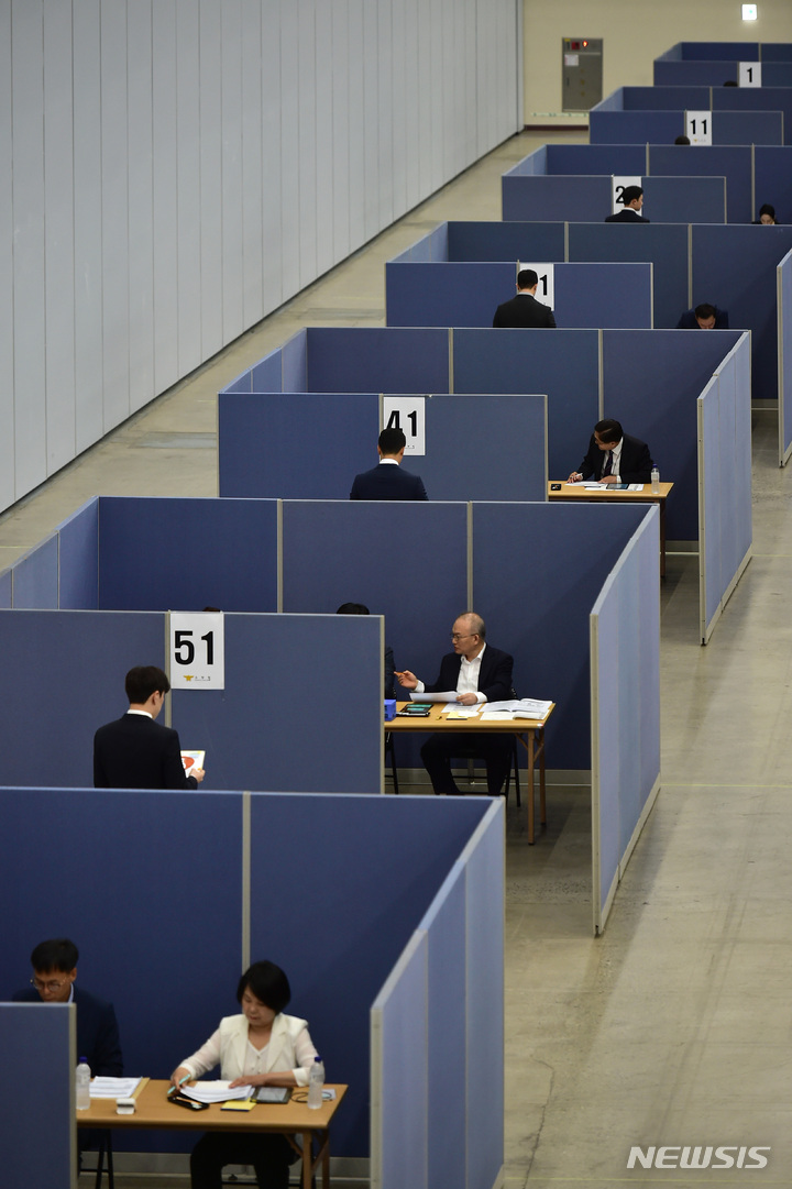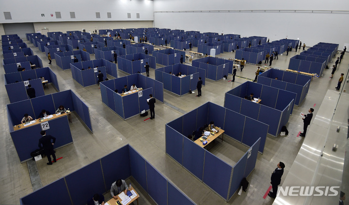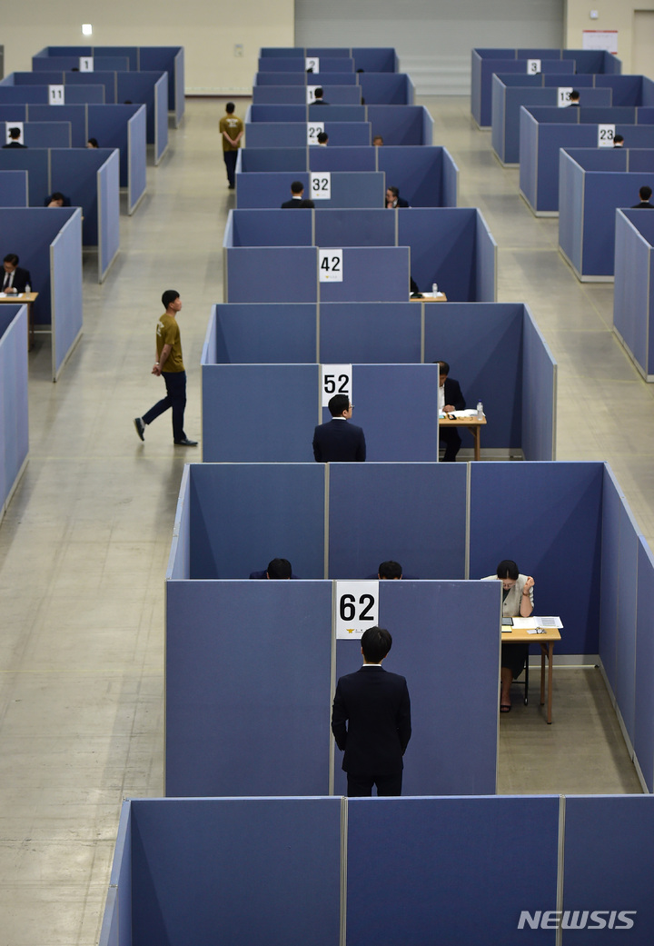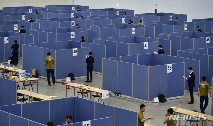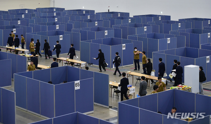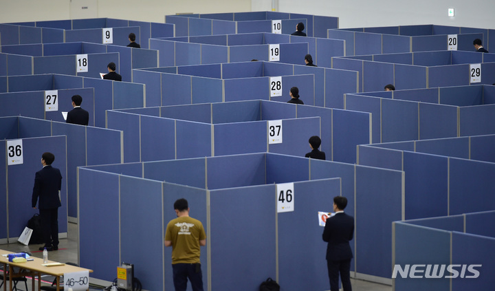 23日午前、大邱市北区のEXCO東館で開催された2023年消防公務員採用面接試験で、受験生たちが面接の準備をしている。
